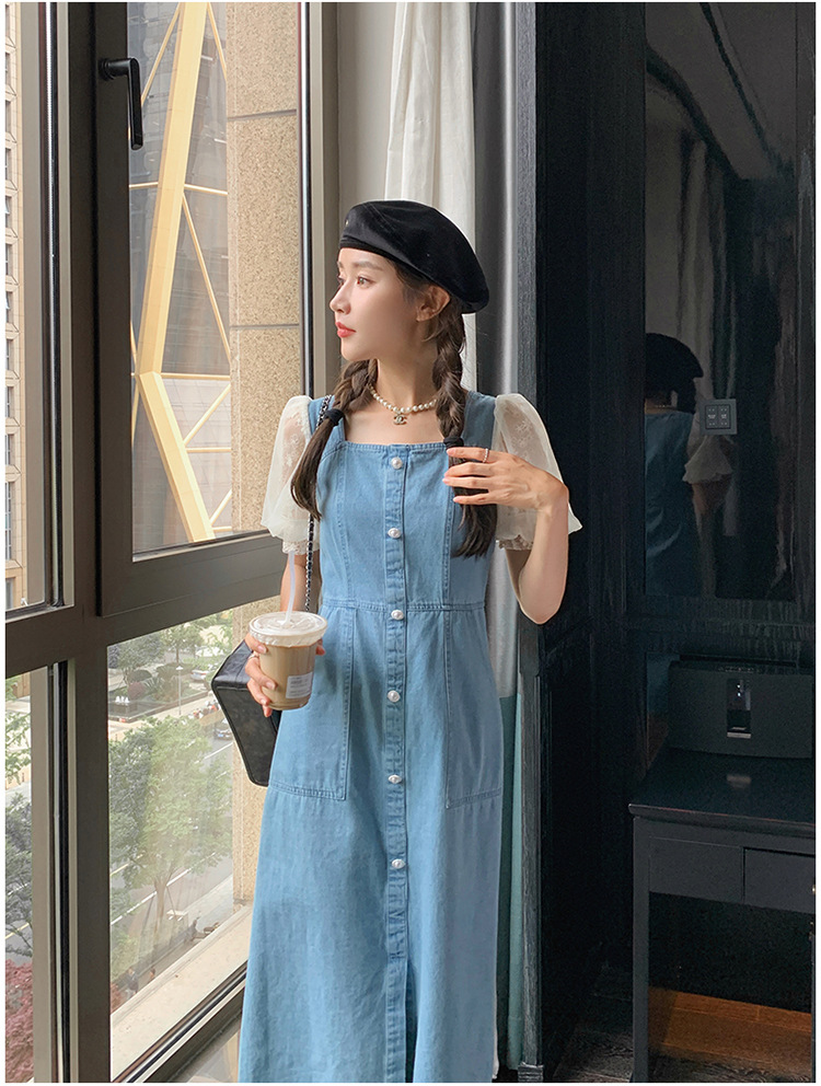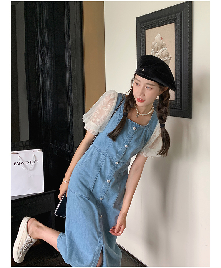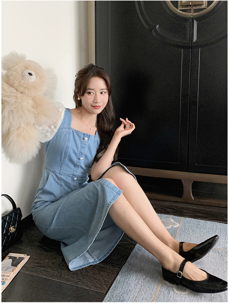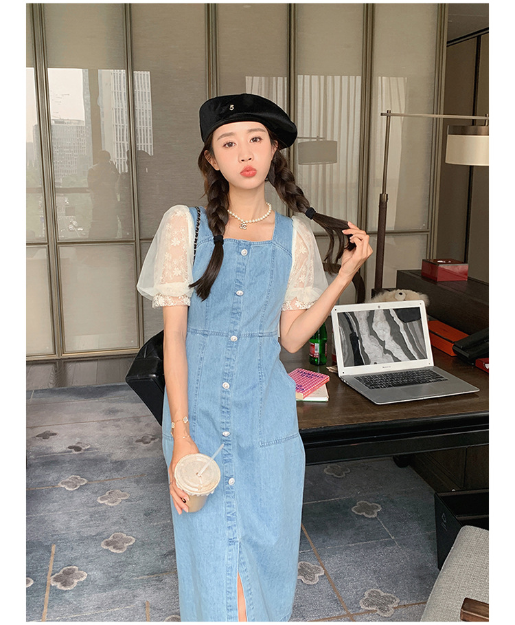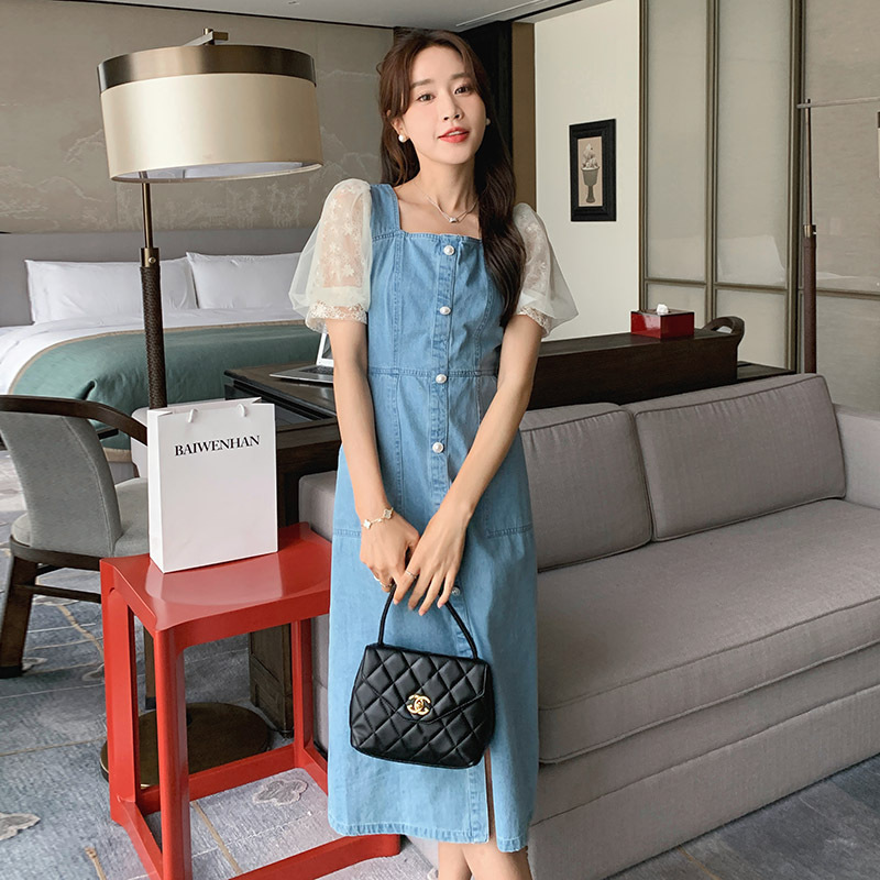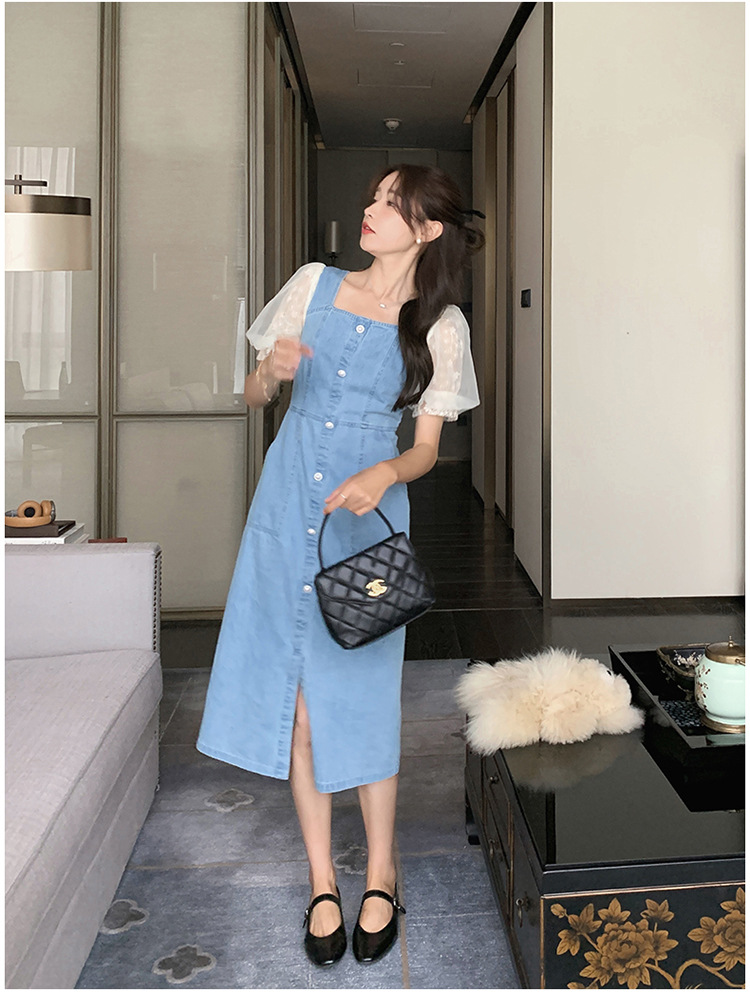 레이스 스티칭 데님 원피스 여자 여름 2025 새로운 타이트 허리 슬리밍 우아한 퍼프 슬리브 스퀘어 칼라 프렌치 롱 원피스스토어 가기