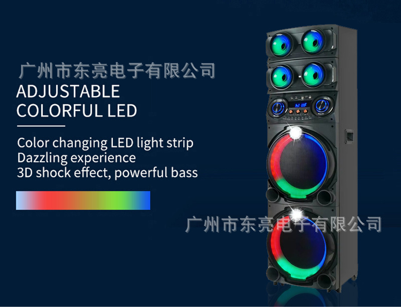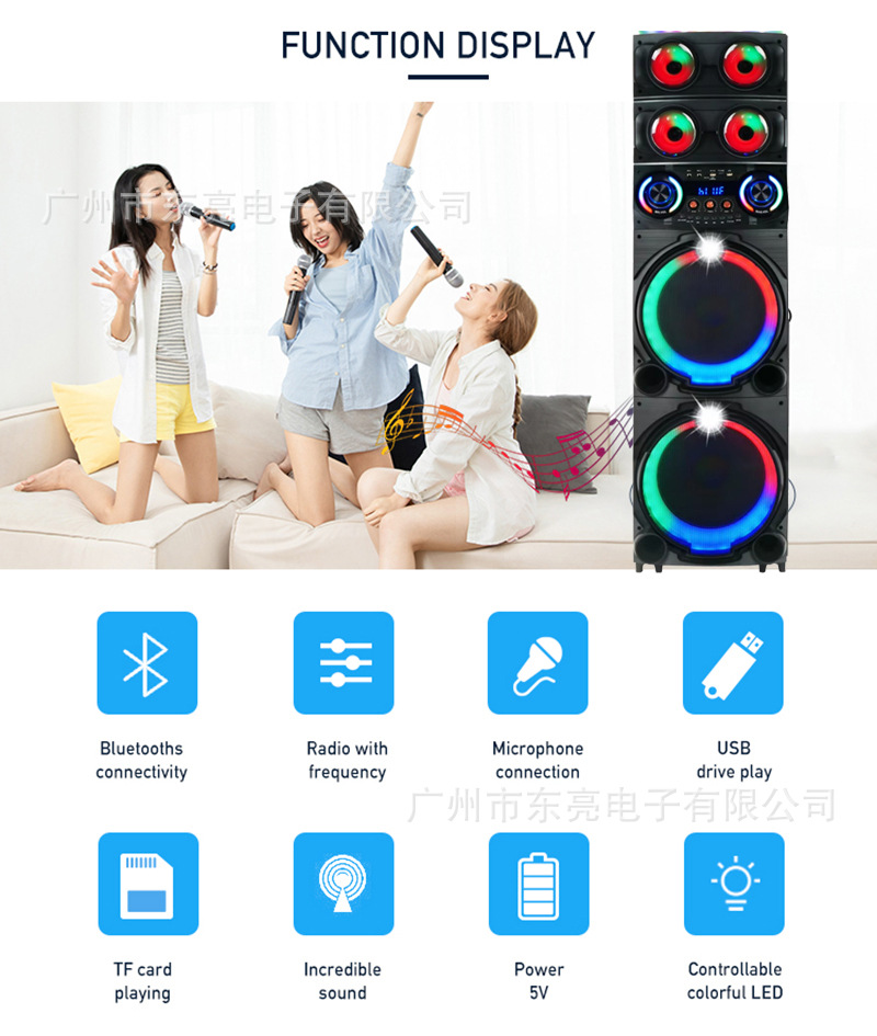 Main functions: Bluetooth, TF card, USB,FM,AUX,TWS,MIC, Remote control, dual wireless microphones, ECHO, TREBLE, EQ, BASS, RGB lighting, top stage light beads