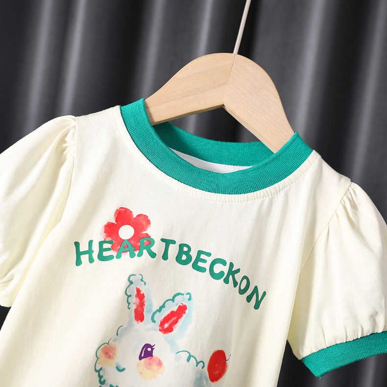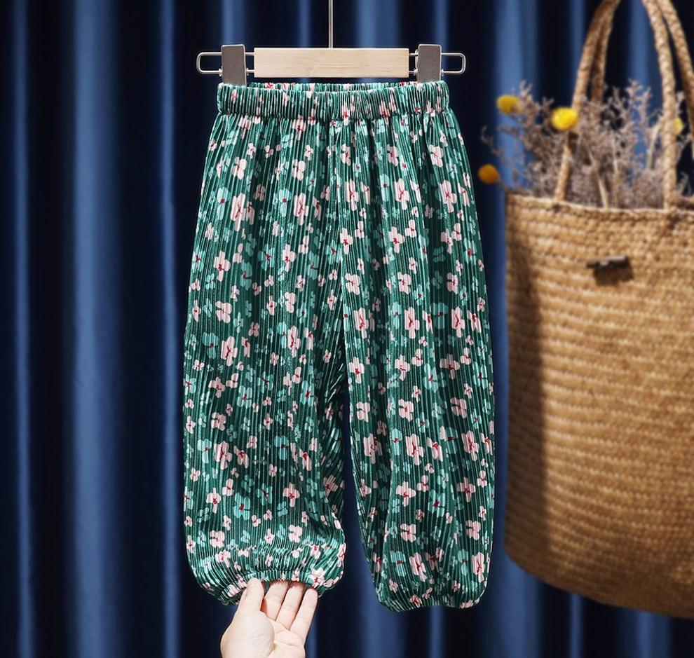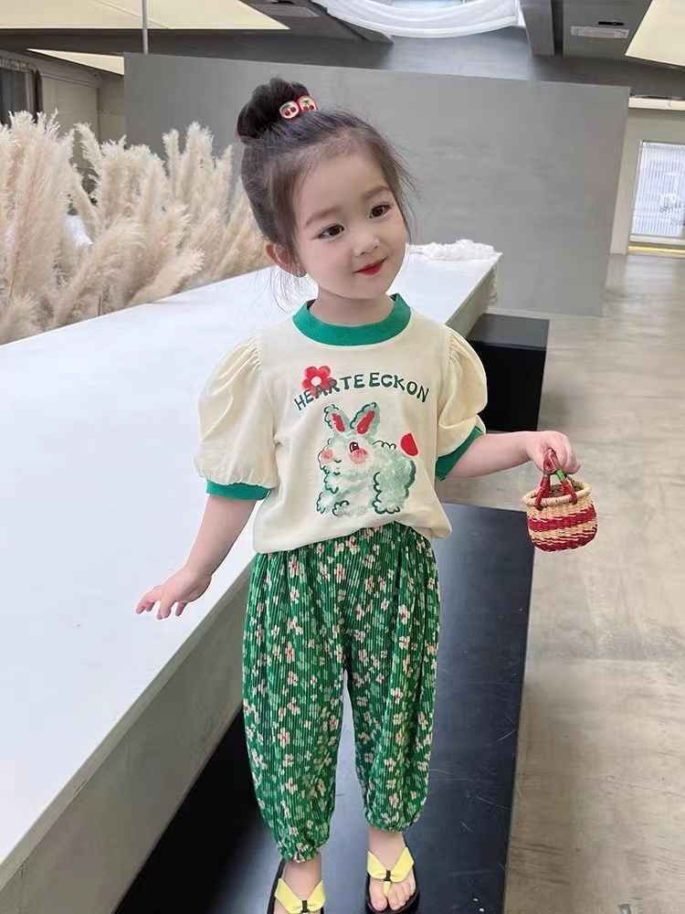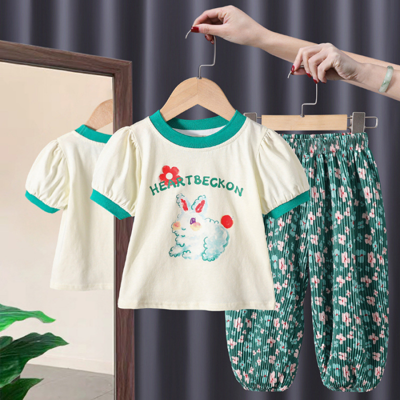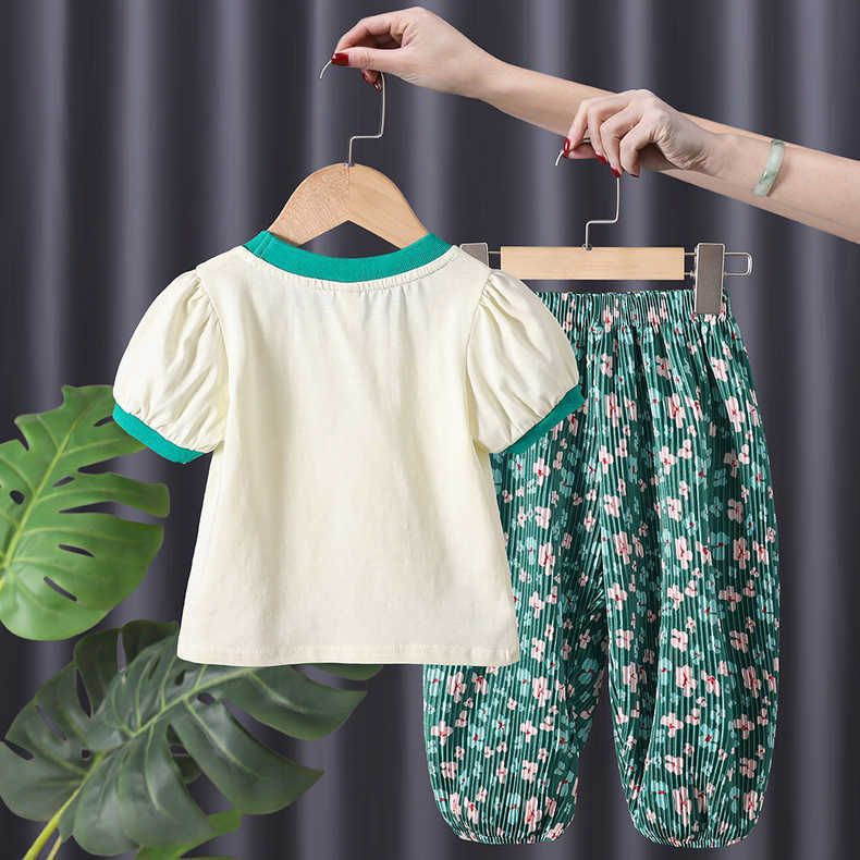 여자 세트 패션 서양식 여름 새로운 유행 어린이 반팔 티셔츠 투피스 세트 아기 소녀 안티 모기 바지 여름 착용스토어 가기
