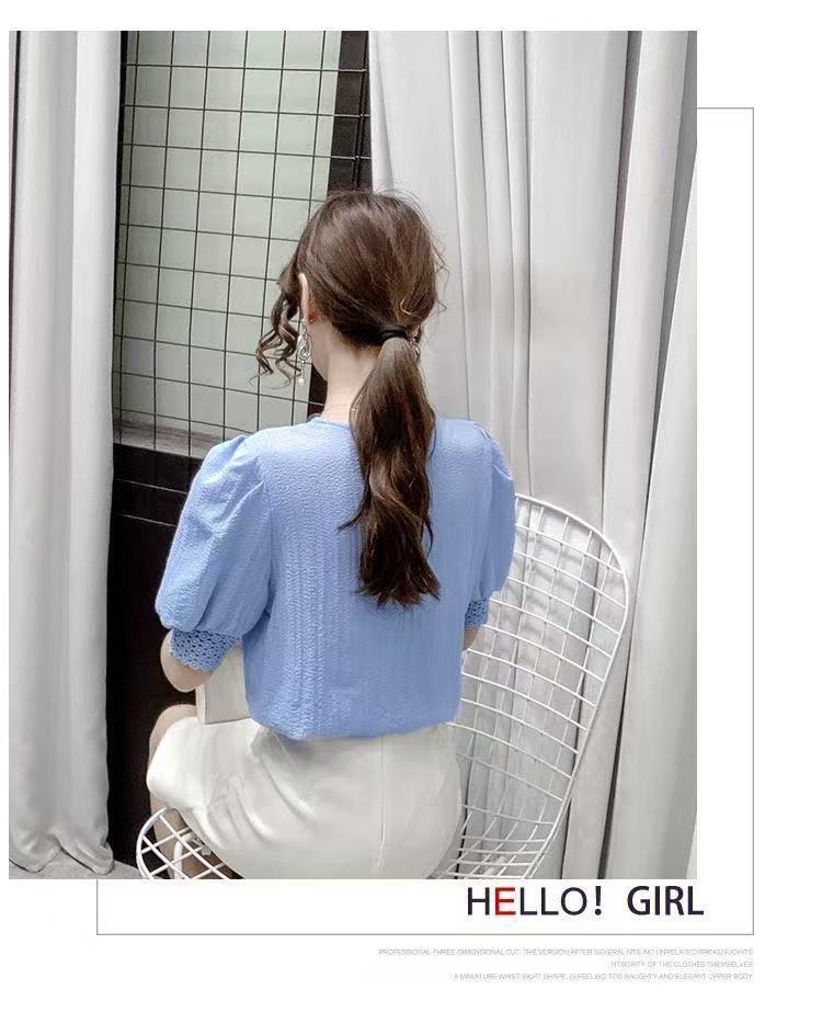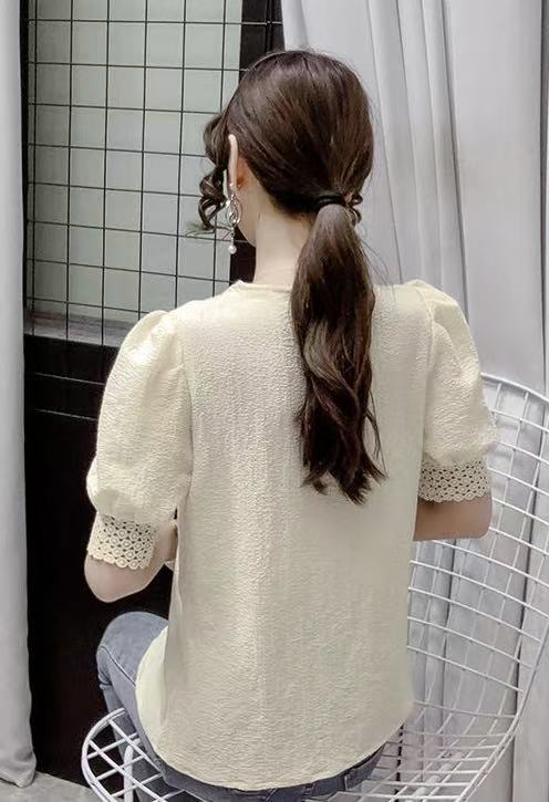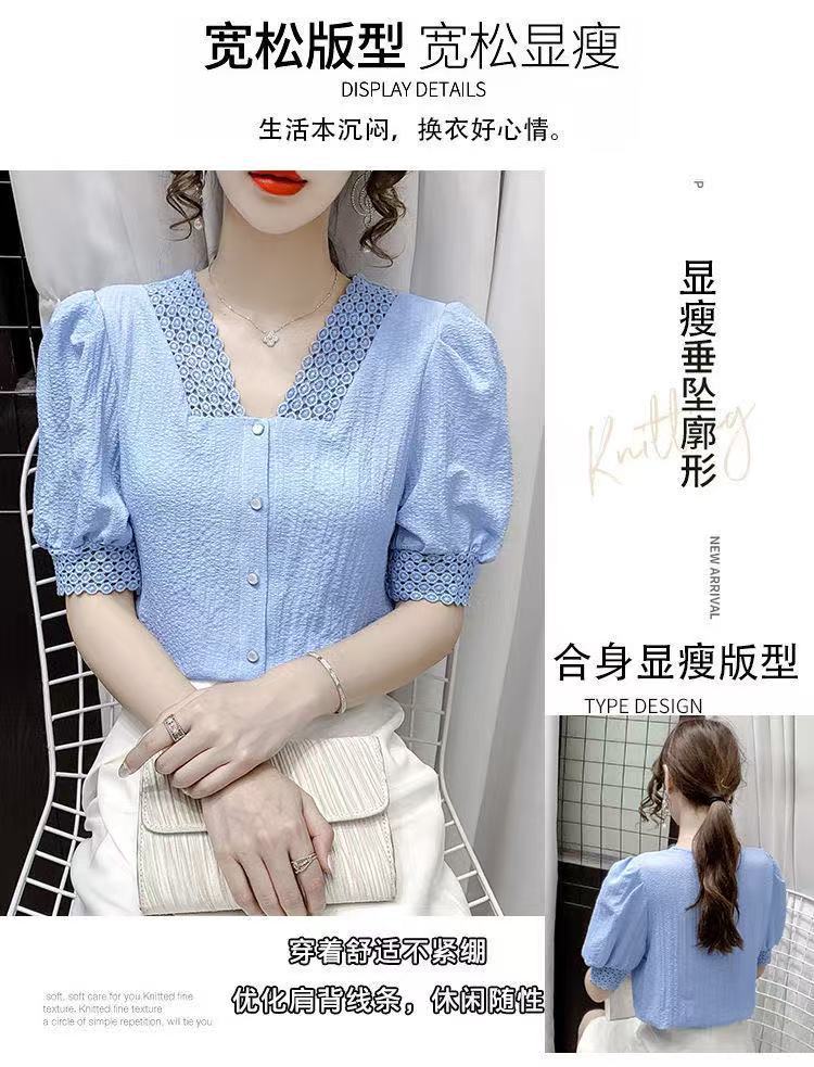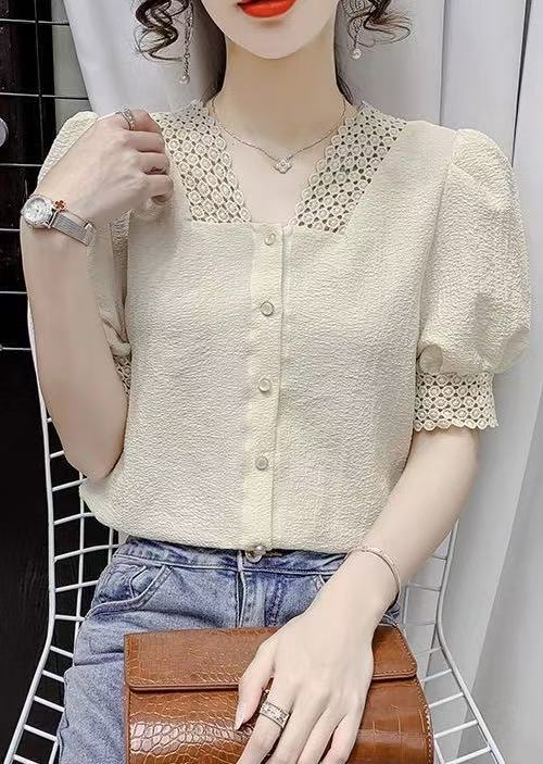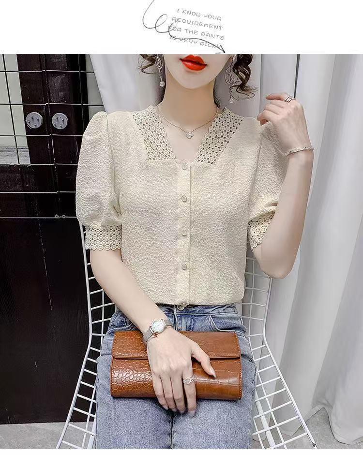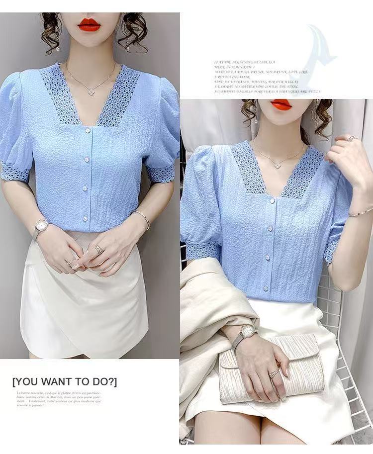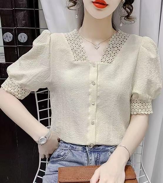 2025 할로우 레이스 V-Neck 디자인 틈새 셔츠 여성용 여름 얇은 반소매 프랑스 스위트 쉬폰 탑스토어 가기
