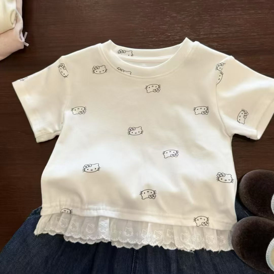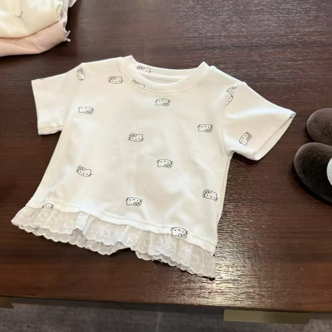 여자 여름 세트 어린 소녀 반팔 2025 새로운 어린이 한국 스타일 서양식 KT 고양이 반팔 T 레이스