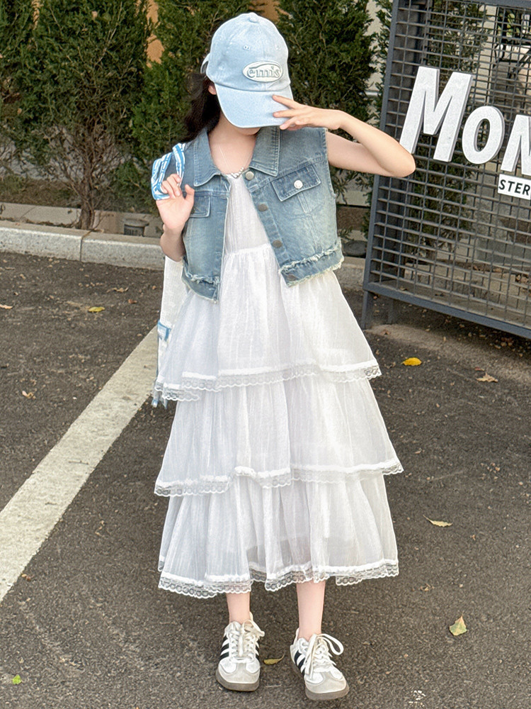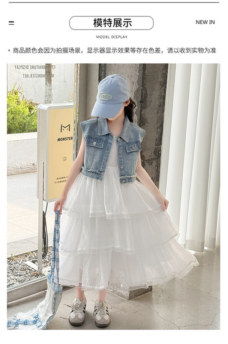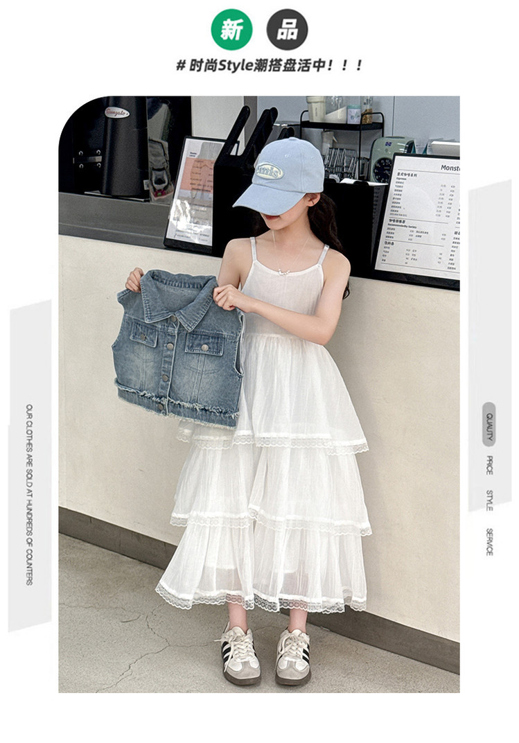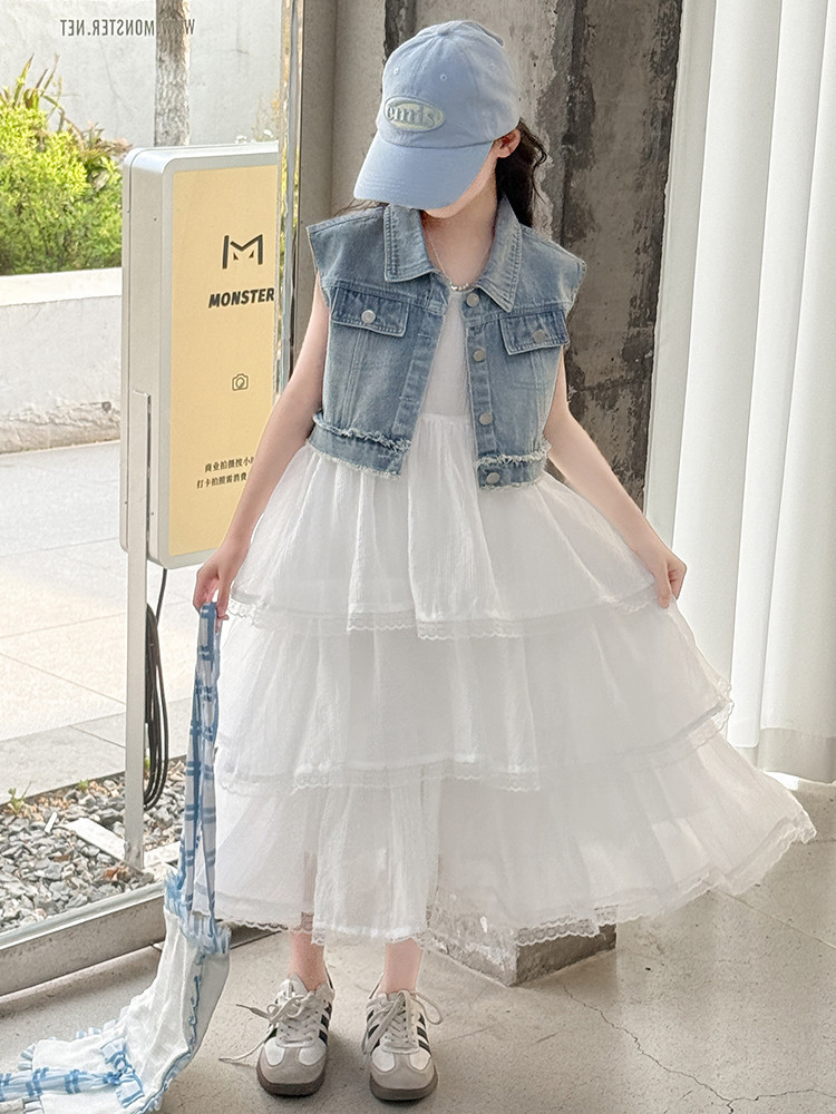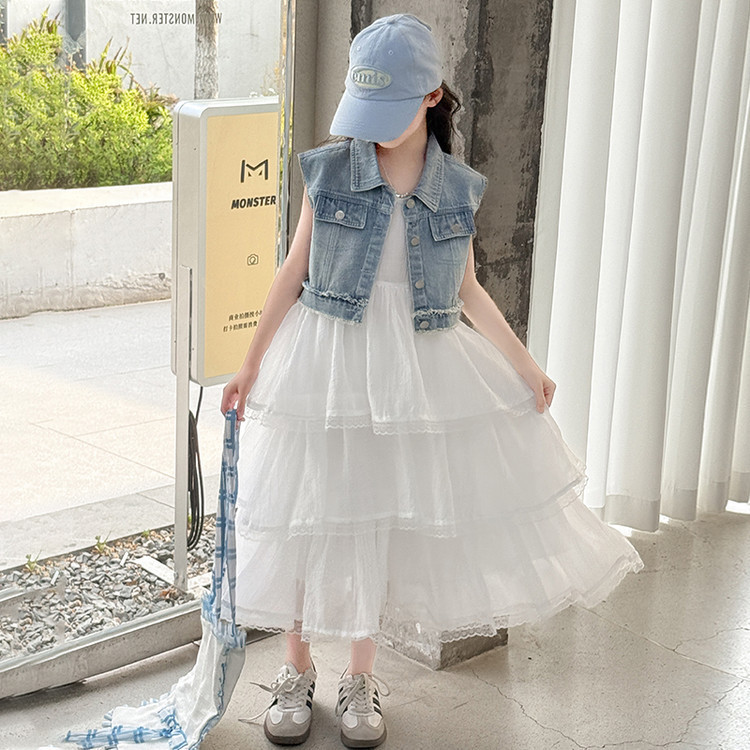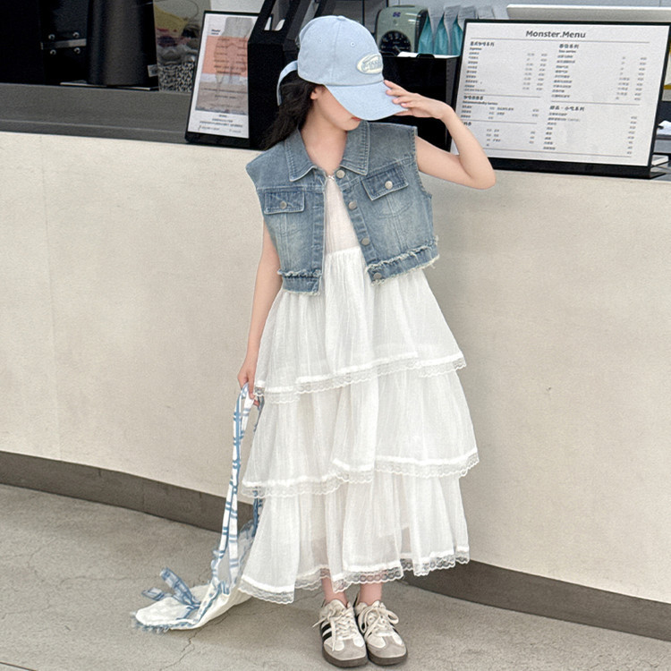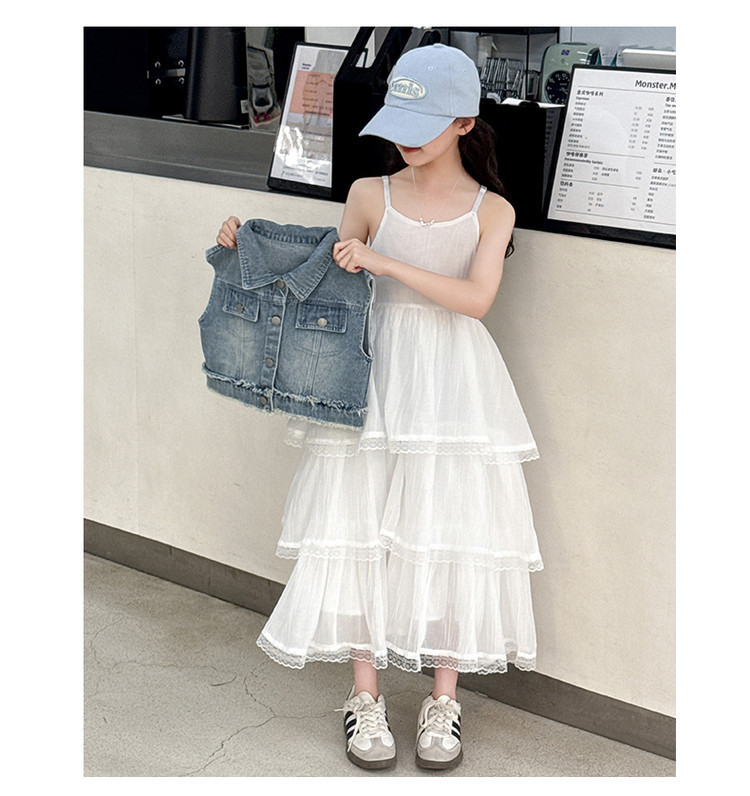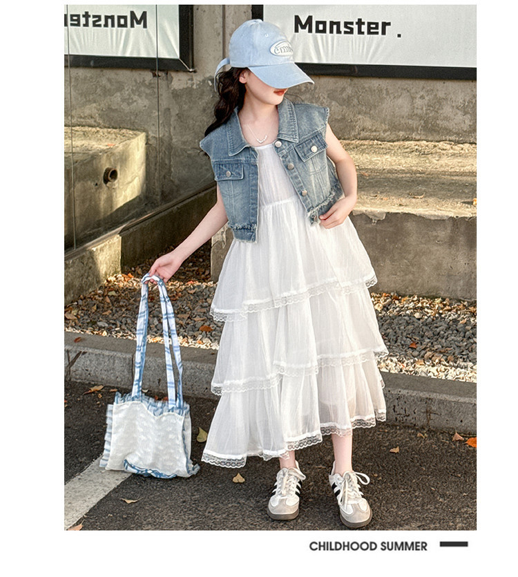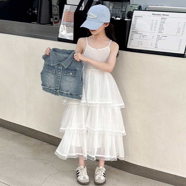 오렌지 타이거 걸스 여름 원피스 2025 새로운 소녀 달콤한 슬링 케이크 스커트 공주 원사 스커트 데님 말스토어 가기