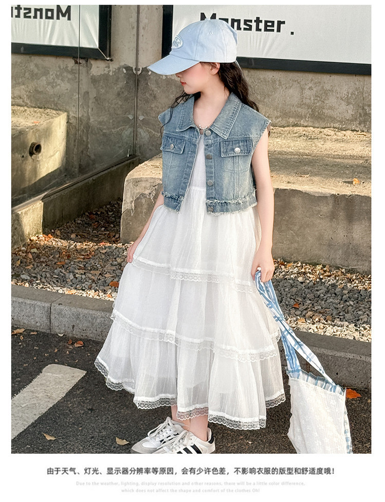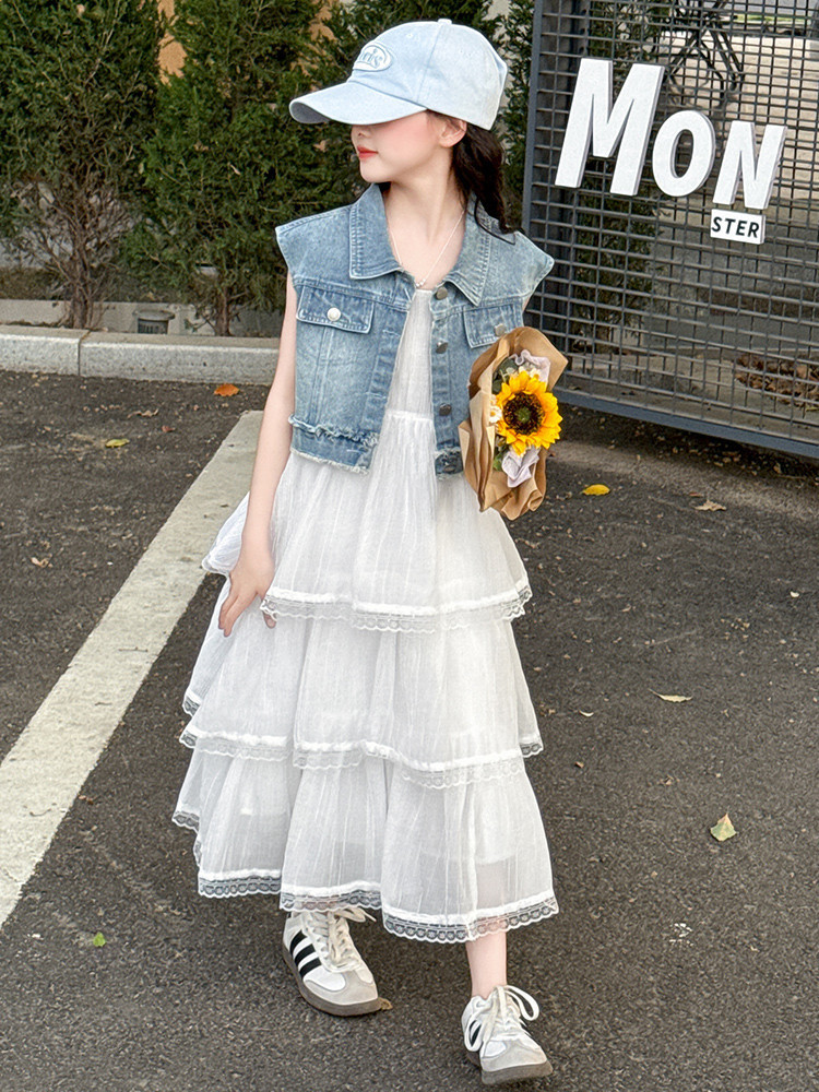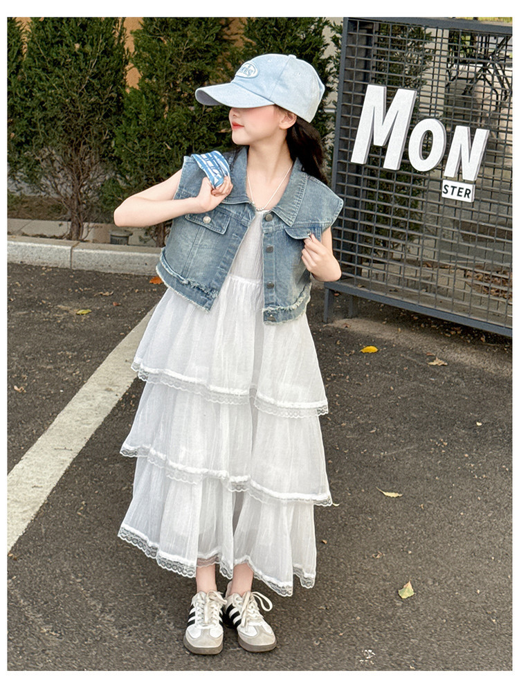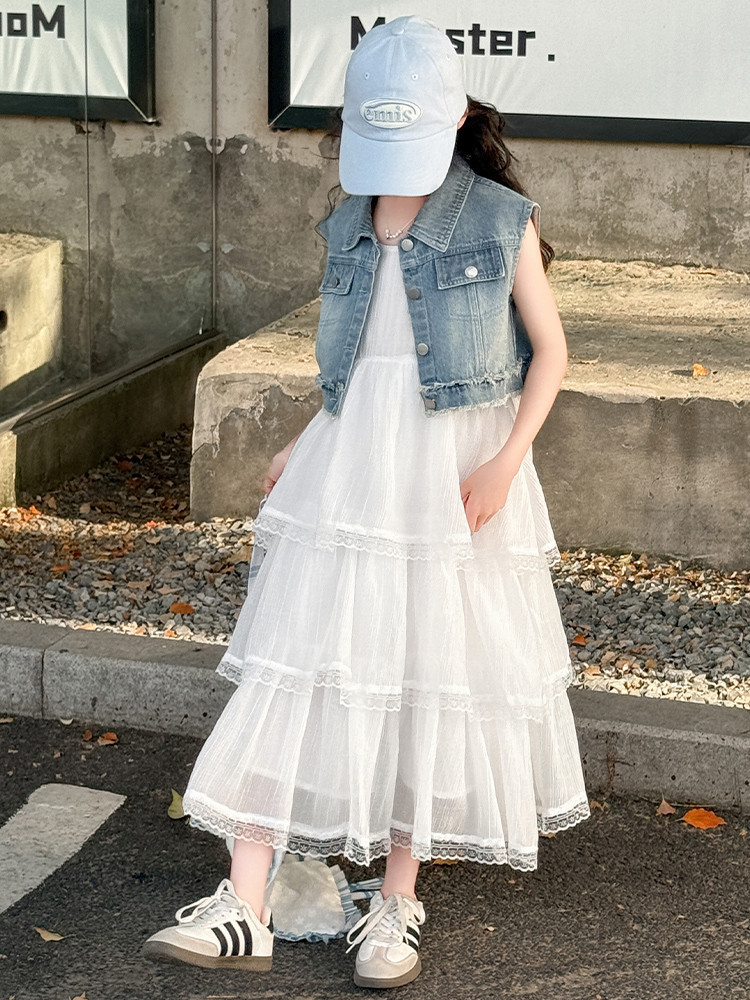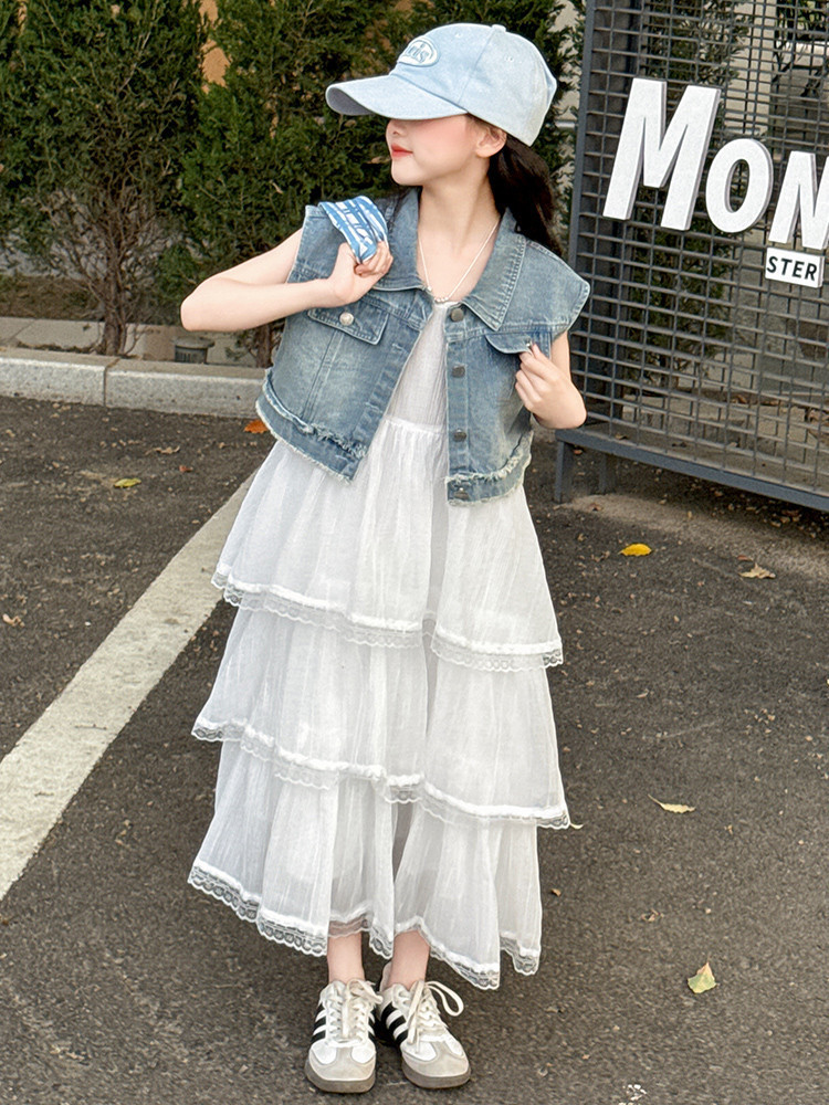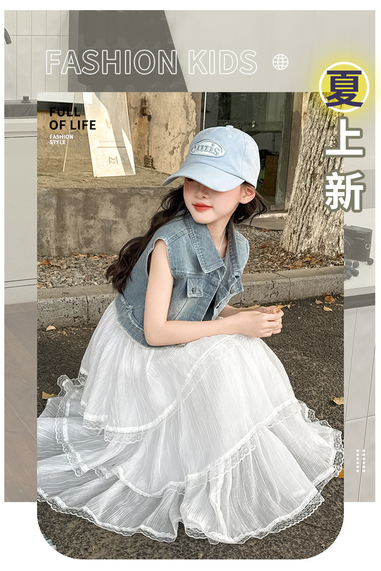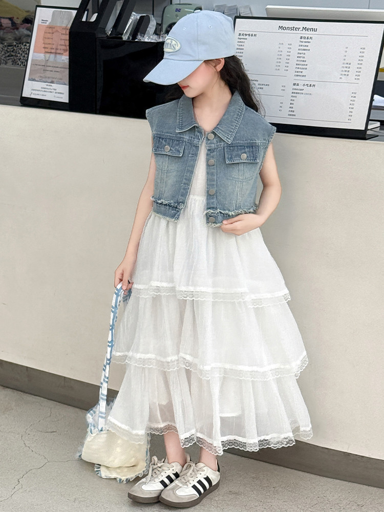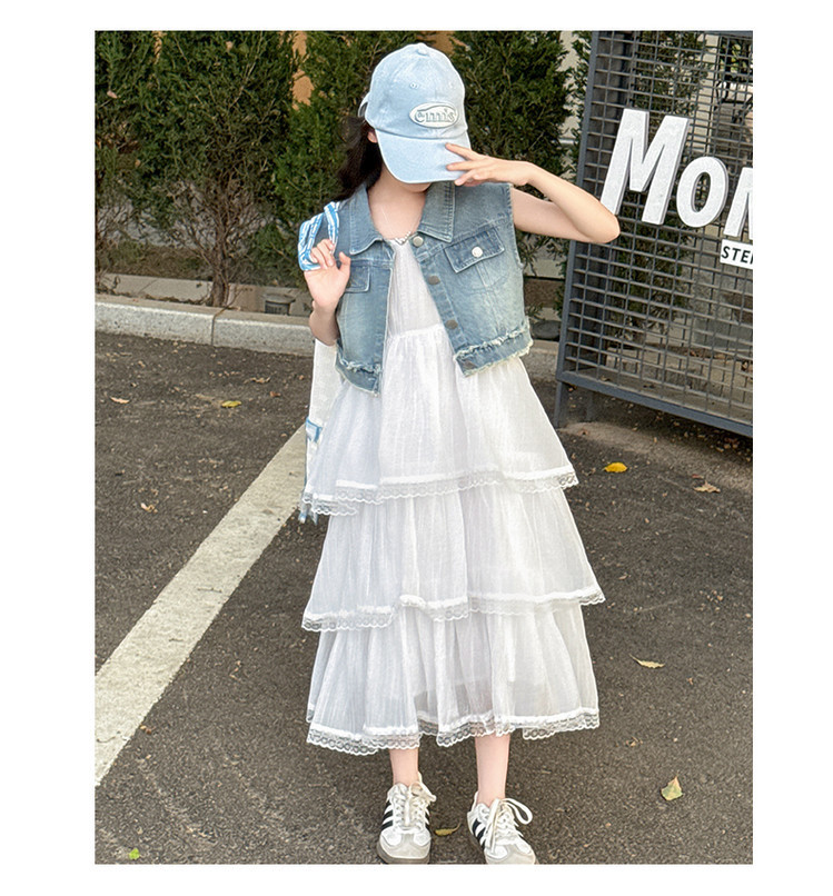 오렌지 타이거 걸스 여름 원피스 2025 새로운 소녀 달콤한 슬링 케이크 스커트 공주 원사 스커트 데님 말스토어 가기
