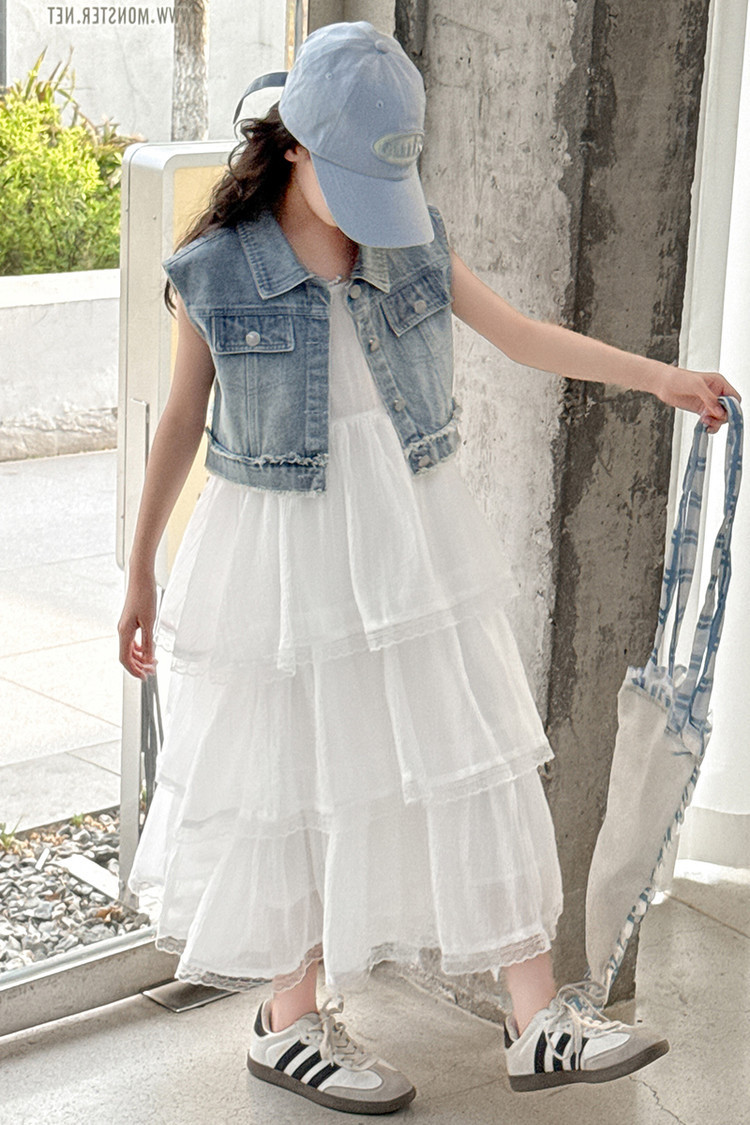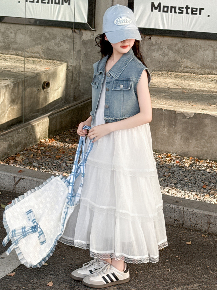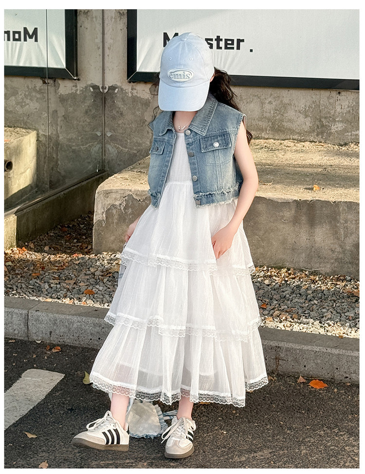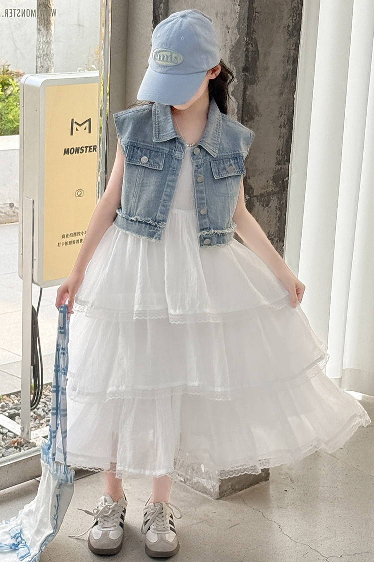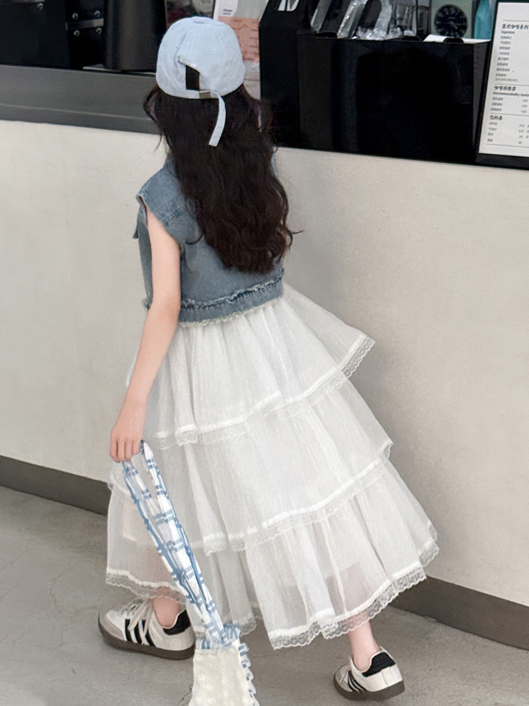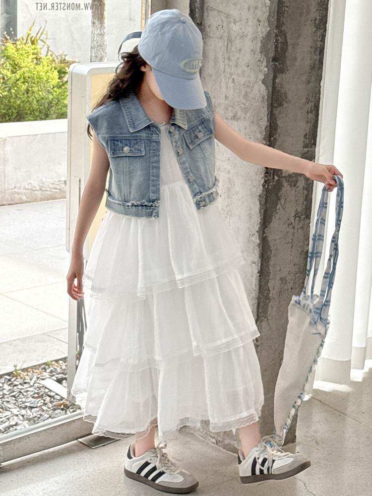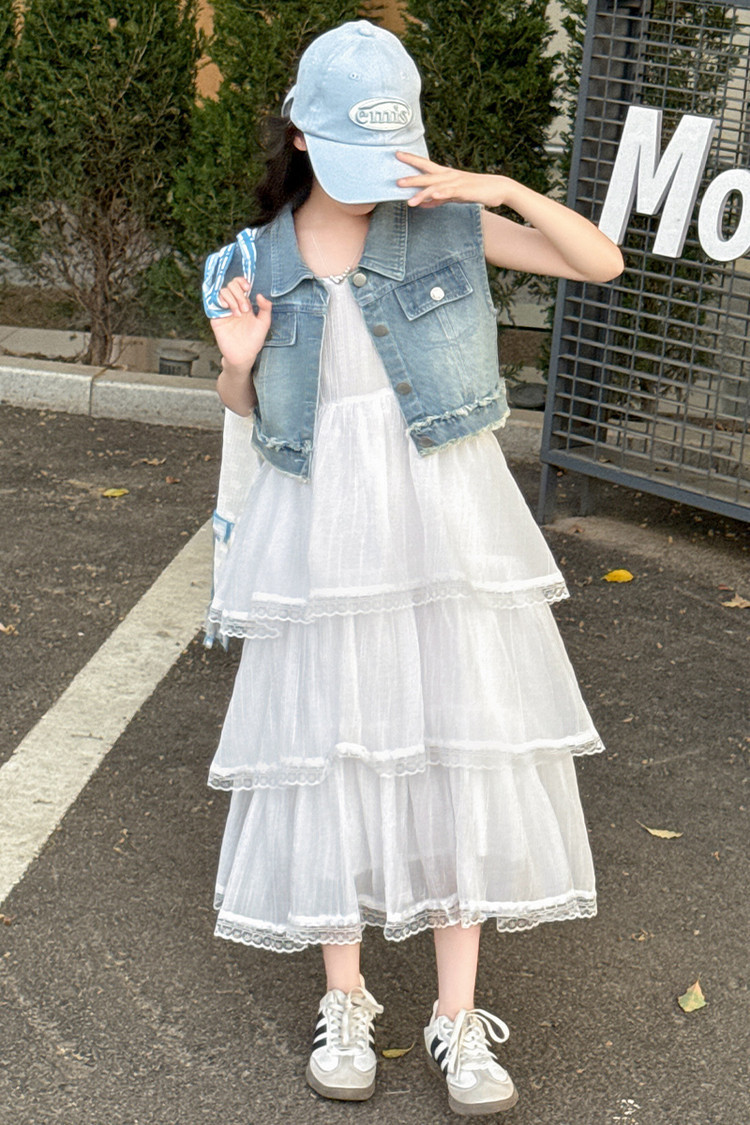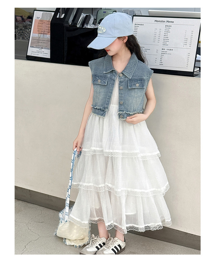 오렌지 타이거 걸스 여름 원피스 2025 새로운 소녀 달콤한 슬링 케이크 스커트 공주 원사 스커트 데님 말스토어 가기