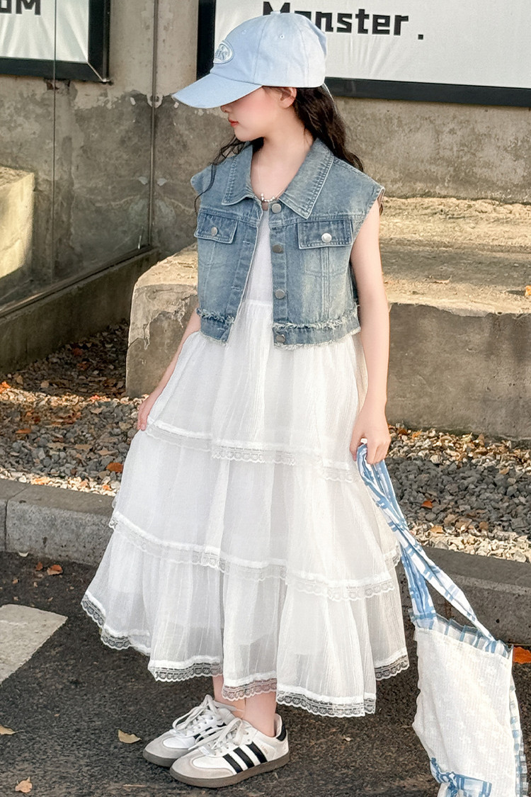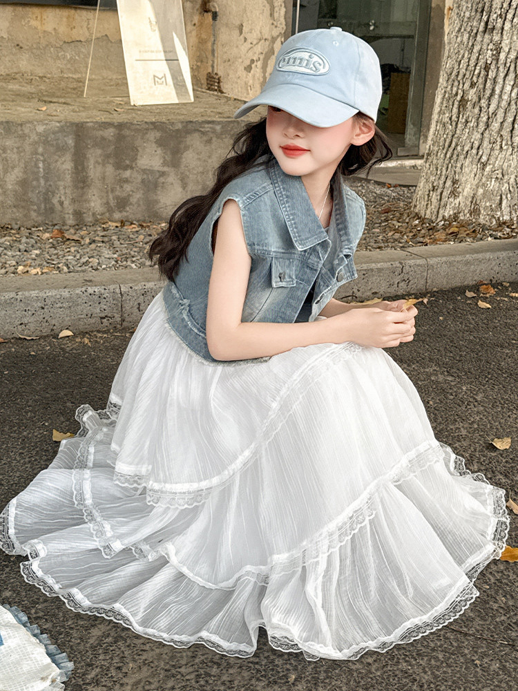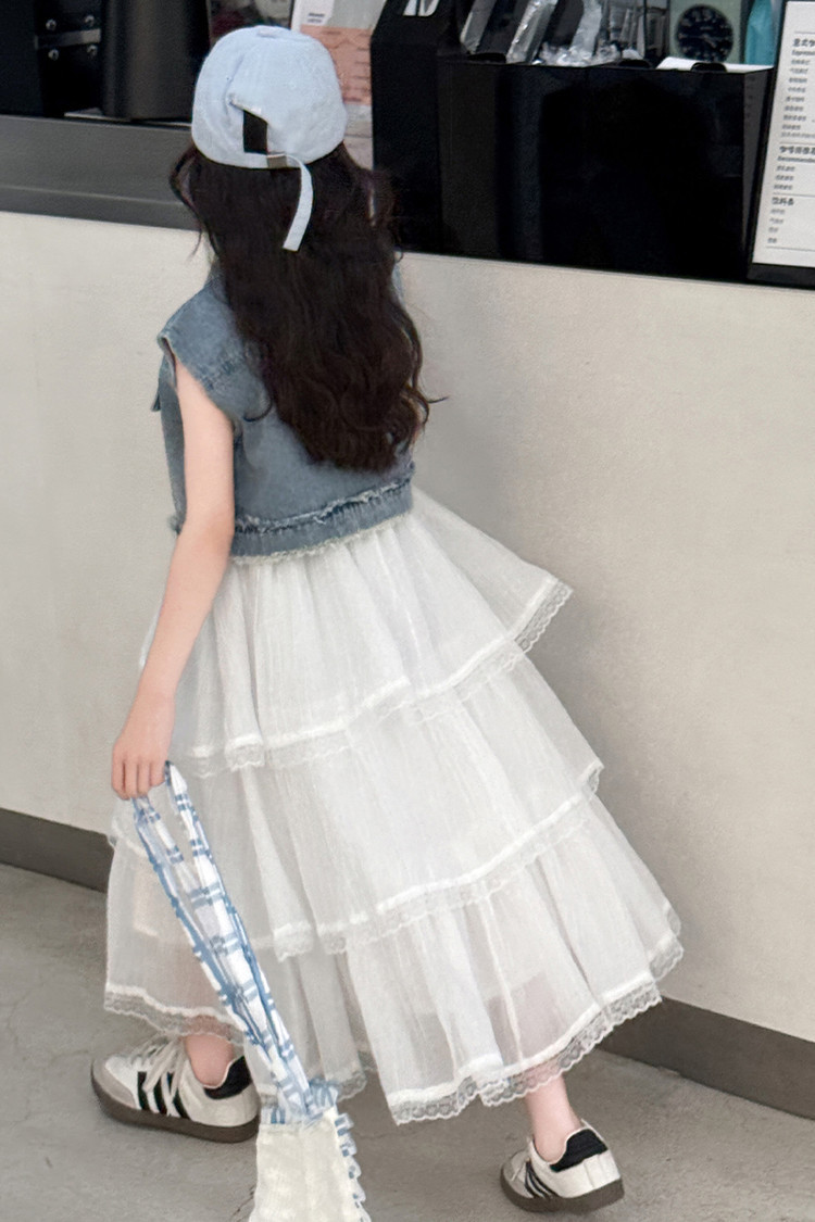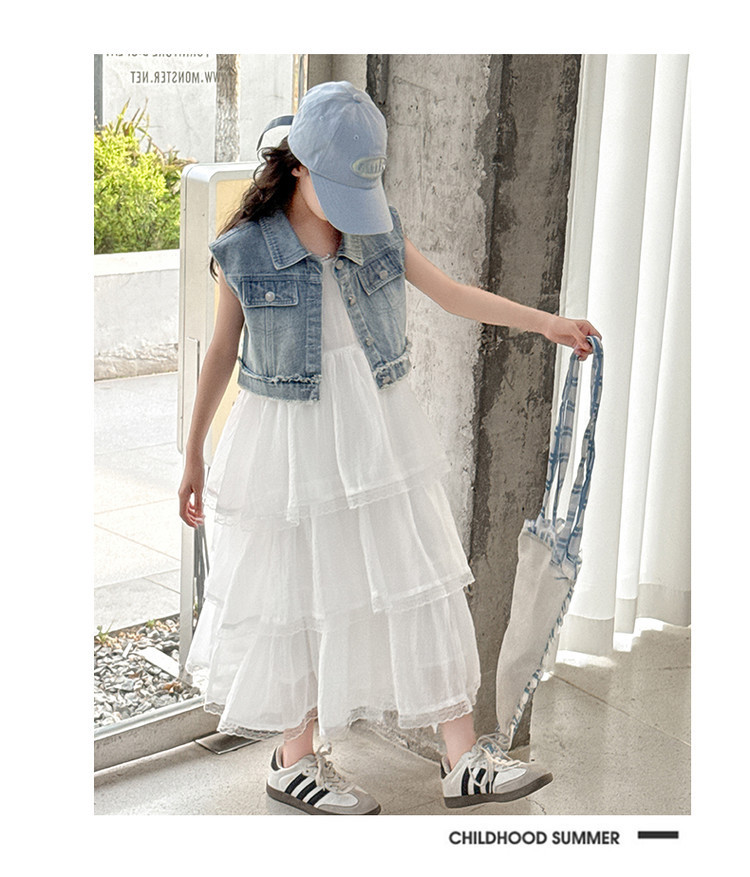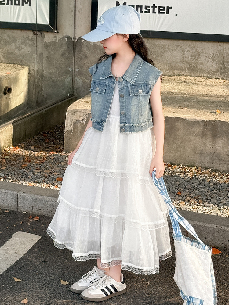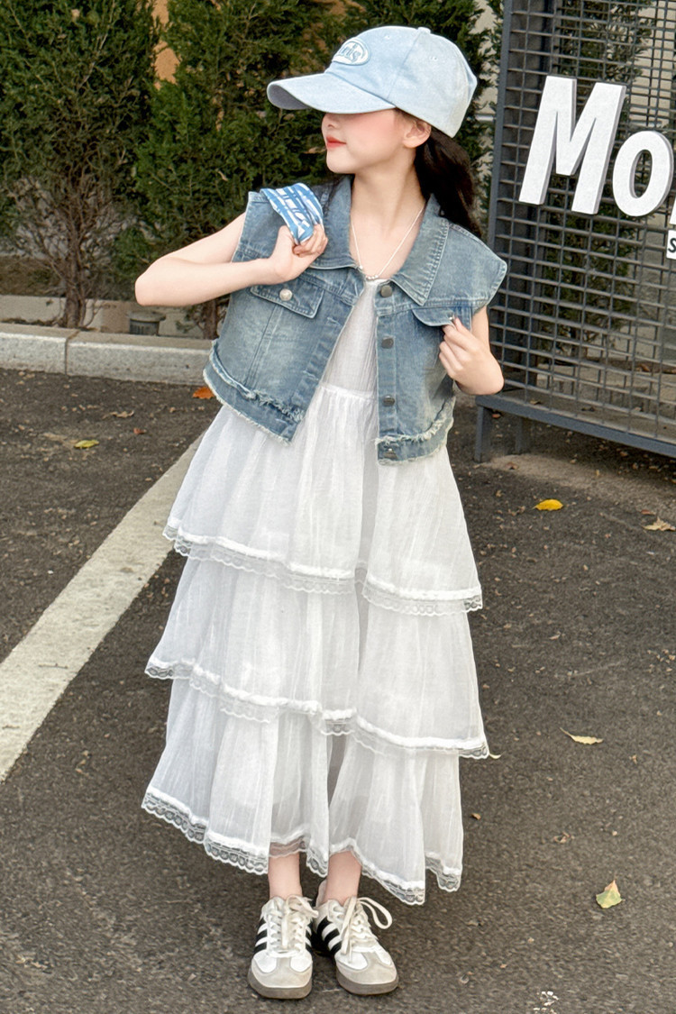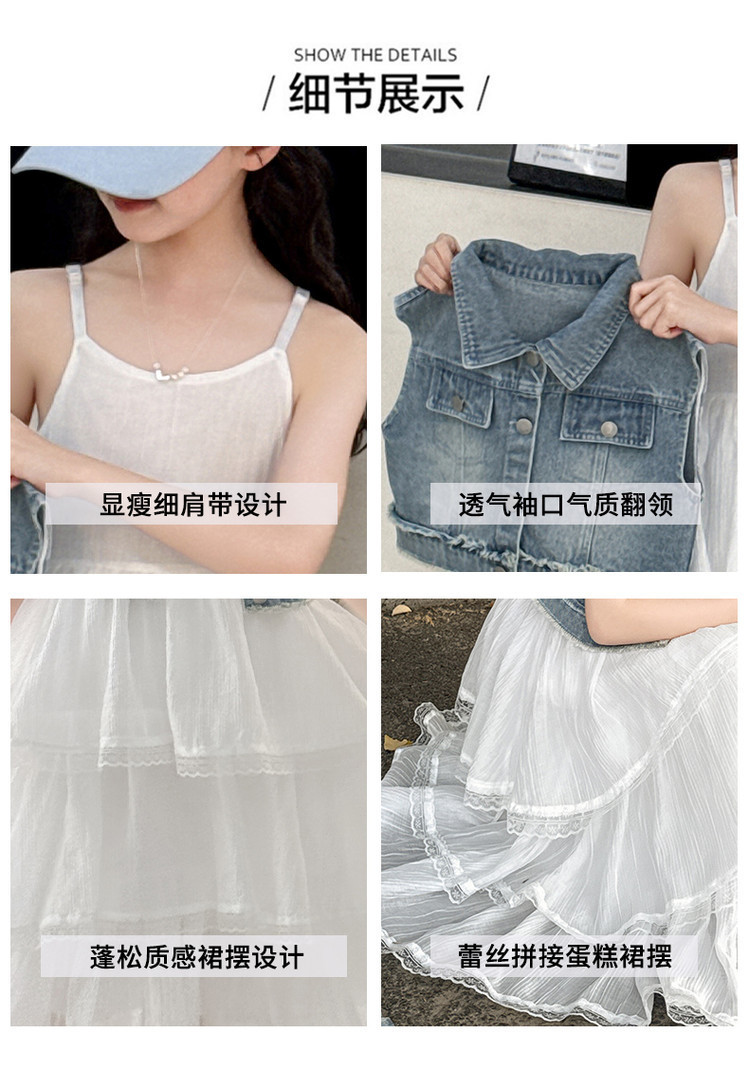 오렌지 타이거 걸스 여름 원피스 2025 새로운 소녀 달콤한 슬링 케이크 스커트 공주 원사 스커트 데님 말스토어 가기