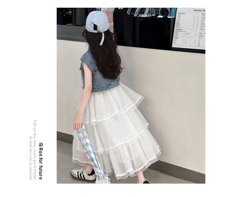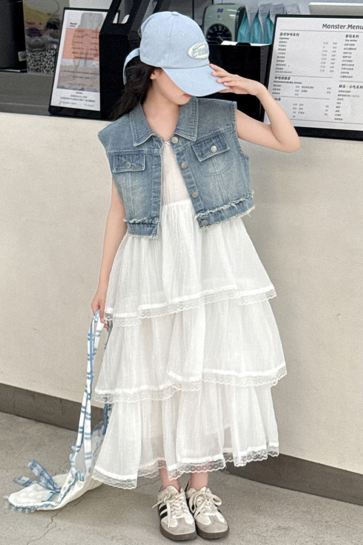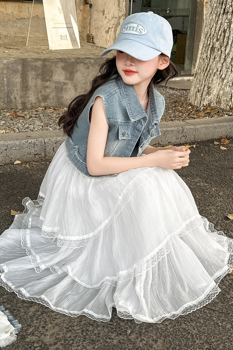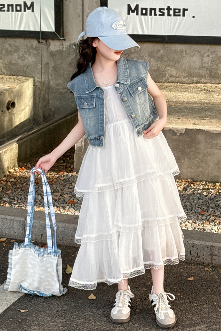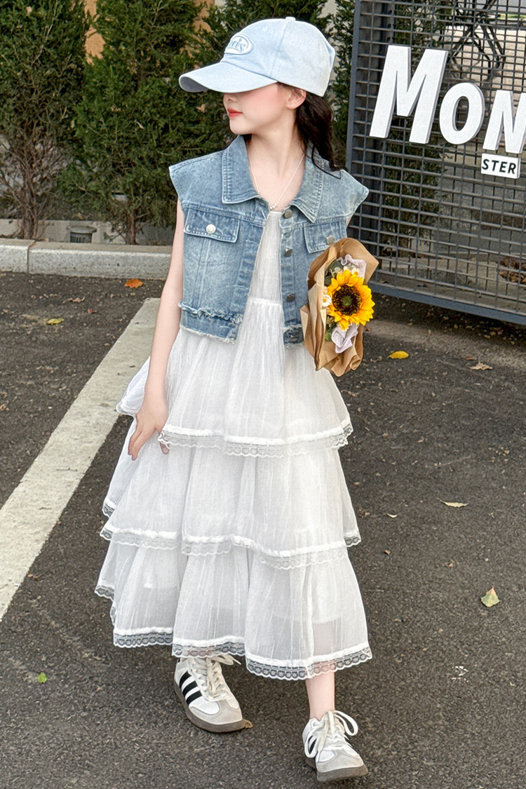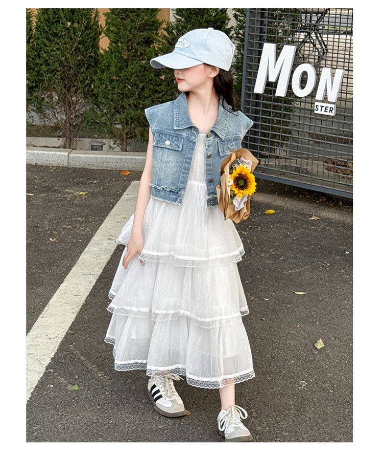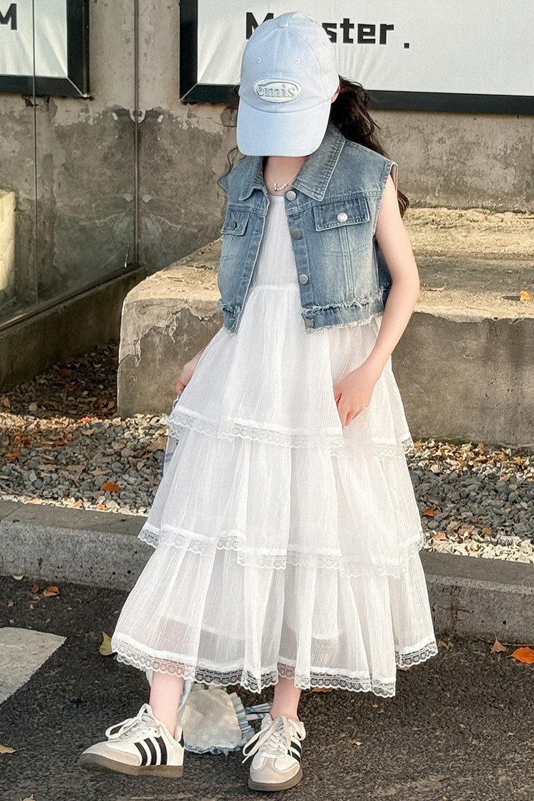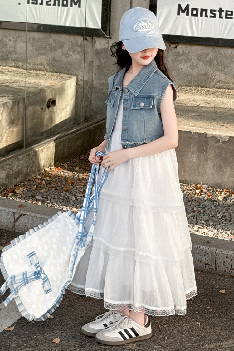 오렌지 타이거 걸스 여름 원피스 2025 새로운 소녀 달콤한 슬링 케이크 스커트 공주 원사 스커트 데님 말스토어 가기