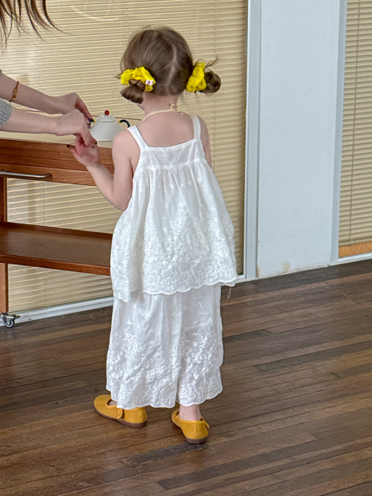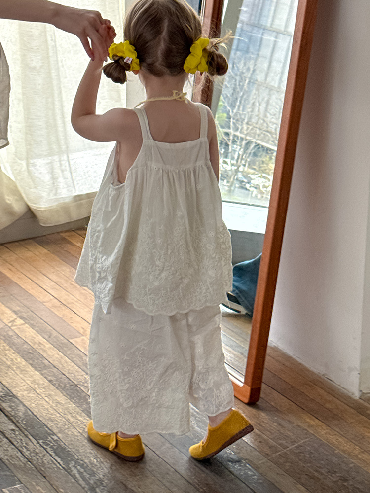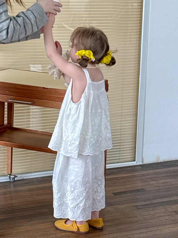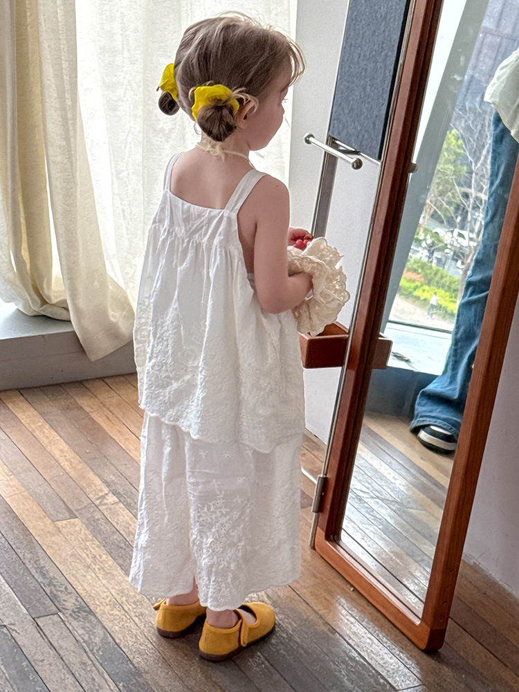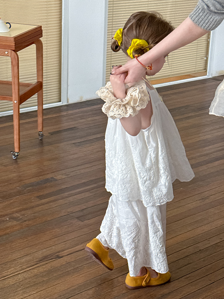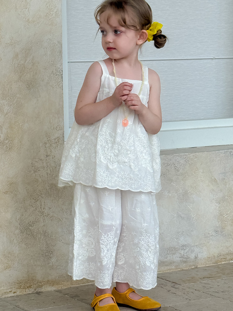 어린이 레이스 슬링 세트 2025 여름 새 한국 스타일 소녀 자수 레이스 코튼 투피스 세트스토어 가기