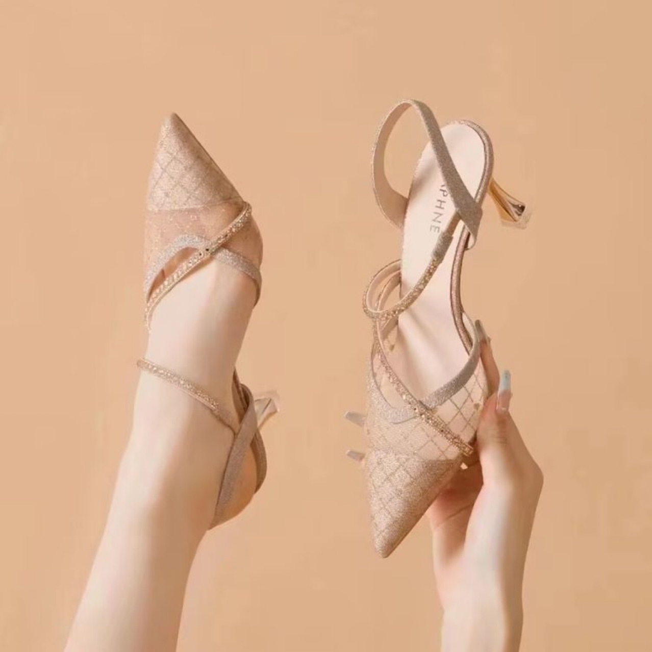 여성을위한 하이힐 샌들 2024 여름 새 스타일 소녀 스커트 라인 석 뾰족한 메쉬 패션 다목적 스틸레토 여성 신발