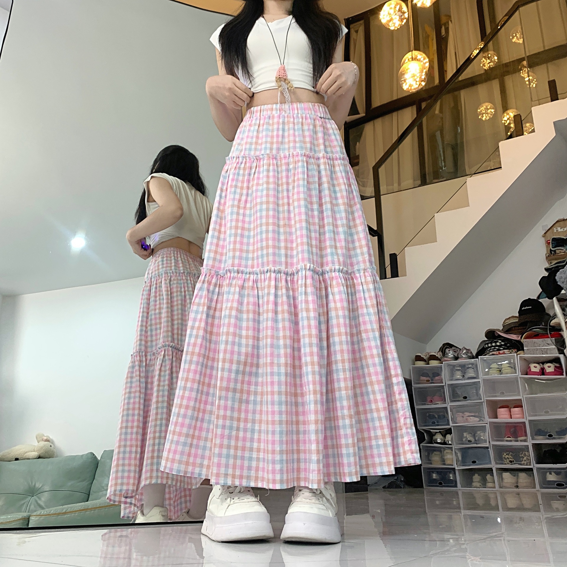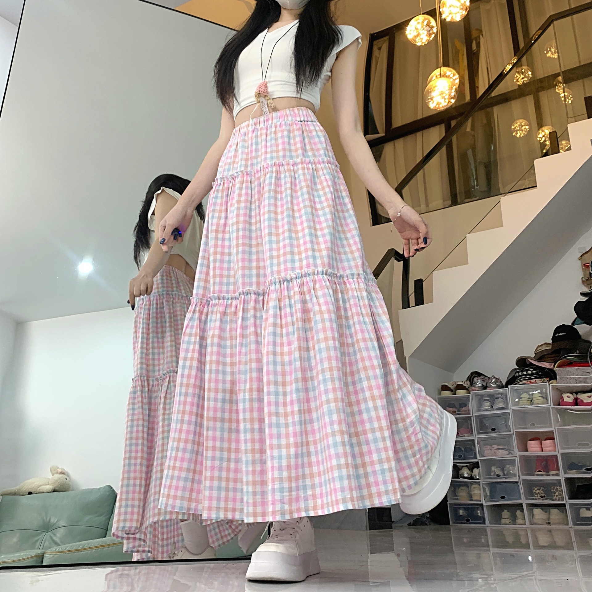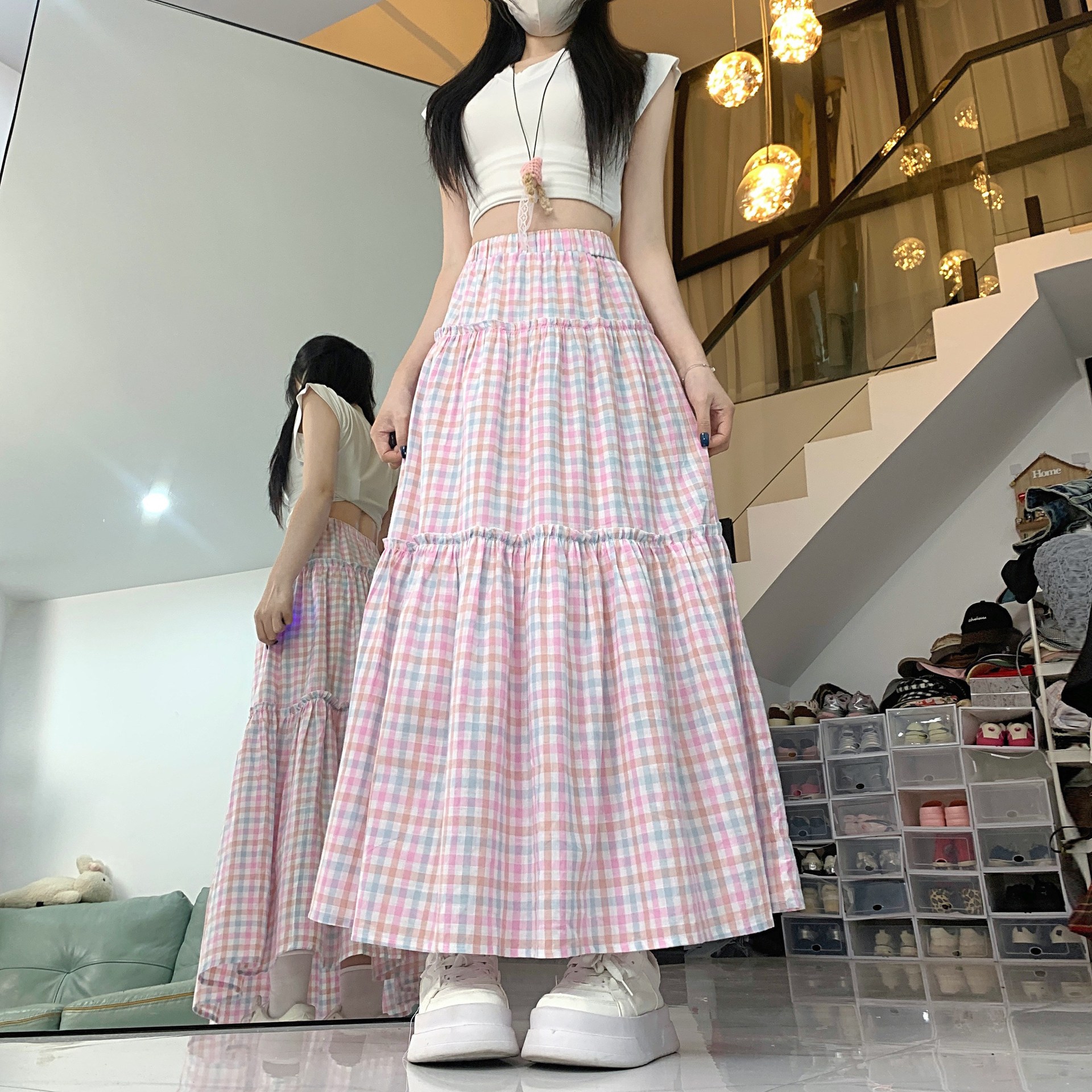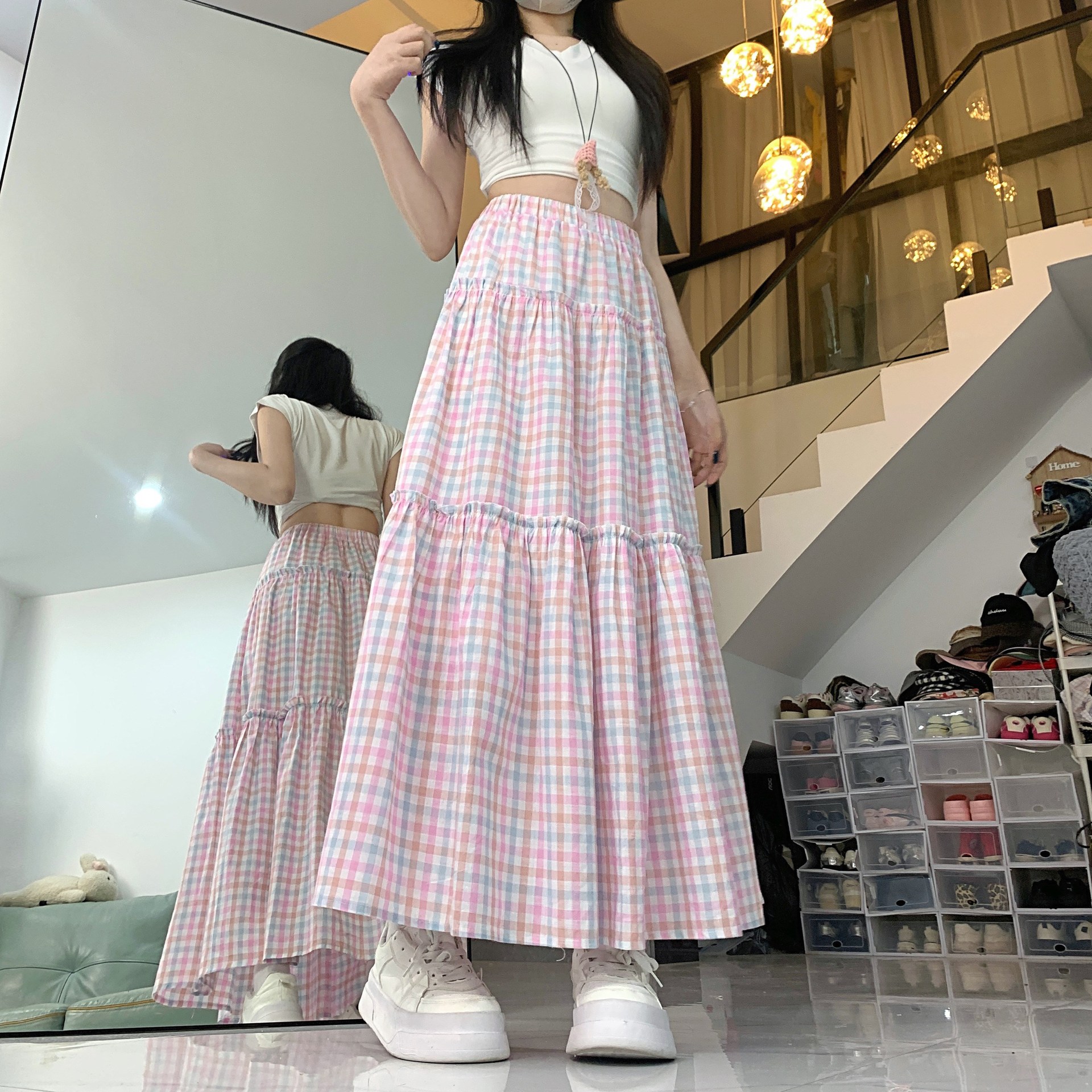 빈티지 대비 격자 무늬 치마 긴 치마 여성의 새로운 여름 짧은 긴 치마 느슨한 슬림 큰 치마
