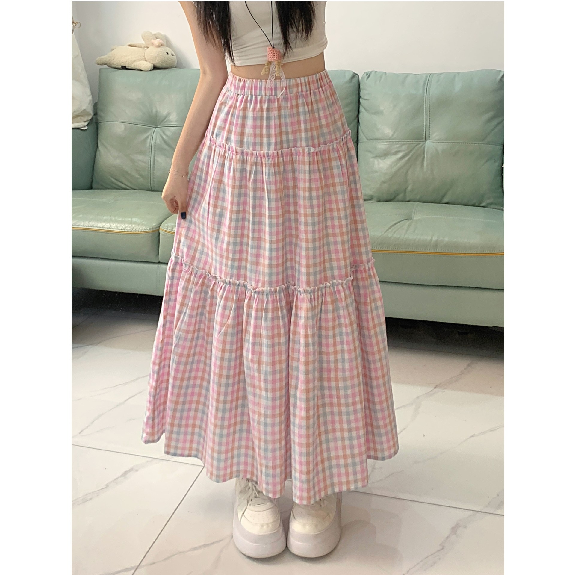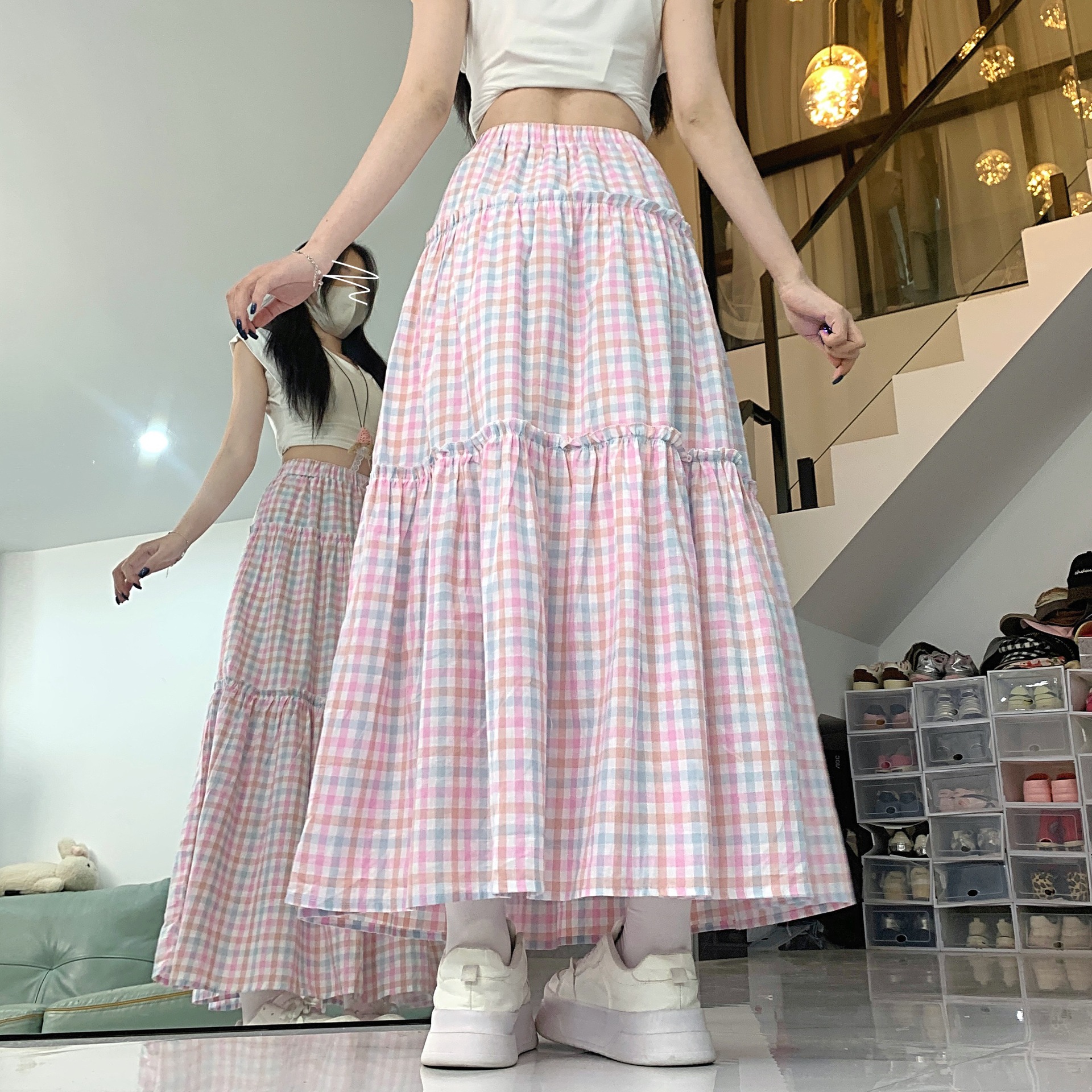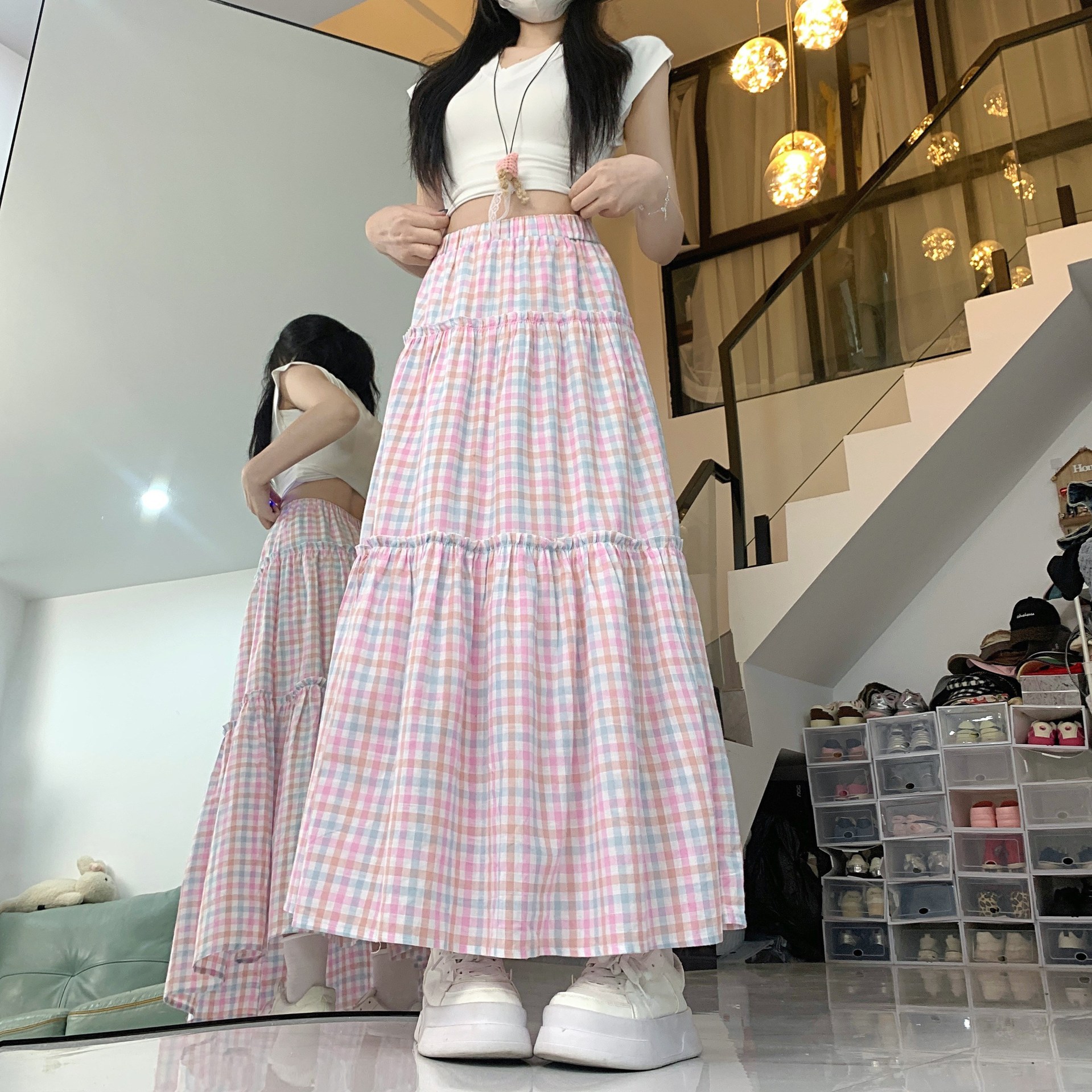 빈티지 대비 격자 무늬 치마 긴 치마 여성의 새로운 여름 짧은 긴 치마 느슨한 슬림 큰 치마스토어 가기