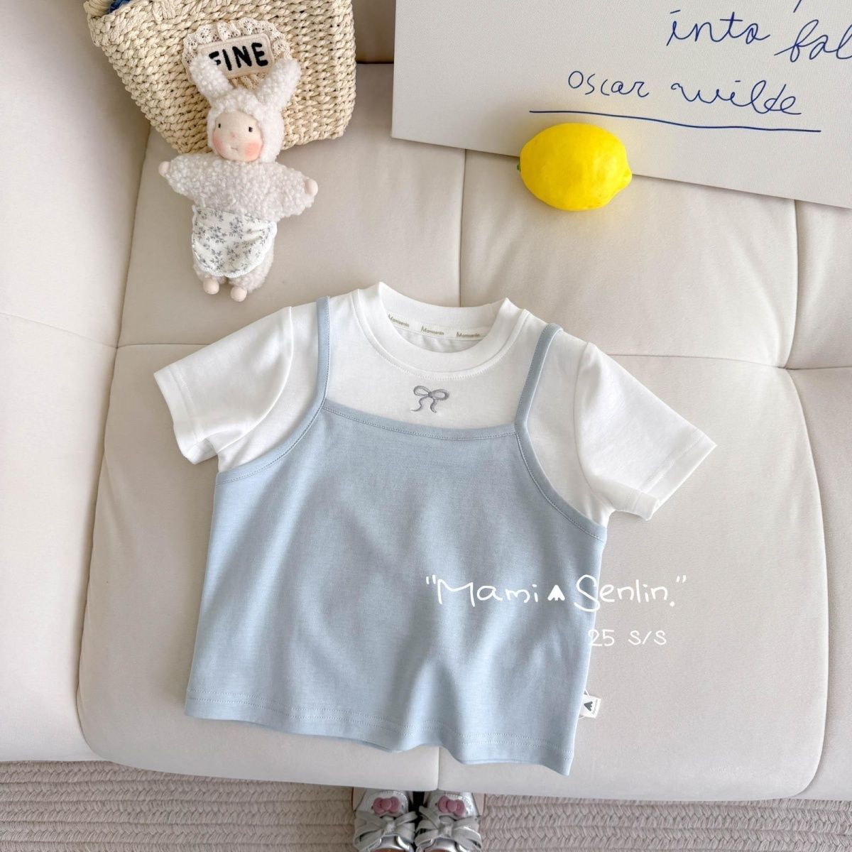 2025 년 여름 소녀 새 한국 스타일 가짜 투피스 올매치 퓨어 코튼 티셔츠 서양식 여성 아기의 명암 색 반소매 탑