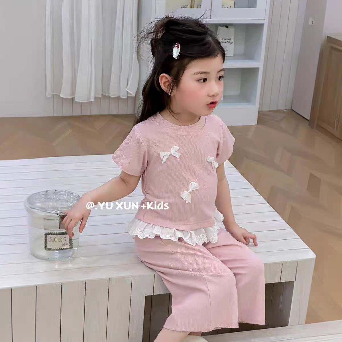 모달 소녀 세트 여름 2025 새로운 스타일 소녀 패션 레이스 바느질 큰 아이들을위한 짧은 소매 바지스토어 가기