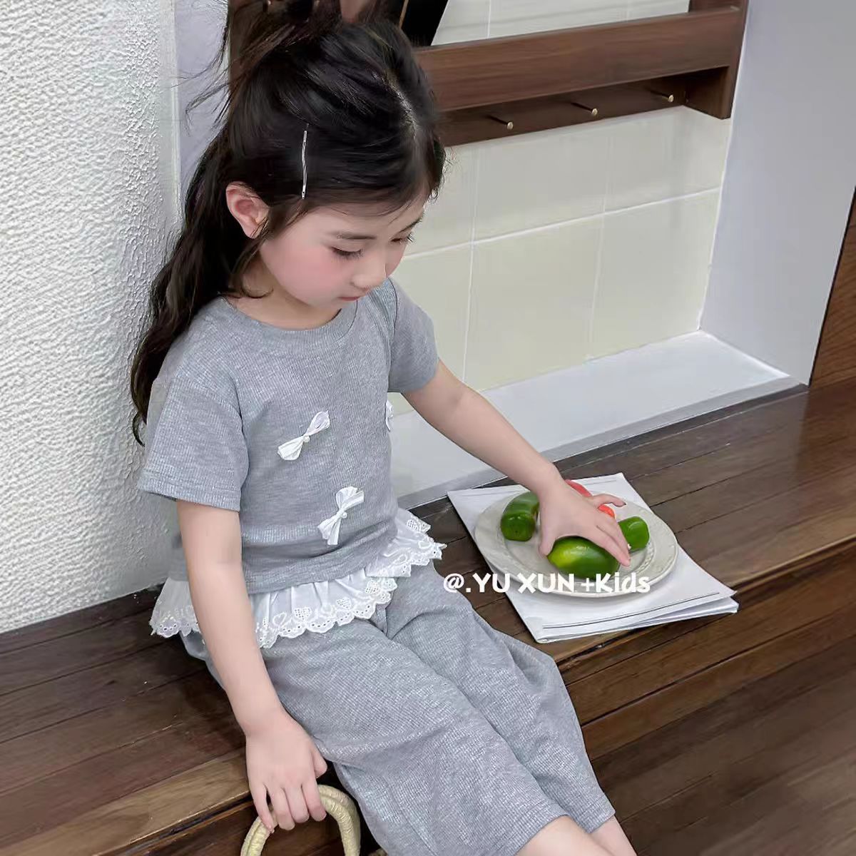 모달 소녀 세트 여름 2025 새로운 스타일 소녀 패션 레이스 바느질 큰 아이들을위한 짧은 소매 바지