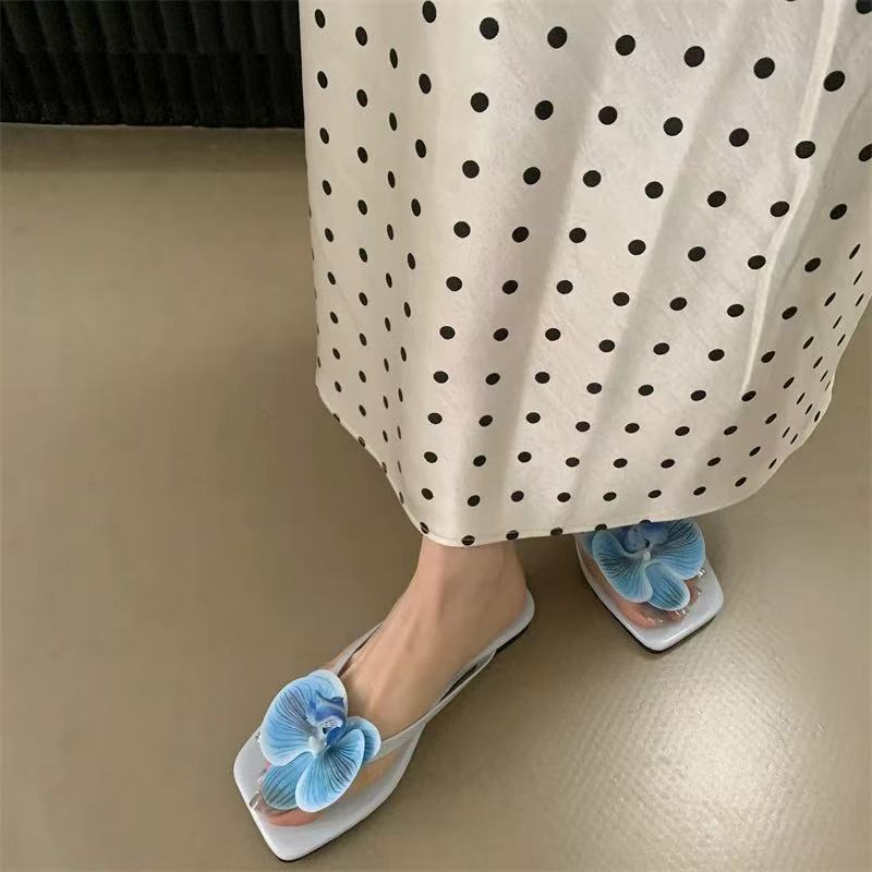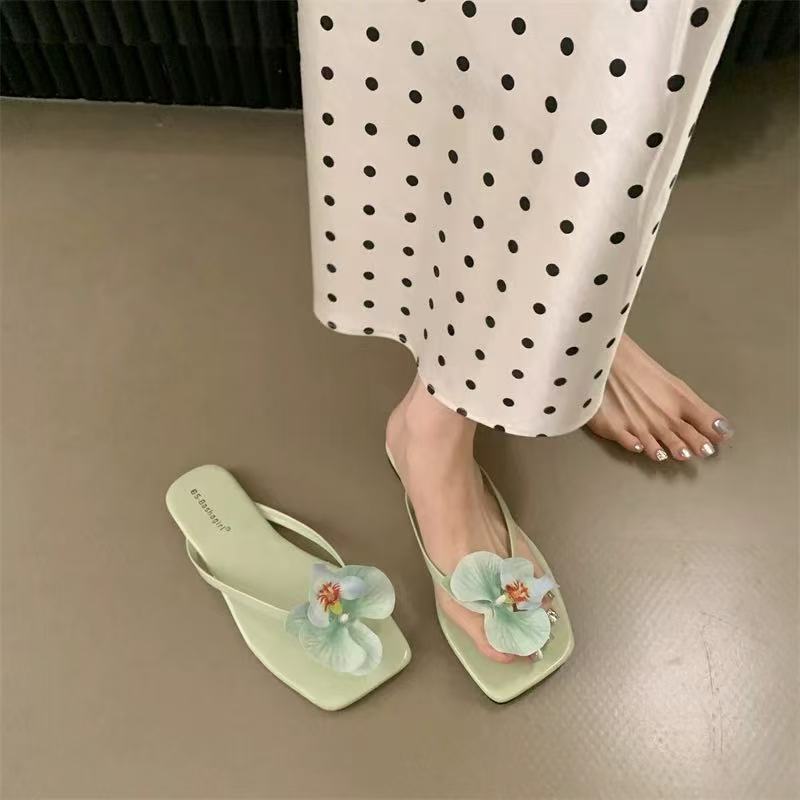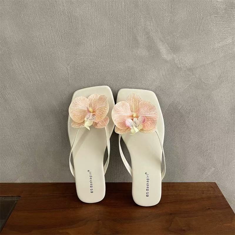 페어리 스타일 휴가 해변 플립 플롭 여성 틈새 저녁 바람 꽃잎 비치 플립 온 샌들 오픈 발가락 플랫 바닥 슬리퍼
