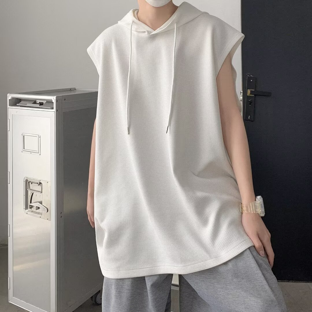 와플 민소매 후드 스웨터 미국 패션 브랜드 오버 사이즈 하이 스트리트 농구 스포츠 조끼 남성용 짧은 소매 티셔츠