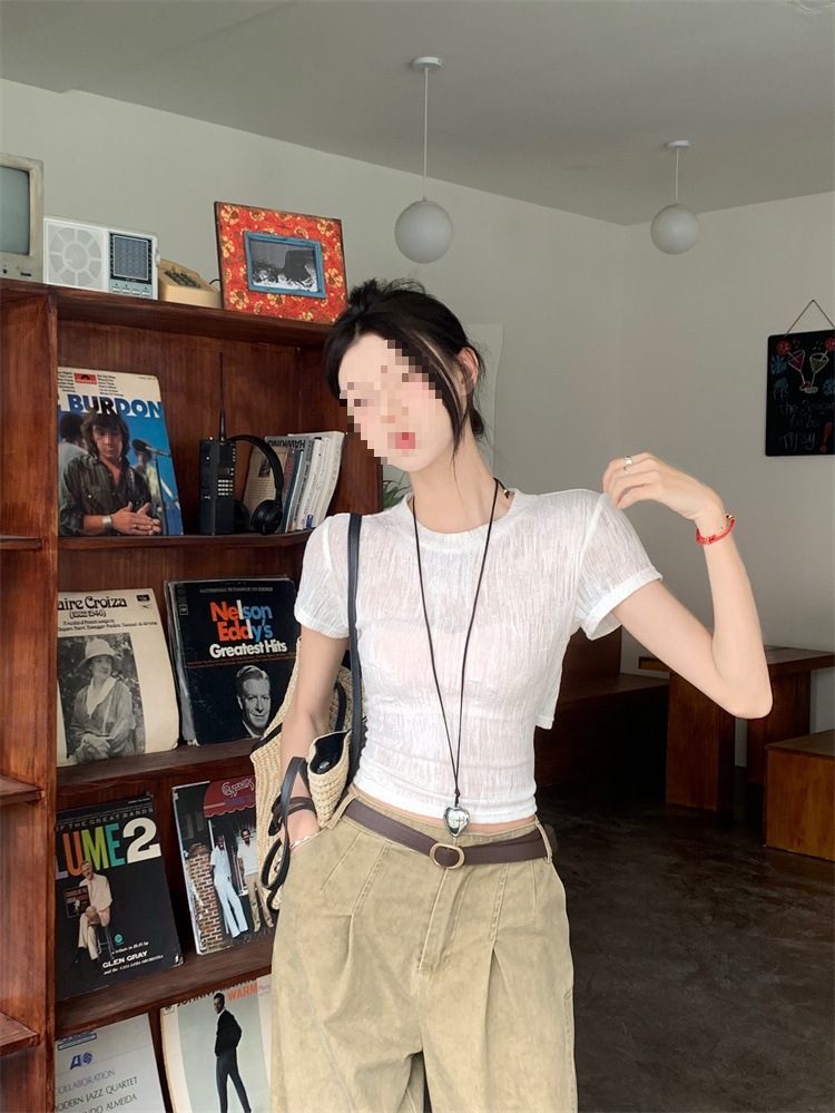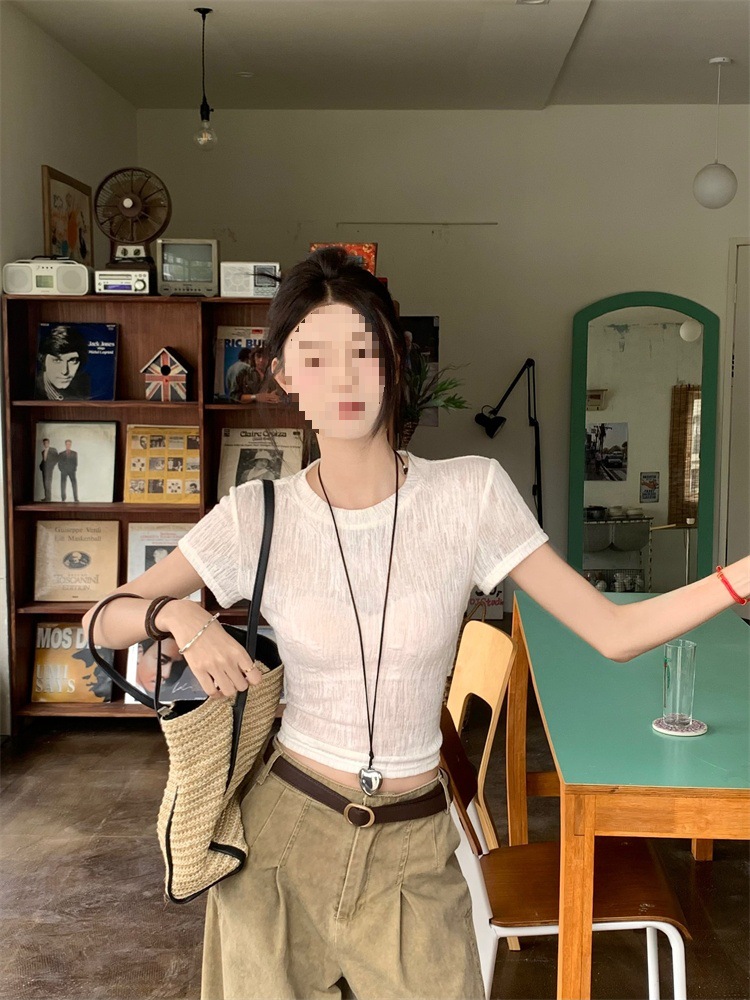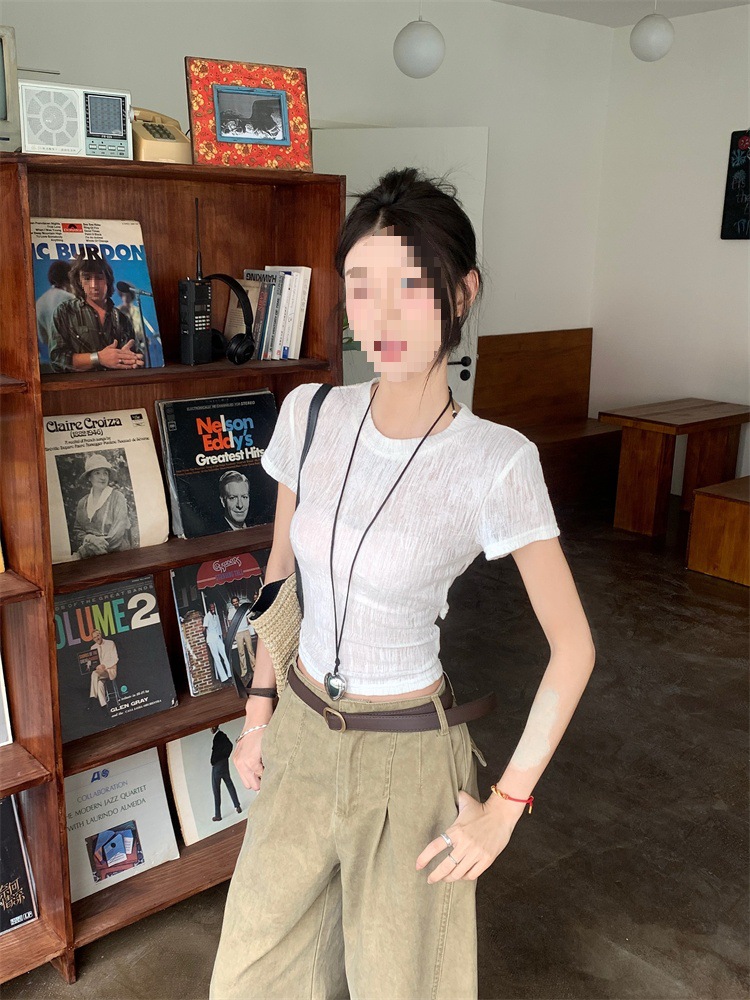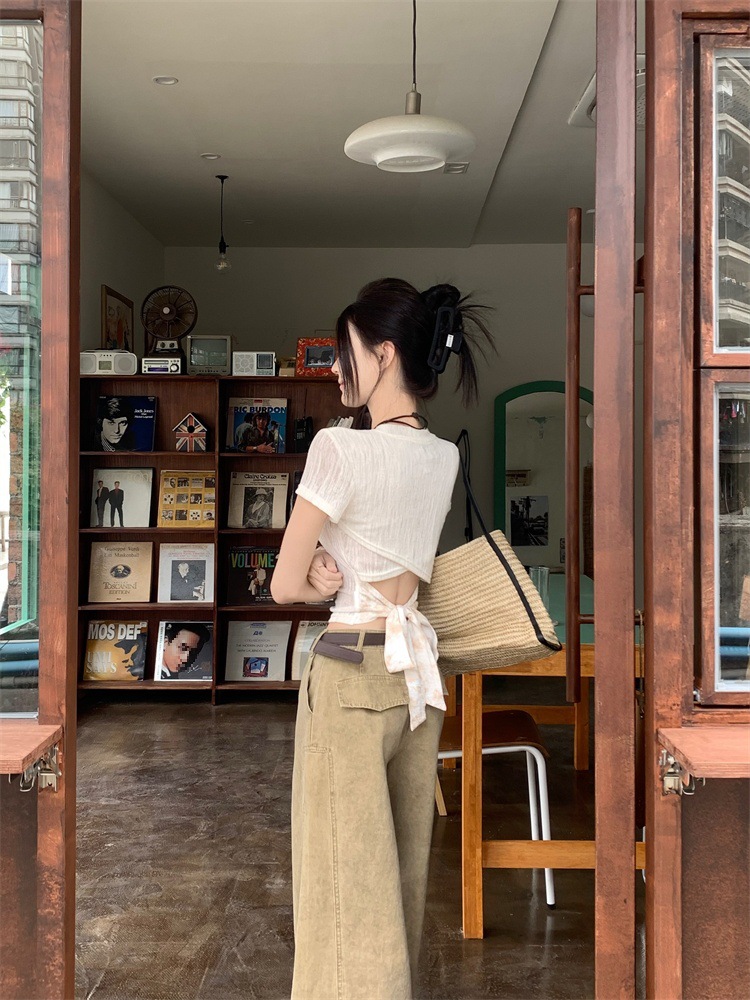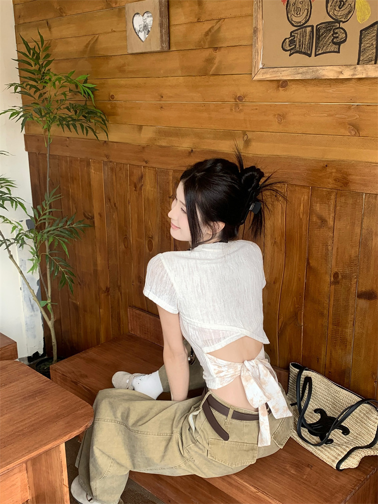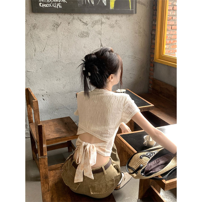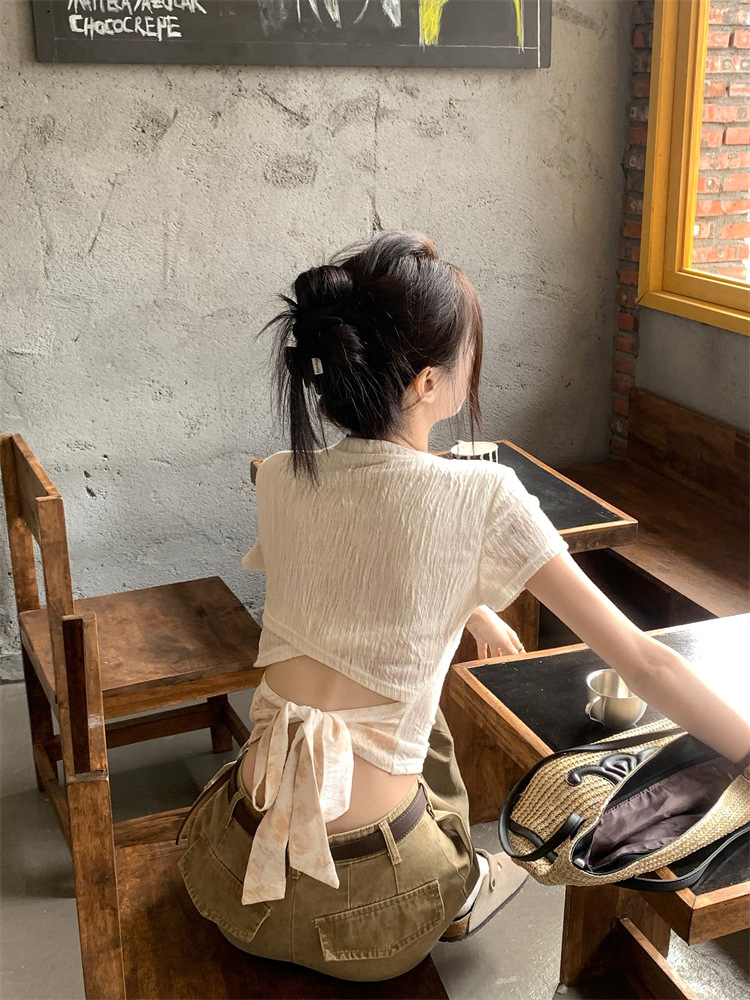 여름 핫 걸즈 백 중공 스트랩 크루 넥 작은 반팔 티셔츠 여성용 슬림 짧은 재킷
