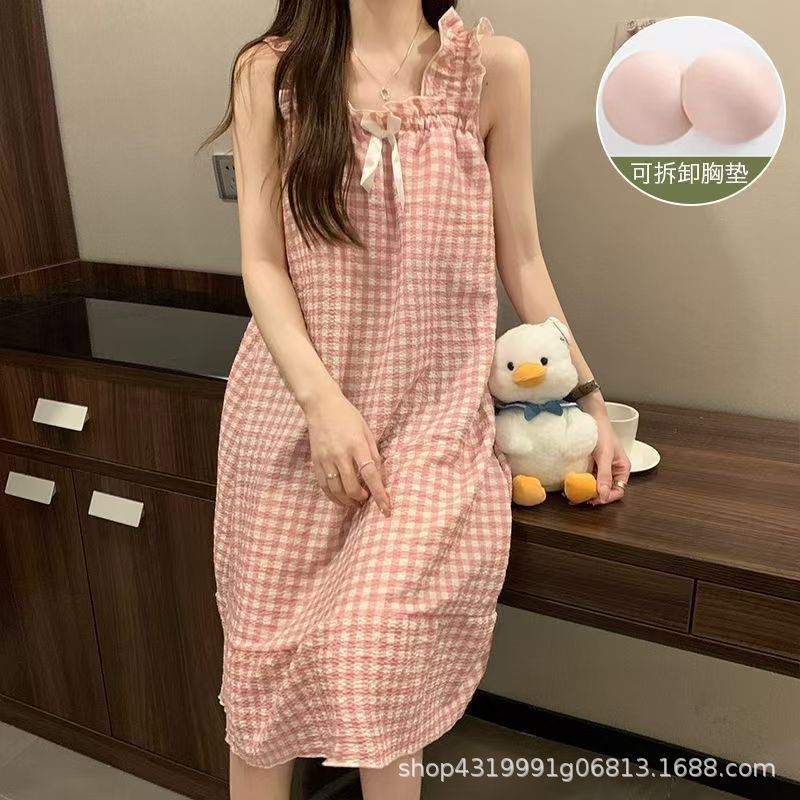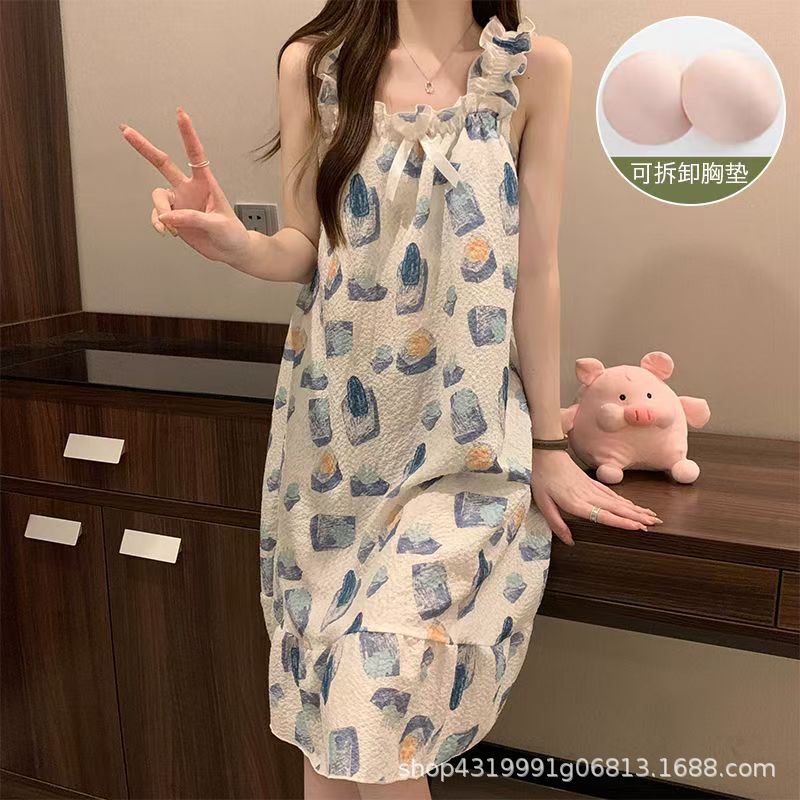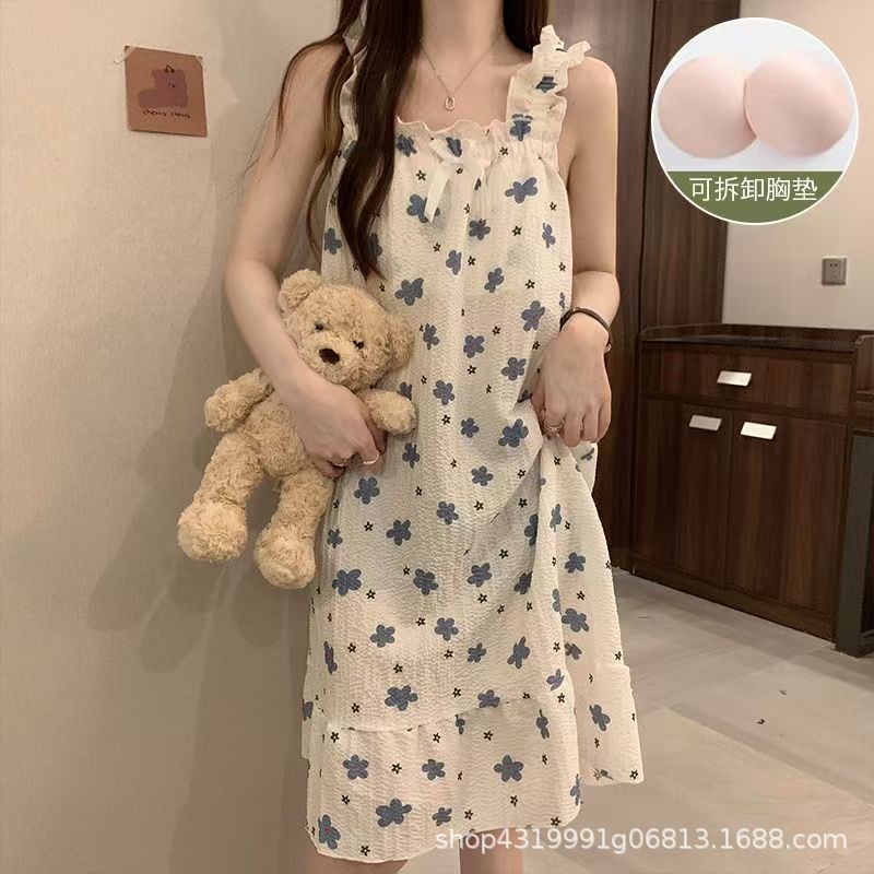 여자 여름 나이트 드레스 거품 분리 가능한 파자마 가슴 패드 귀여운 만화 느슨한 외부 착용 홈 옷