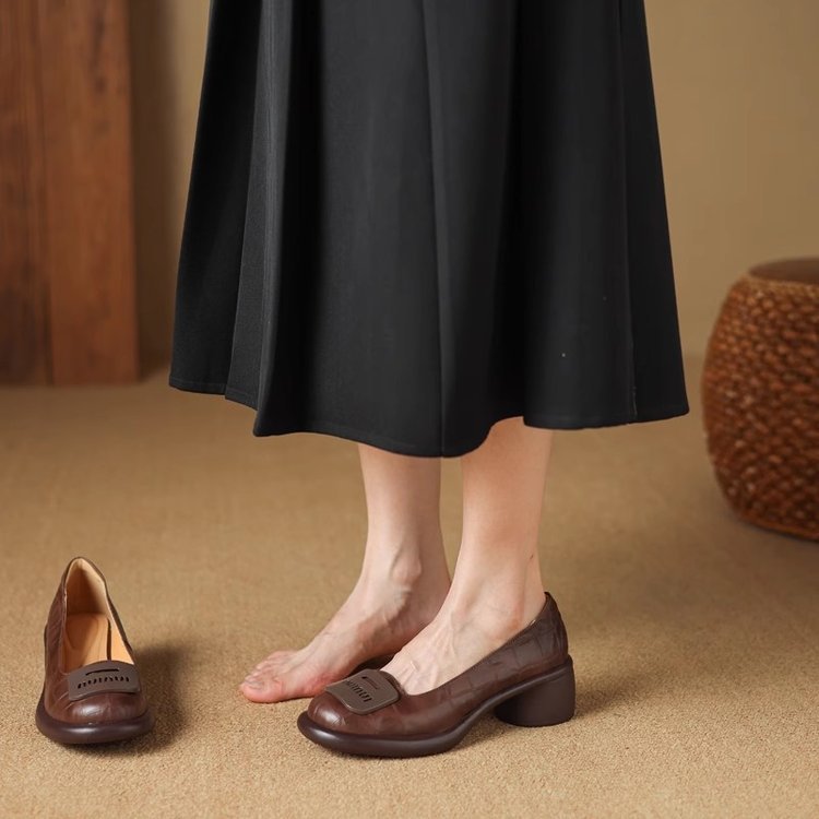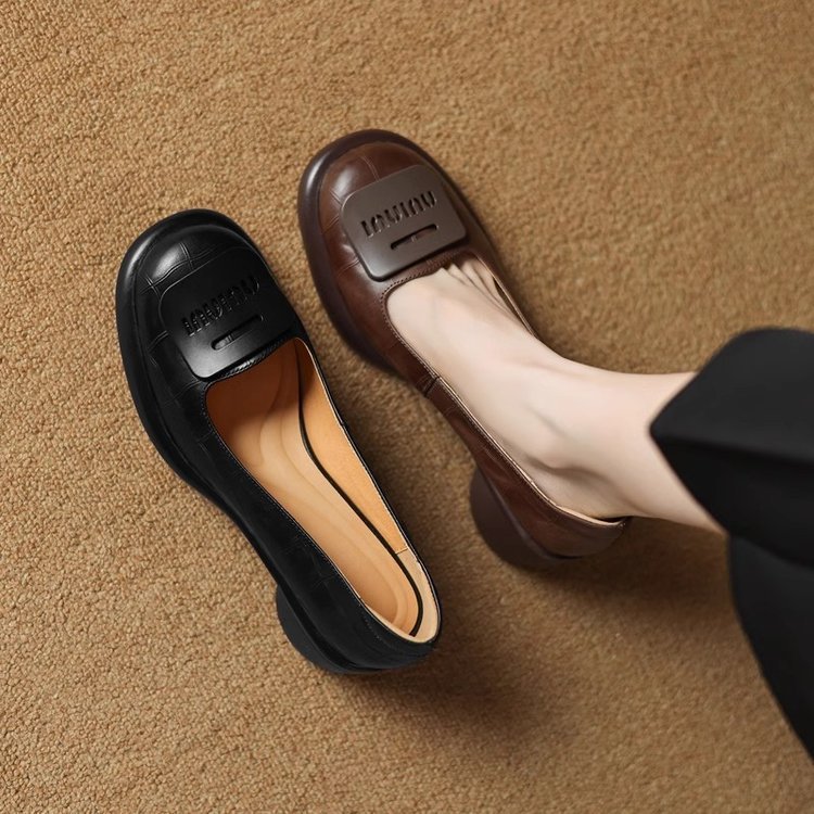 [youshilai] 2025 봄 신상 두꺼운 밑창 둥근 발가락 얕은 구멍 싱글 슈즈 여성 복고풍 스타일 두꺼운 굽 작은 가죽 신발스토어 가기