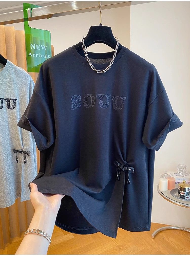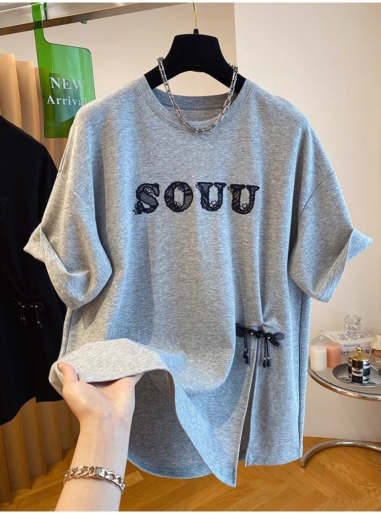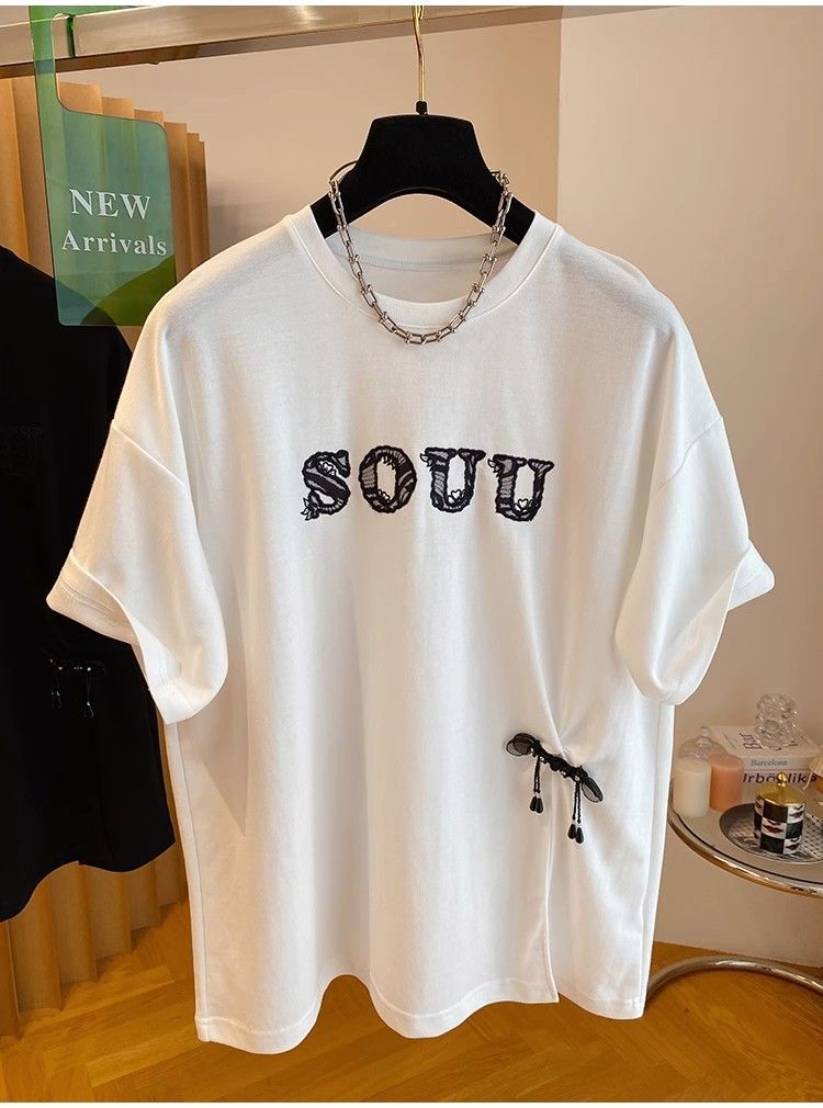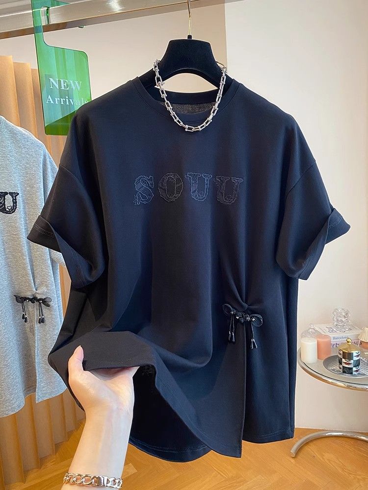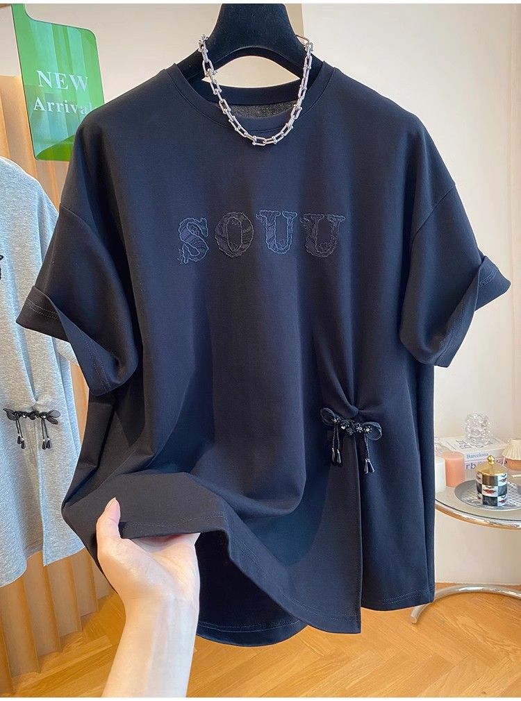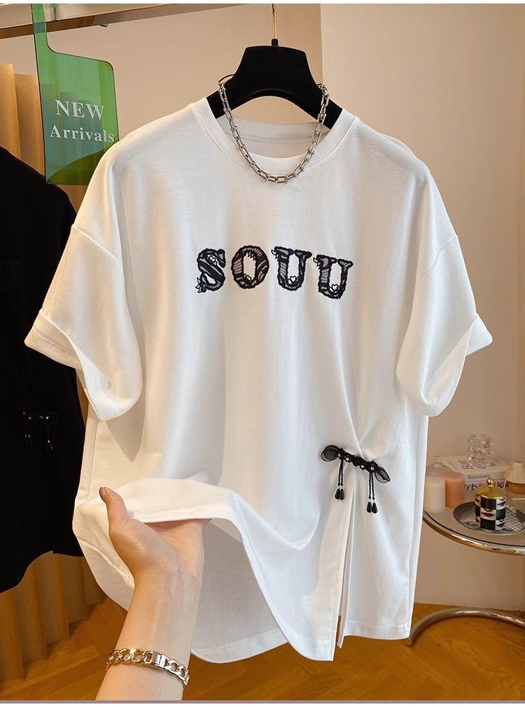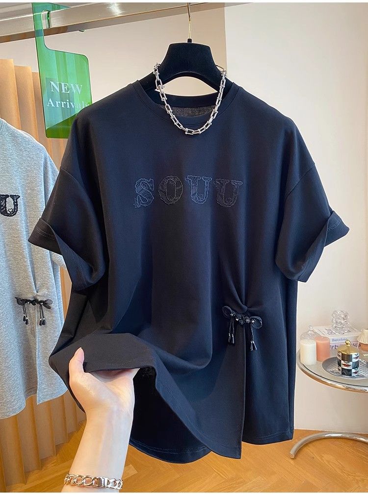 통통녀 플러스 사이즈 150.00kg 디자인 센스 틈새 독특한 분할 반팔 티셔츠 여성용 여름 세련된 베이스 셔츠 탑스토어 가기