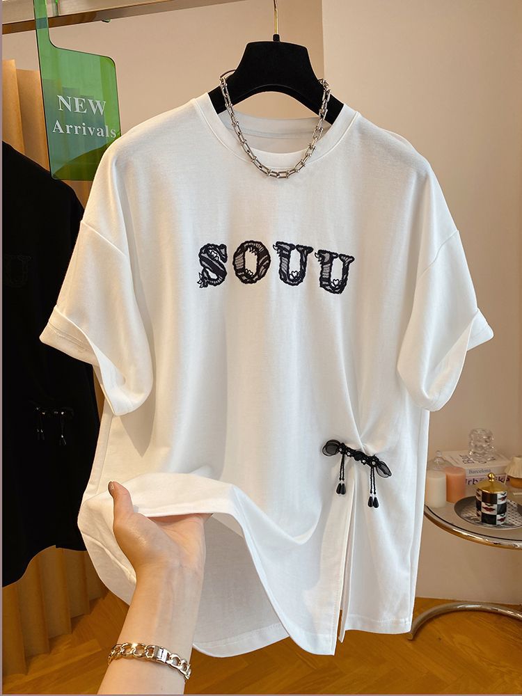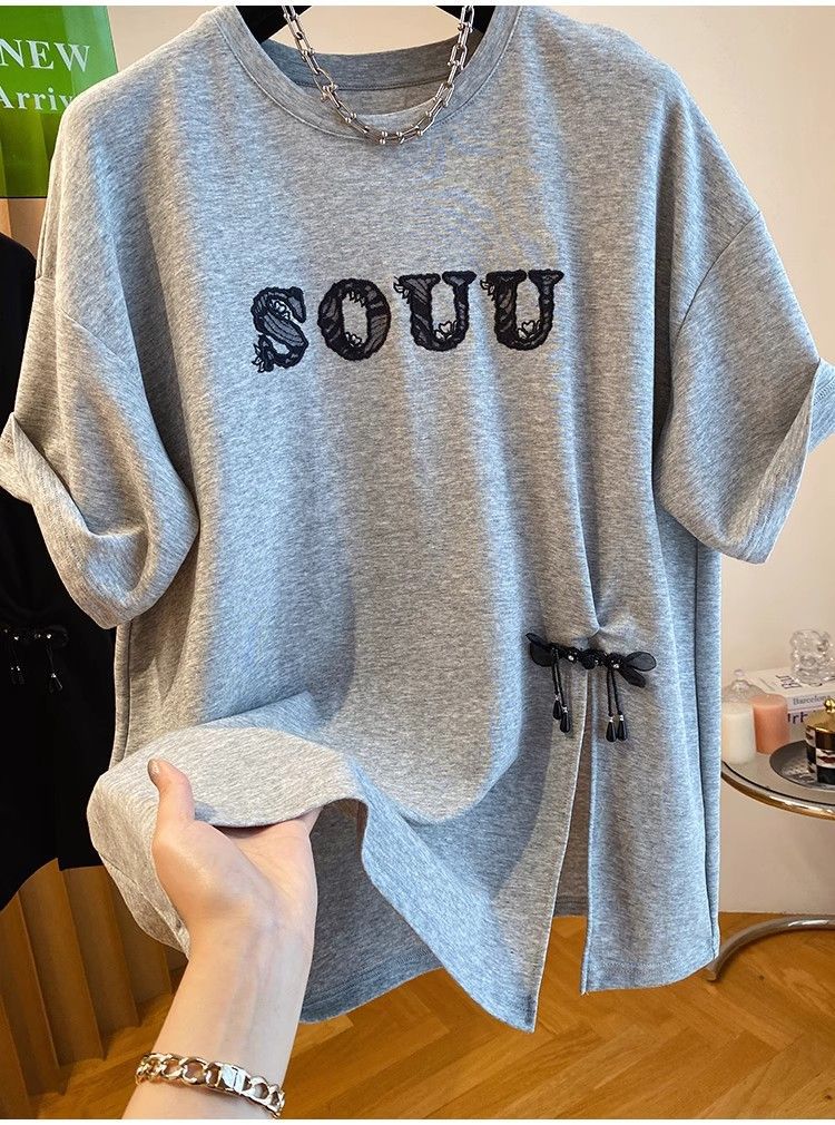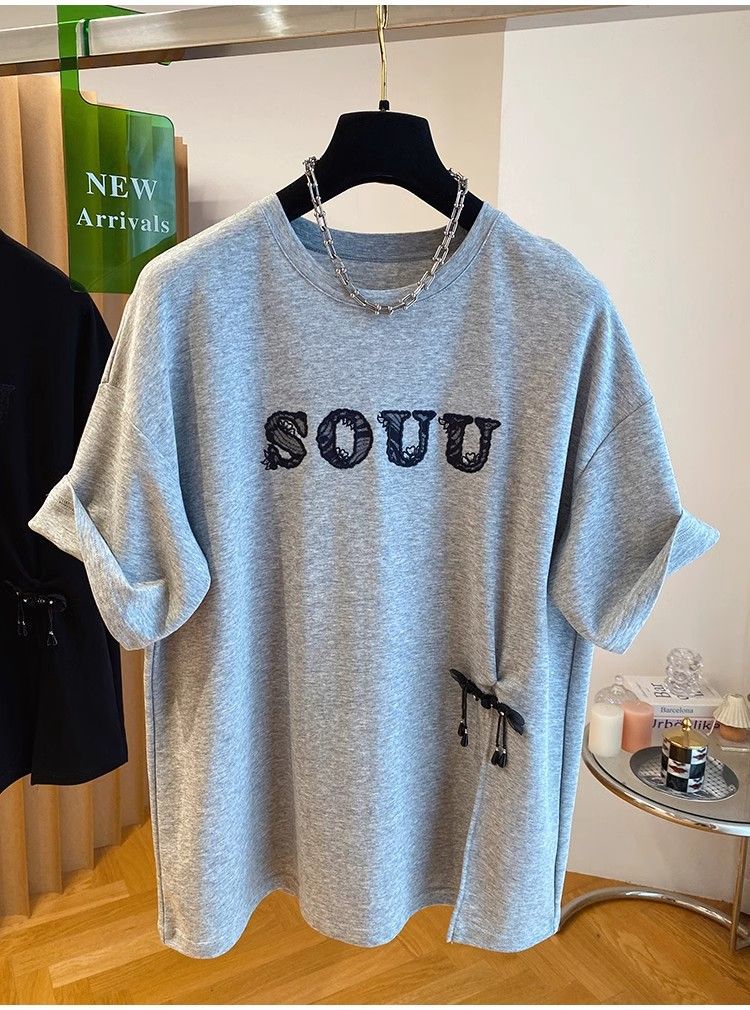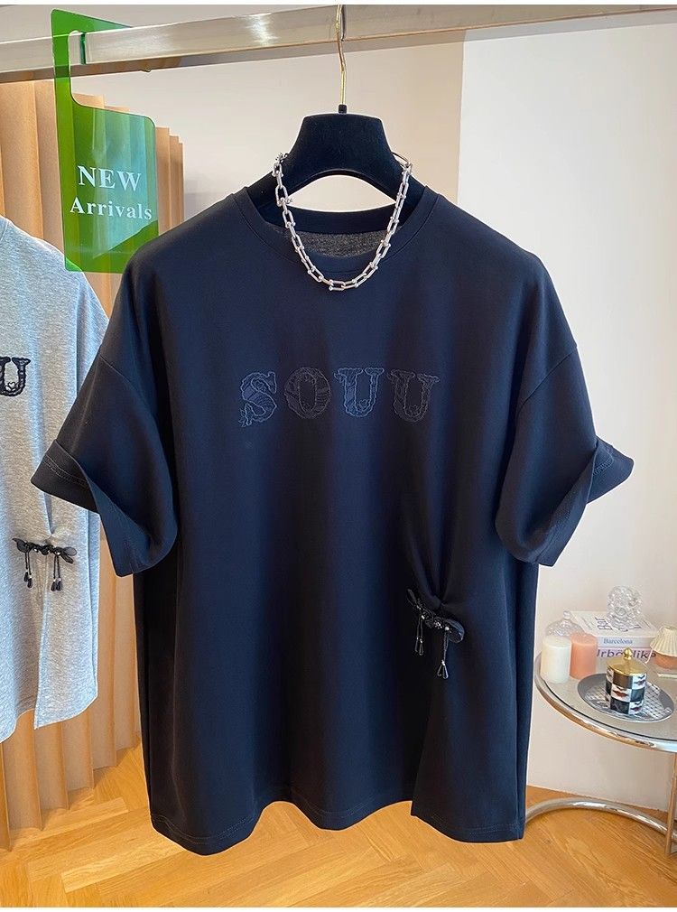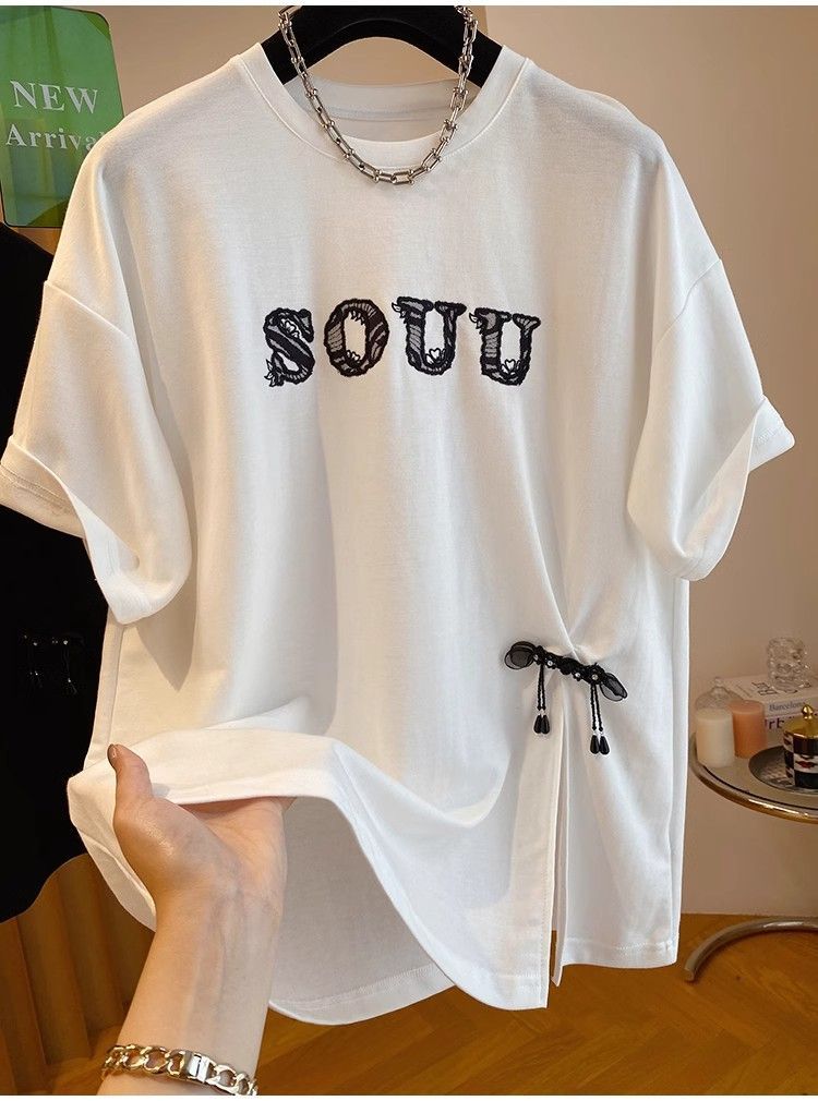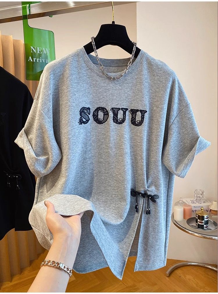 통통녀 플러스 사이즈 150.00kg 디자인 센스 틈새 독특한 분할 반팔 티셔츠 여성용 여름 세련된 베이스 셔츠 탑스토어 가기