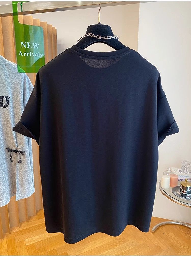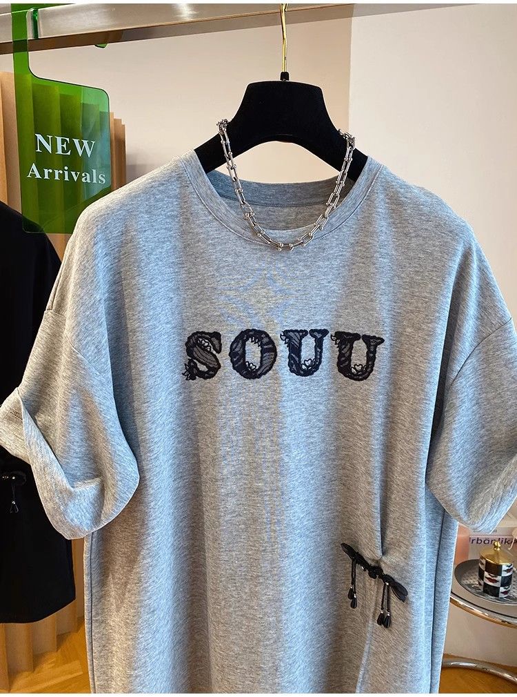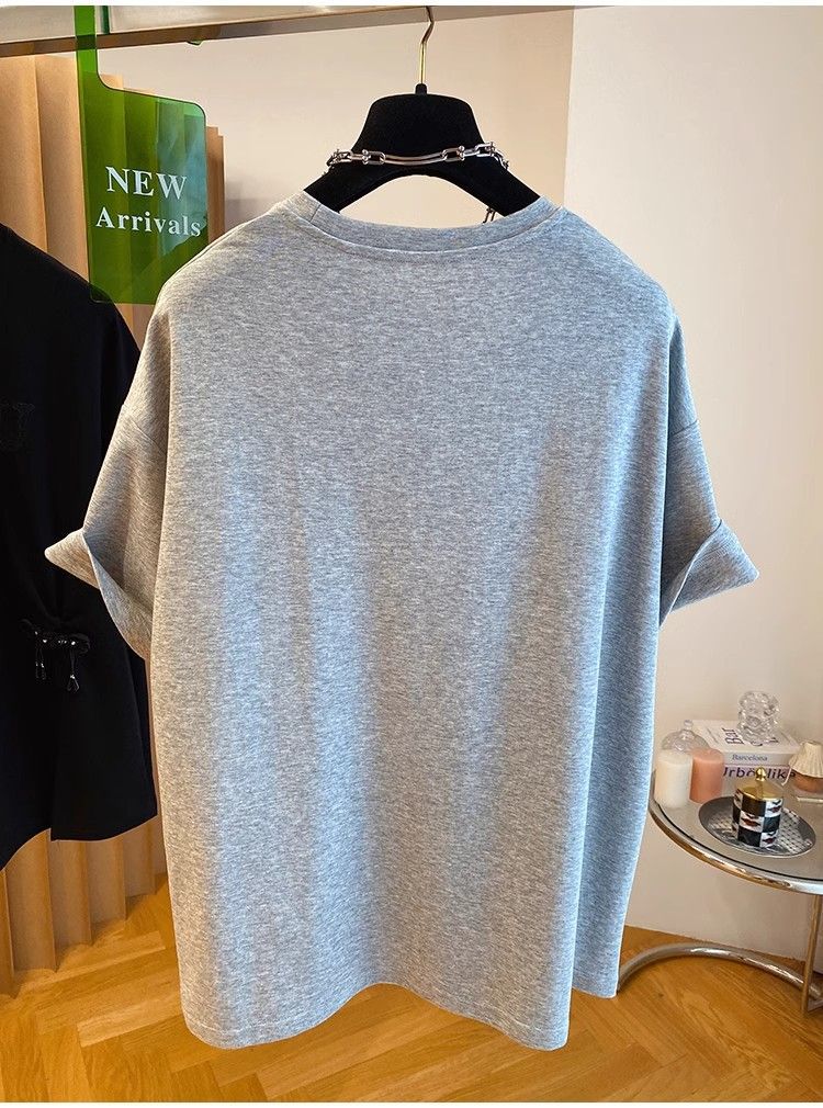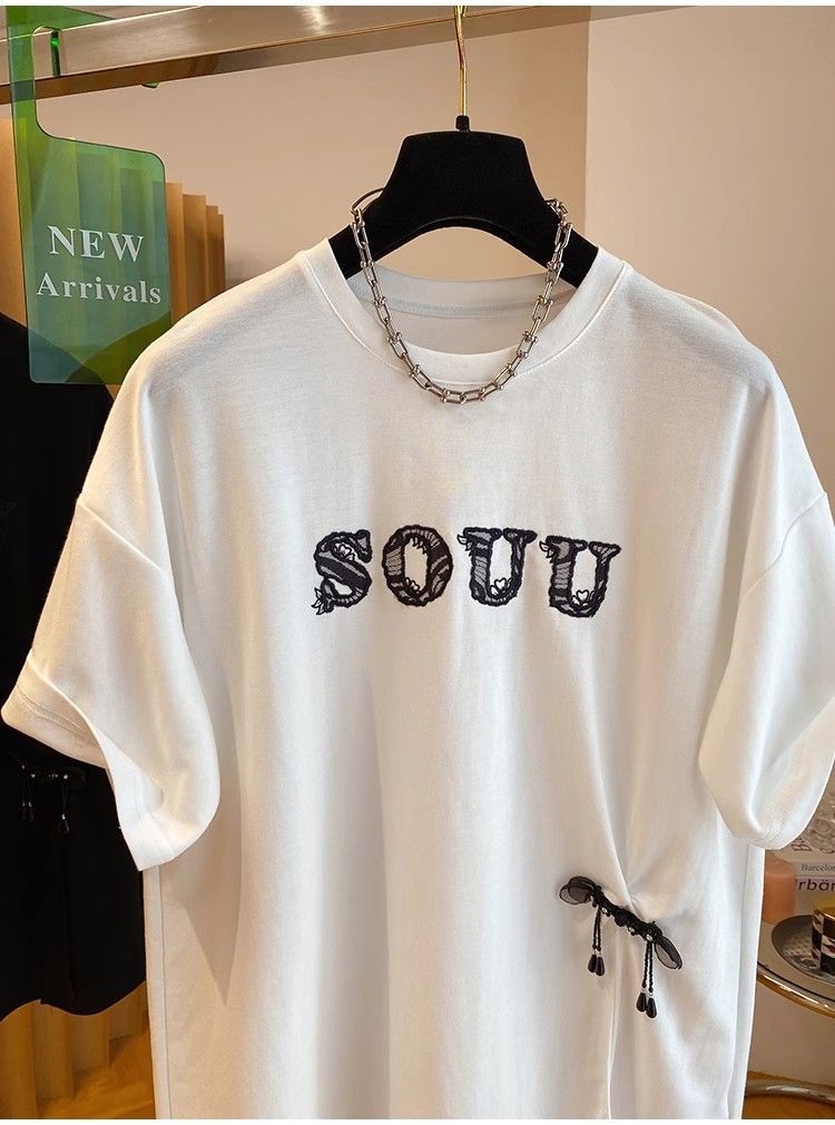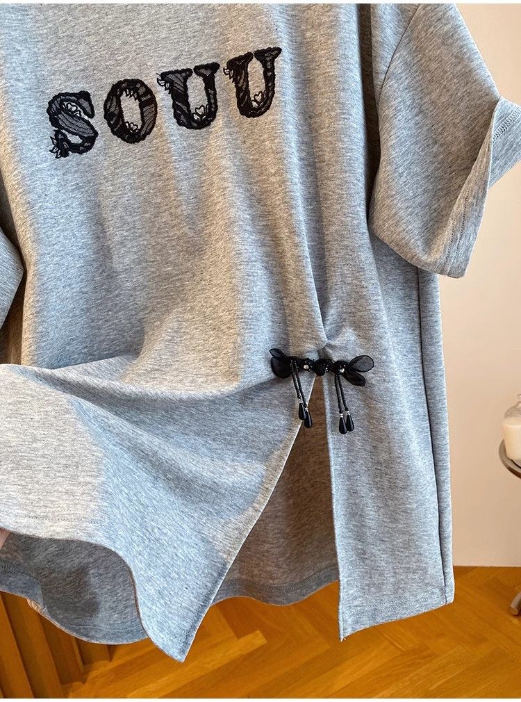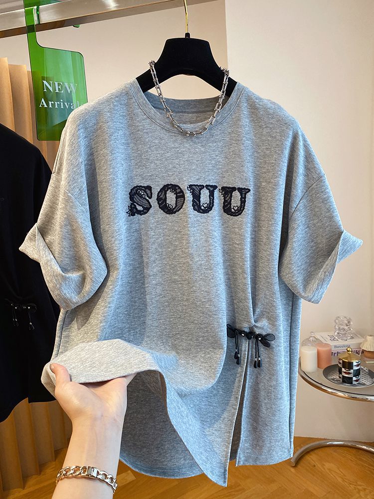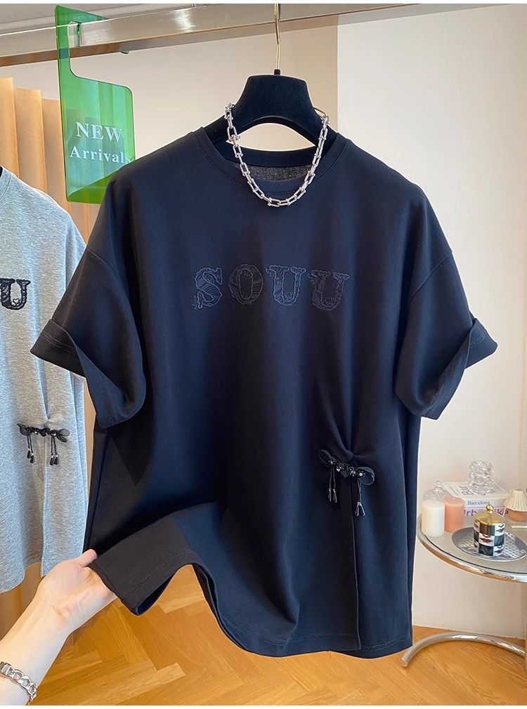 통통녀 플러스 사이즈 150.00kg 디자인 센스 틈새 독특한 분할 반팔 티셔츠 여성용 여름 세련된 베이스 셔츠 탑스토어 가기