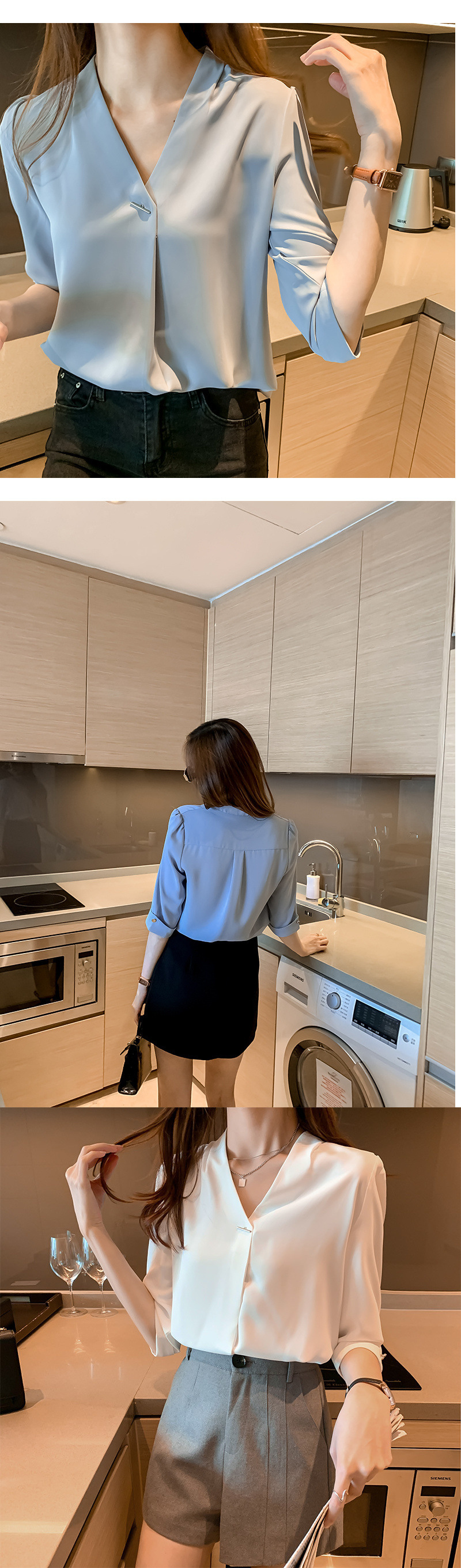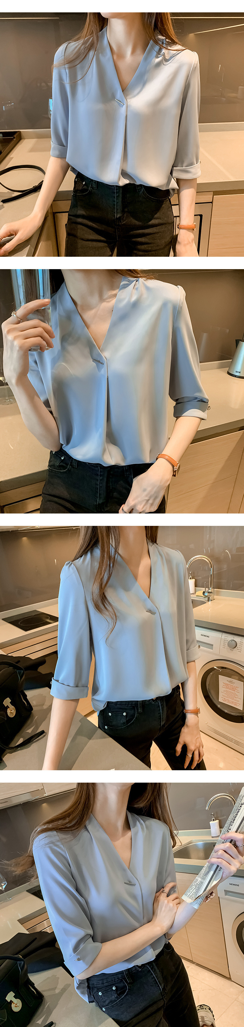 2024 신상 쉬폰 셔츠 브이넥 봄 여름 반팔 셔츠 탑 슬리밍 한국식 바닥 셔츠 루즈하고 다재다능함