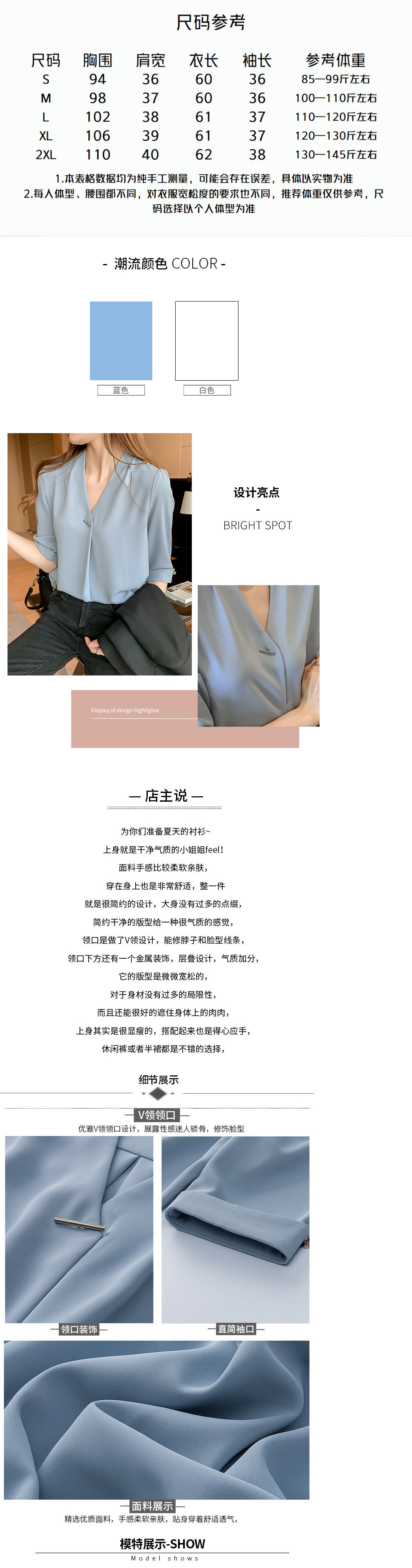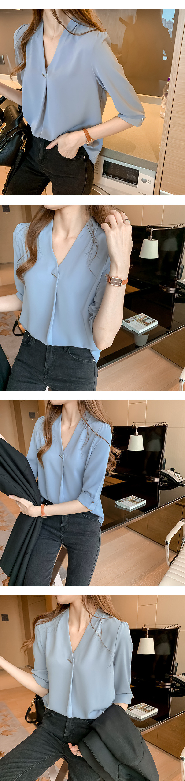 2024 신상 쉬폰 셔츠 브이넥 봄 여름 반팔 셔츠 탑 슬리밍 한국식 바닥 셔츠 루즈하고 다재다능함스토어 가기