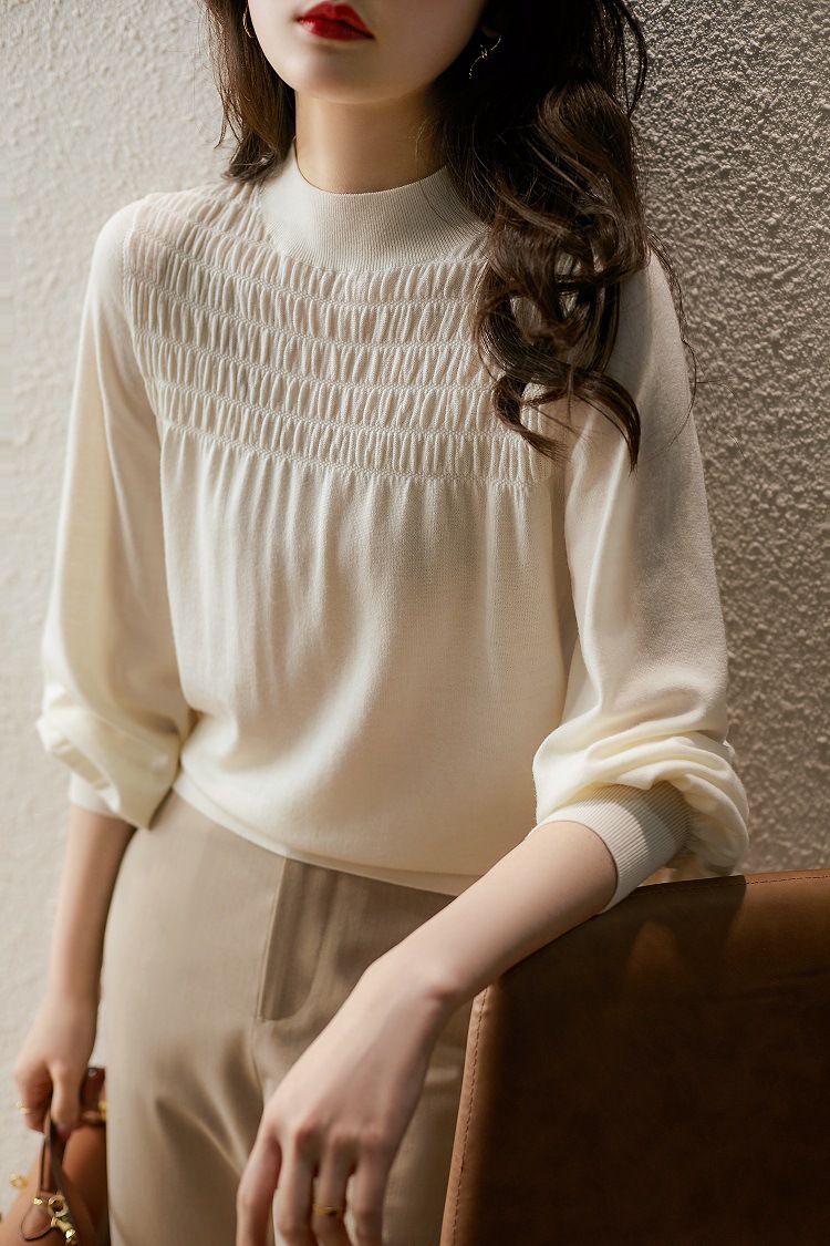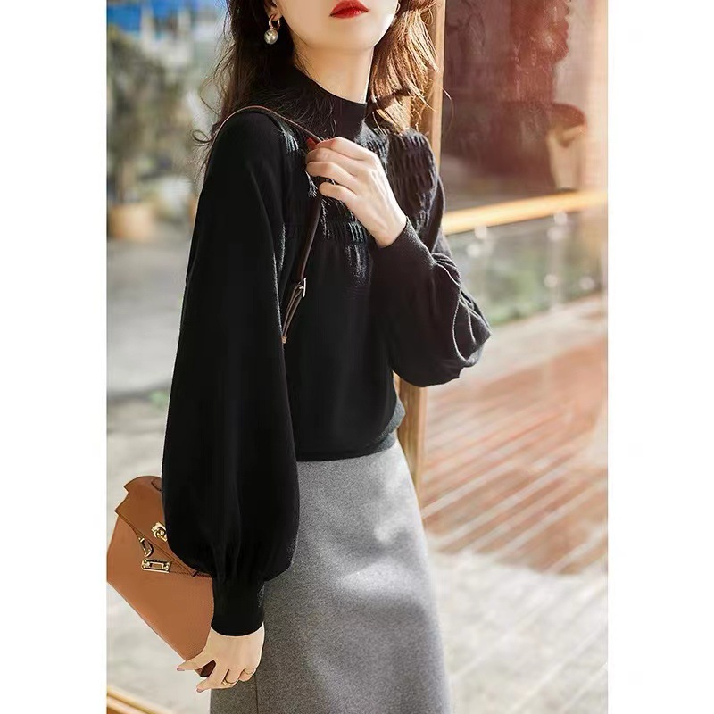 가을 2022 년 새로운 도착 하프 하이 칼라 올 매치 랜턴 슬리브 원사 니트 스웨터 탑 디자인 틈새 스웨터스토어 가기