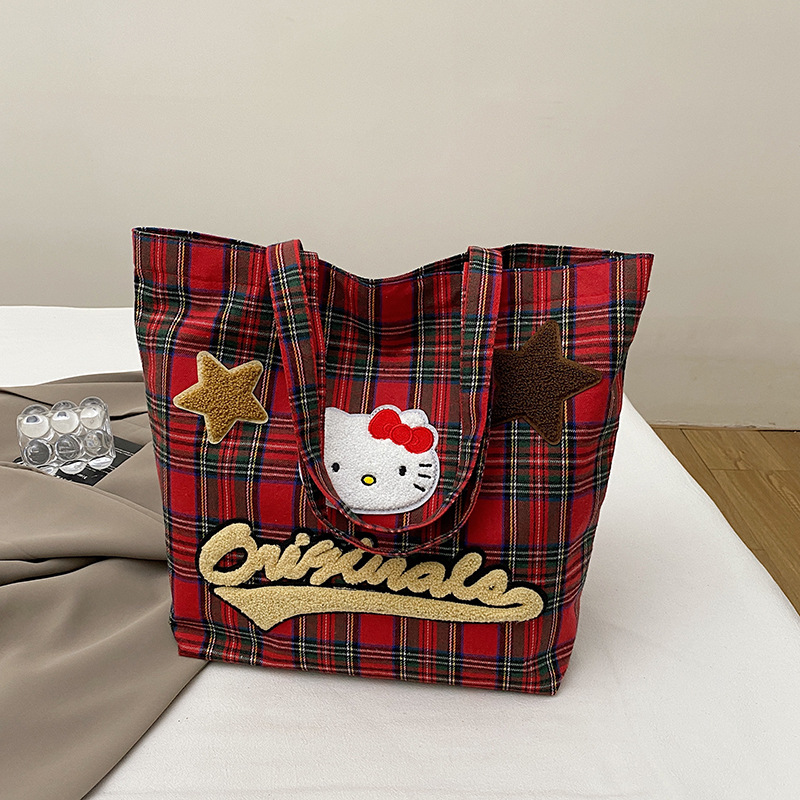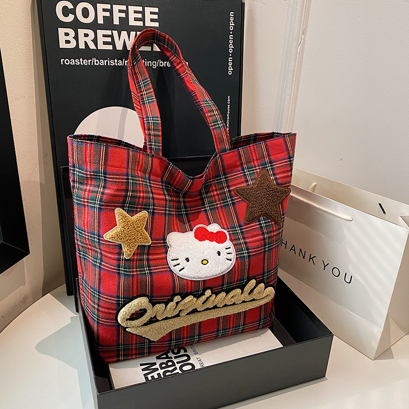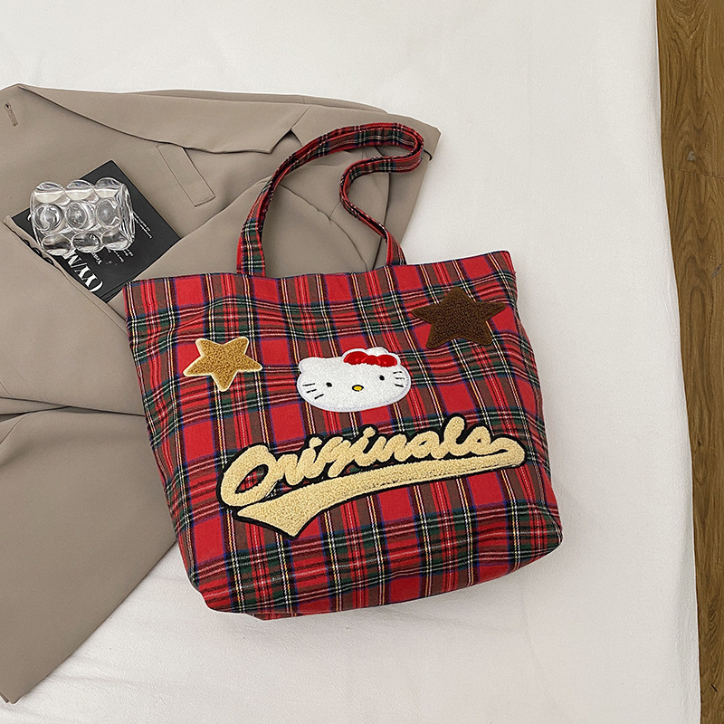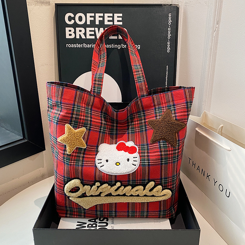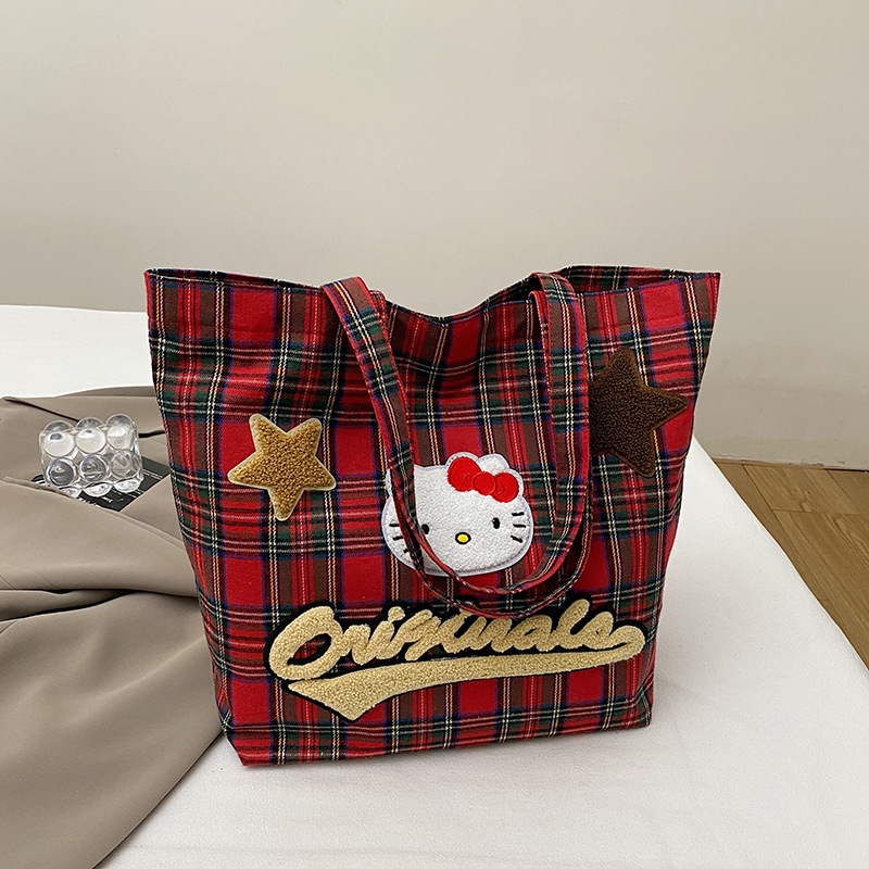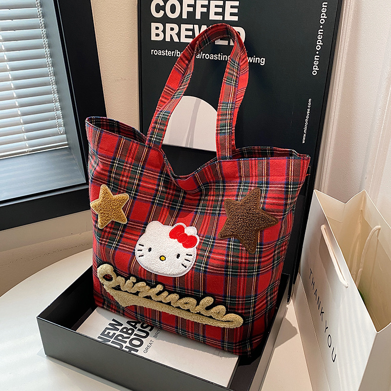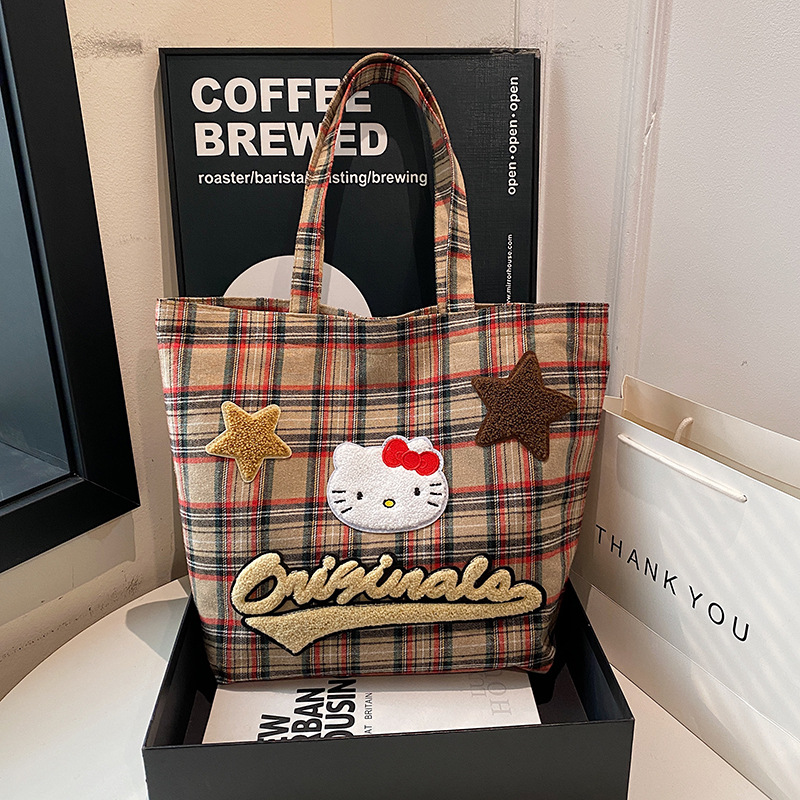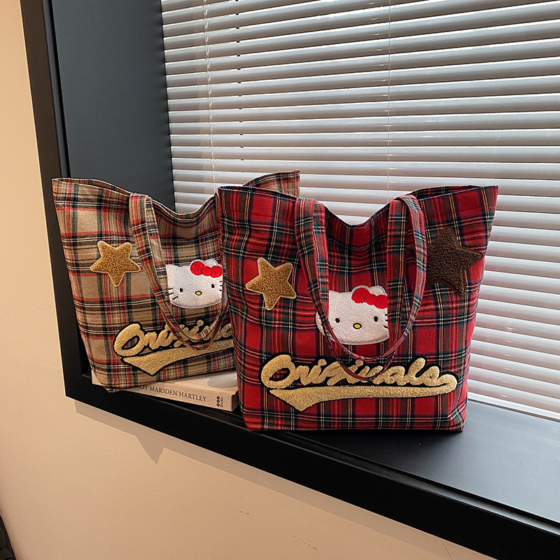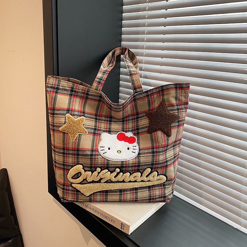 새로운 귀여운 만화 고양이 토트 백 격자 무늬 복고풍 소녀 숄더 백 대용량 Drawstring KT 핸드백스토어 가기