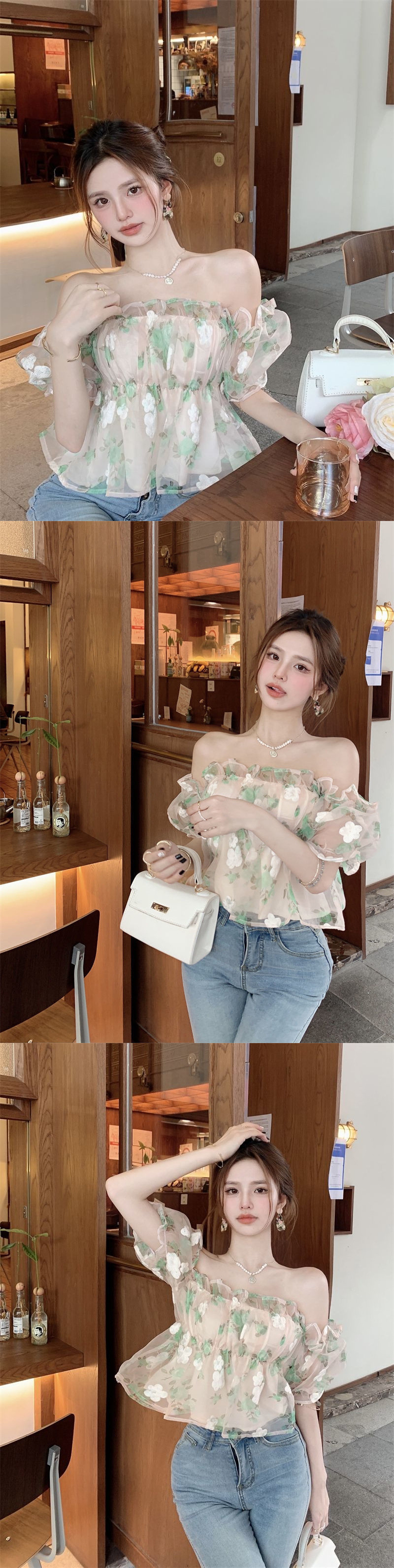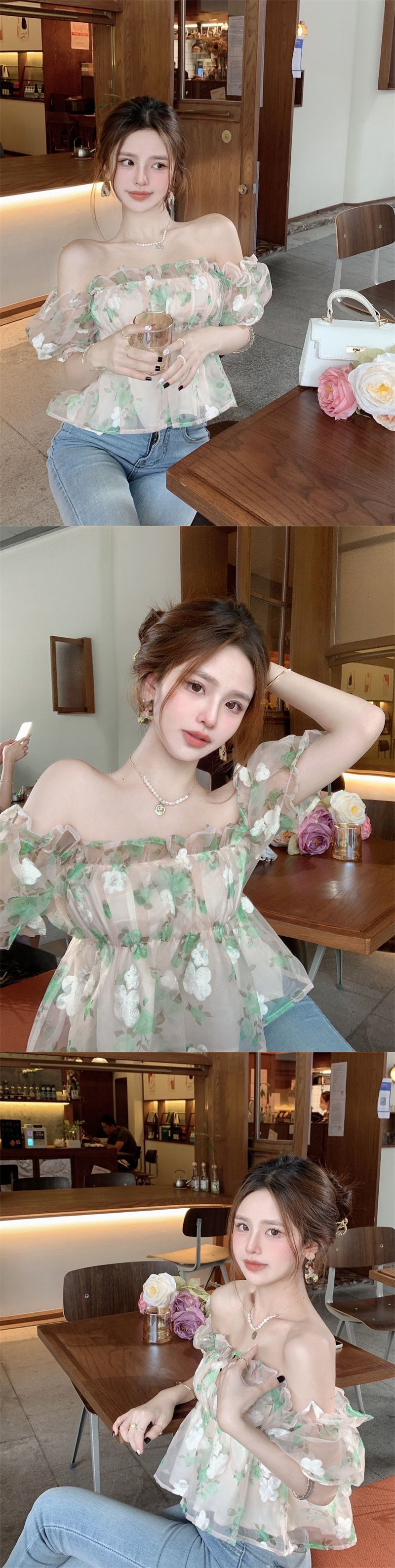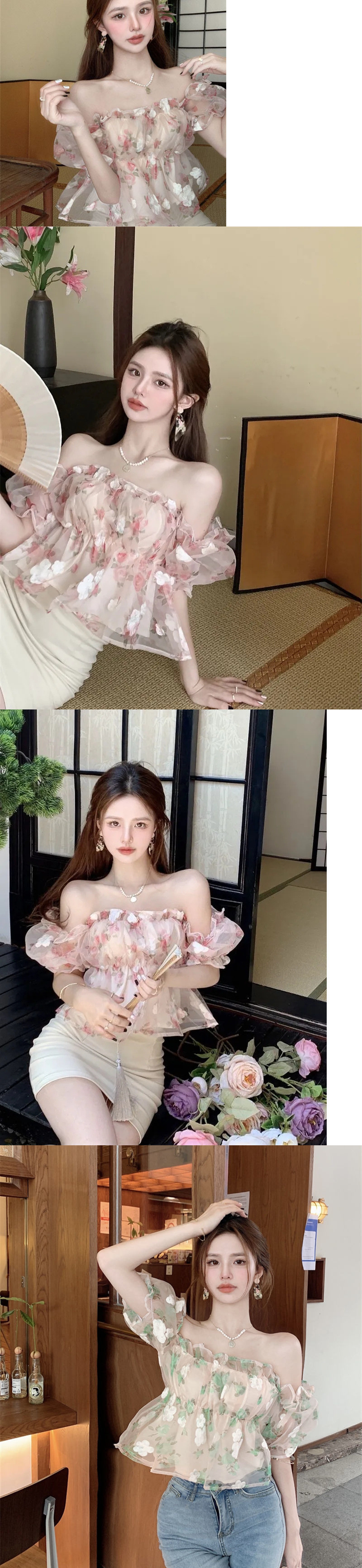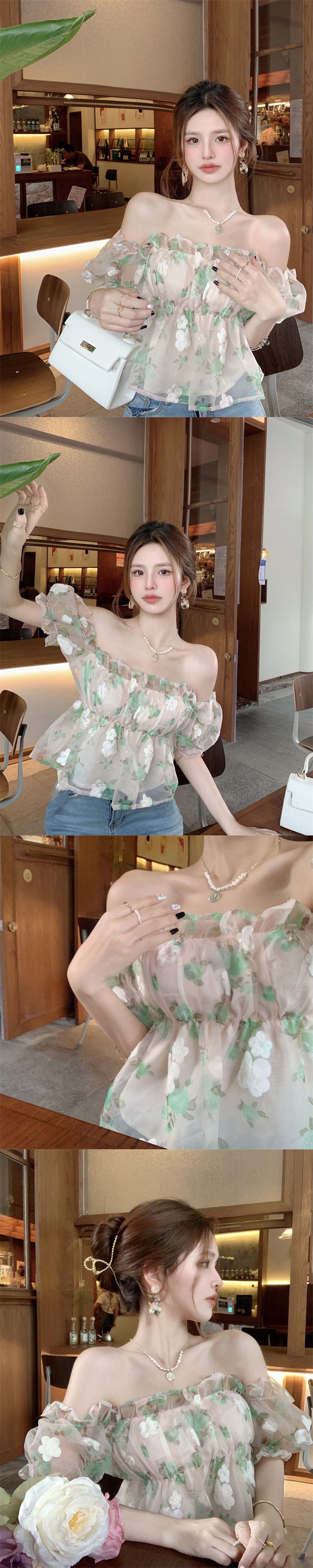 여성을위한 공주 스타일 원 숄더 탑 2023 새로운 여름 퍼프 슬리브 배를 덮는 틈새 기질 꽃 무늬 쉬폰 셔츠스토어 가기
