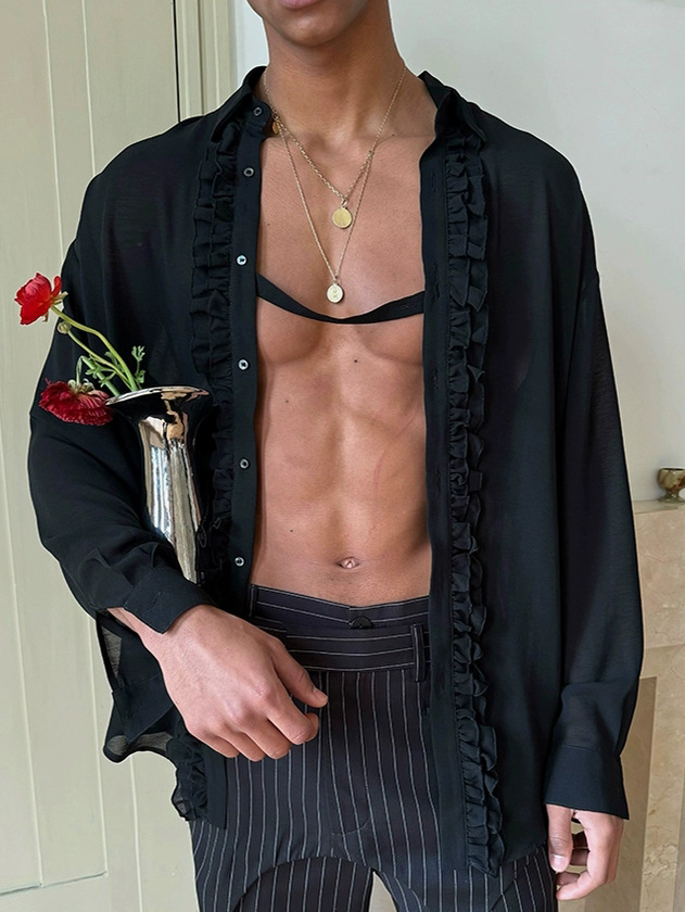 국경을 넘는 새로운 남성 심플 레이스 블랙 쉬폰 셔츠 대형 긴팔 루즈 캐주얼 셔츠 남성용 다용도
