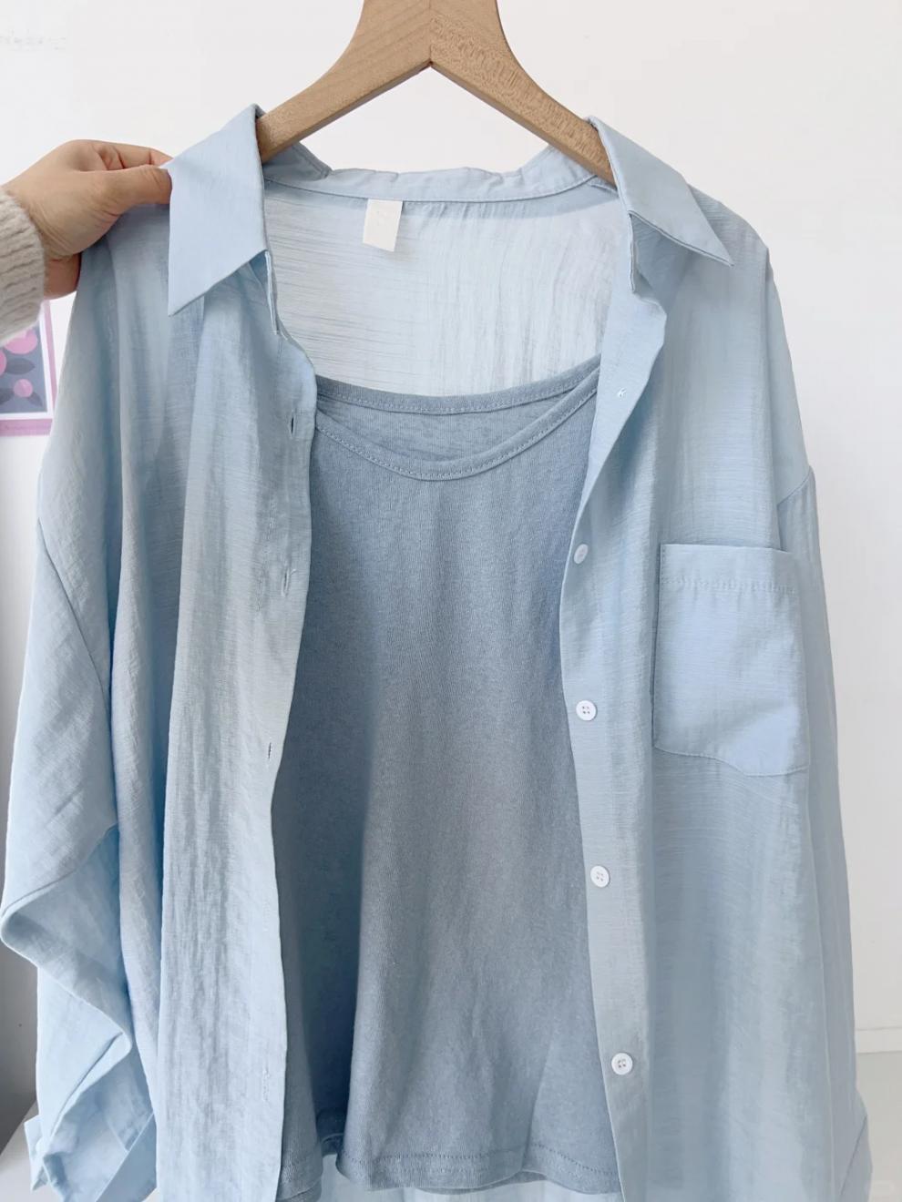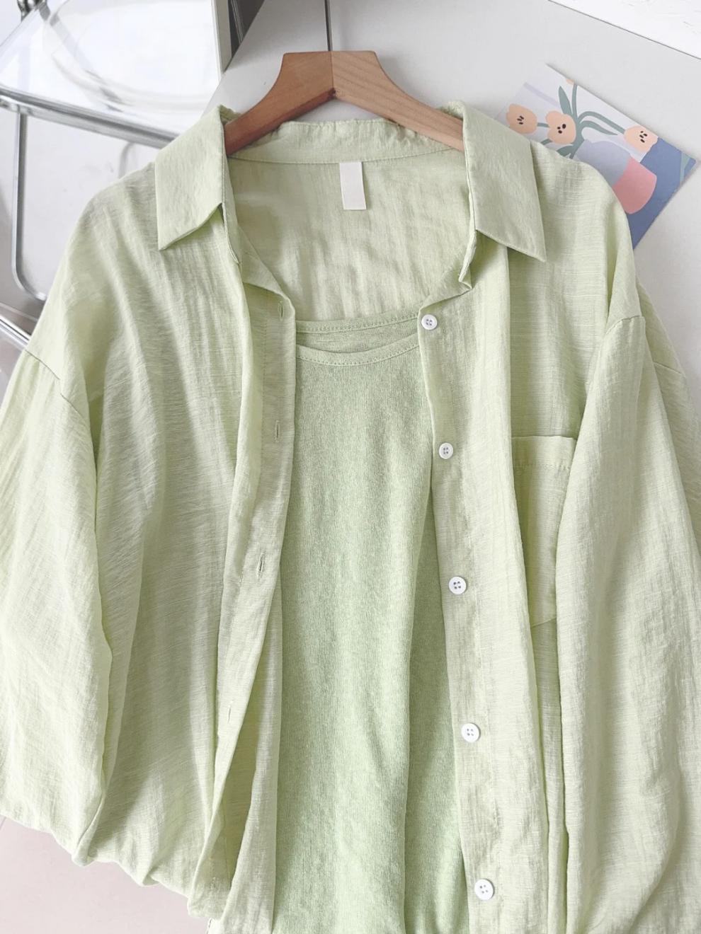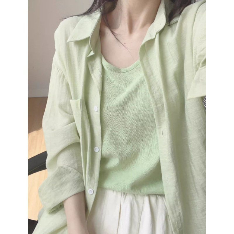 블루 코튼 리넨 긴팔 선 스크린 셔츠 여성용 재킷 여름 얇은 슬리밍 느슨한 캐주얼 폴로 칼라 리넨 셔츠스토어 가기