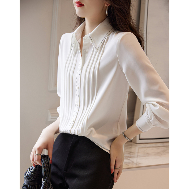 흰색 수직 스트립 주름 긴 소매 셔츠 여성의 느슨한 우아한 간단한 디자인 틈새 셔츠 최고 여성의 가을 2023스토어 가기