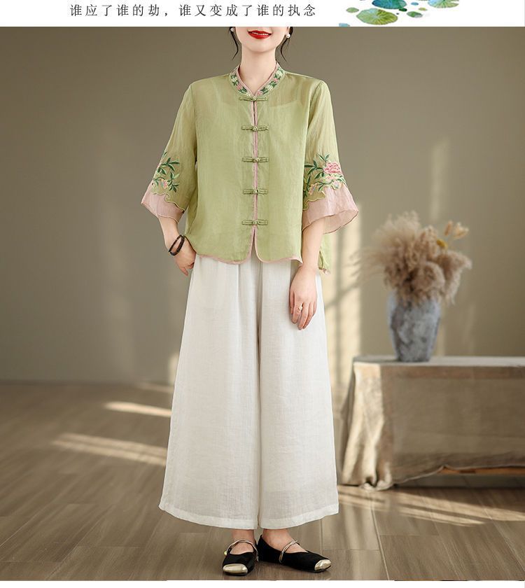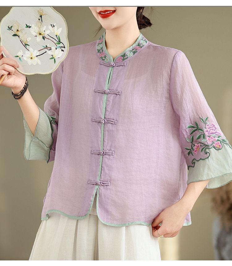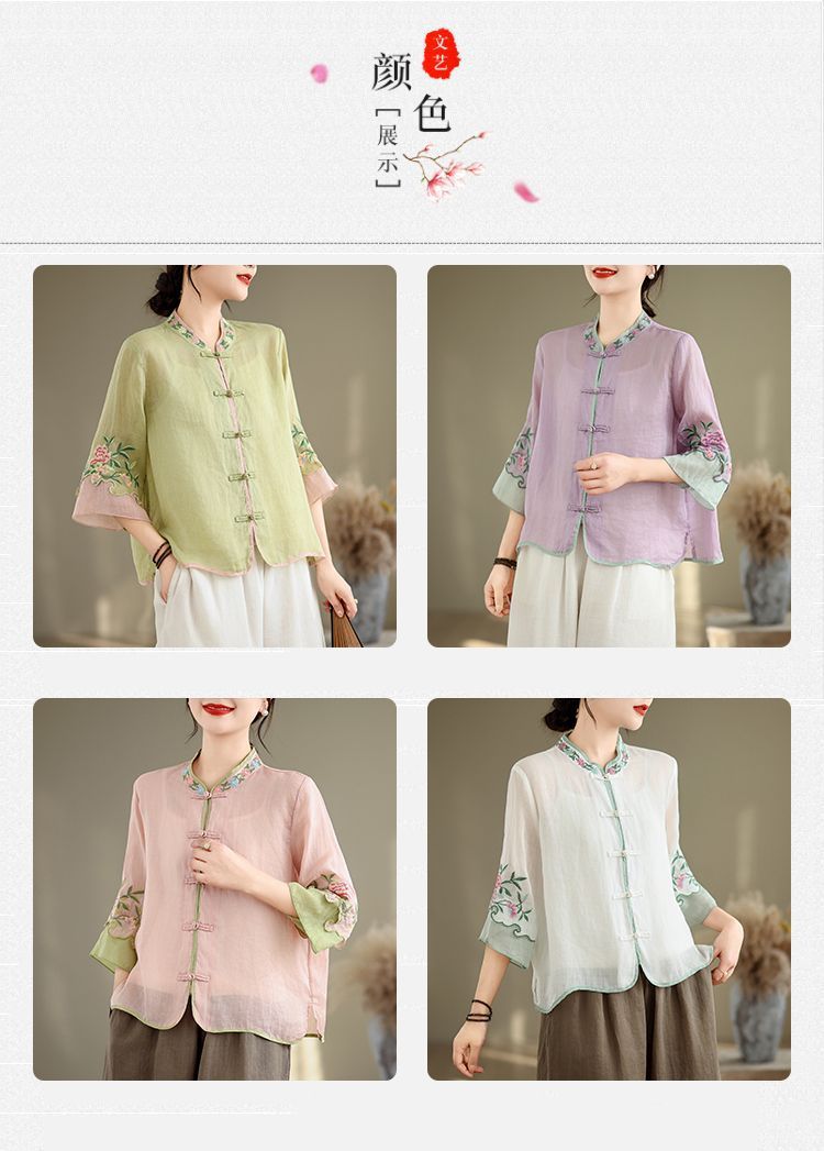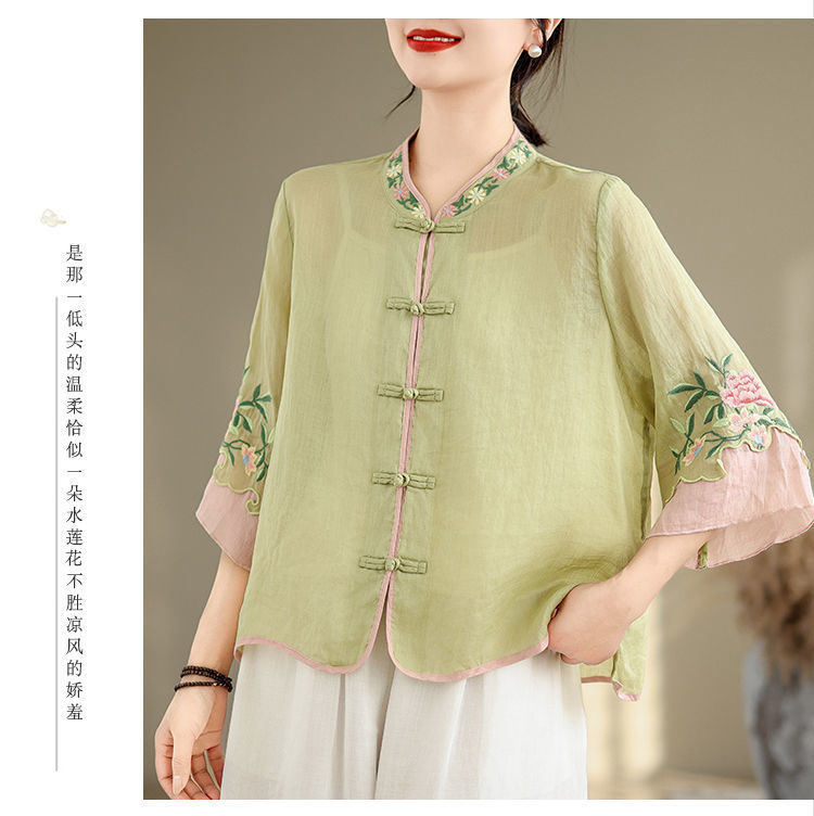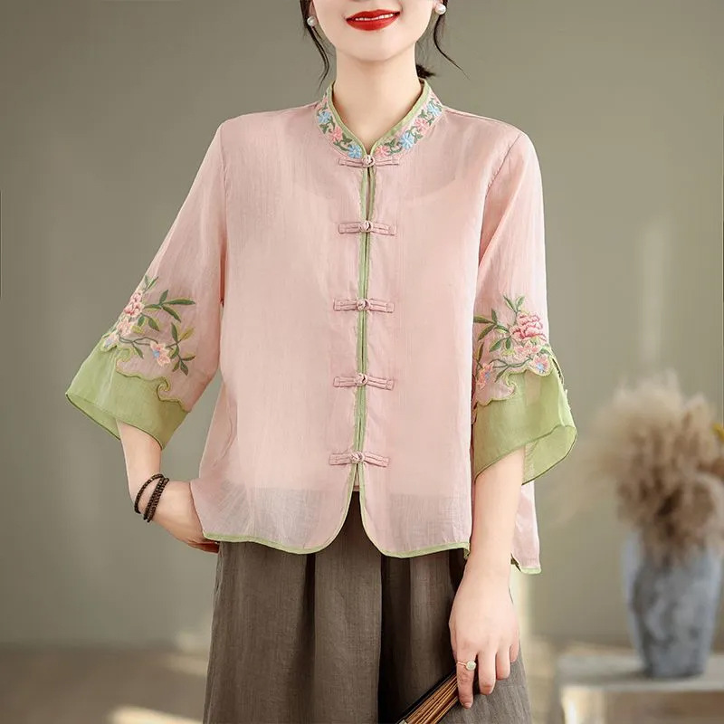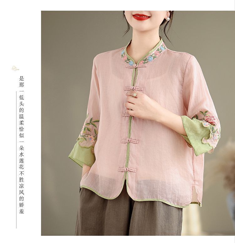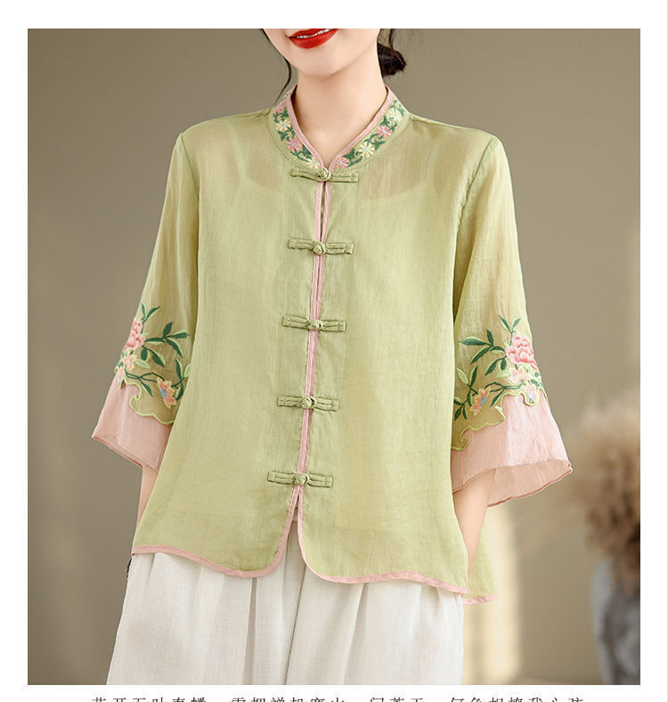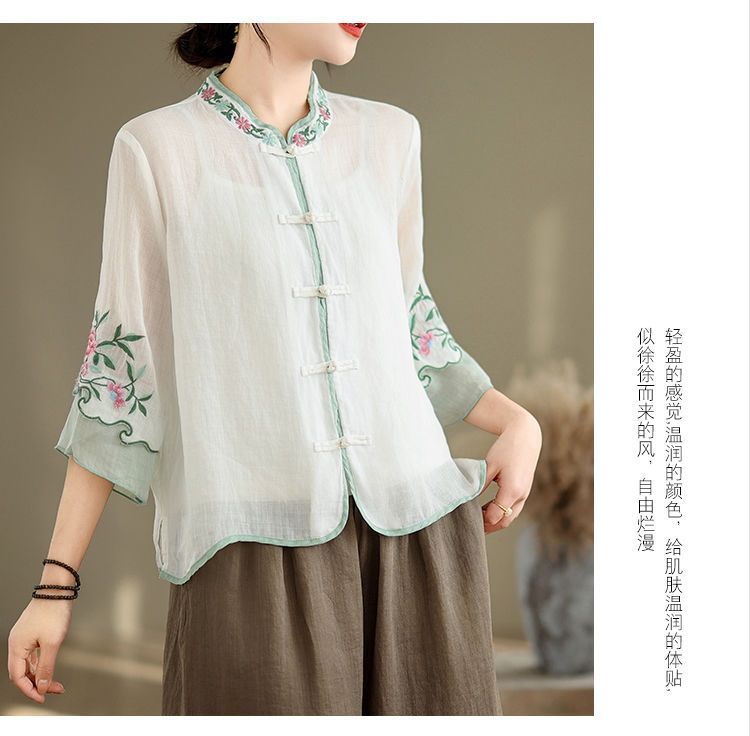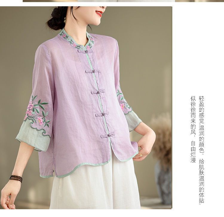 면과 린넨 새로운 여름 복고풍 민족 스탠드 칼라 자수 셔츠 여성 복고풍 버튼 컬러 매칭 7부 소매 탑 루즈