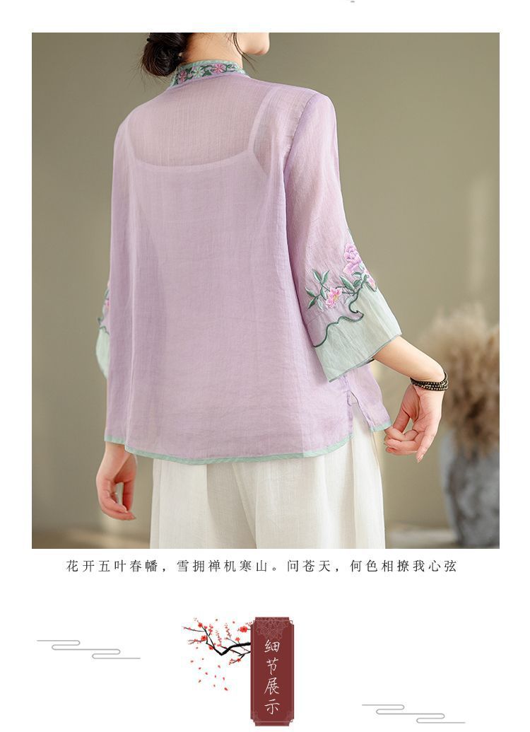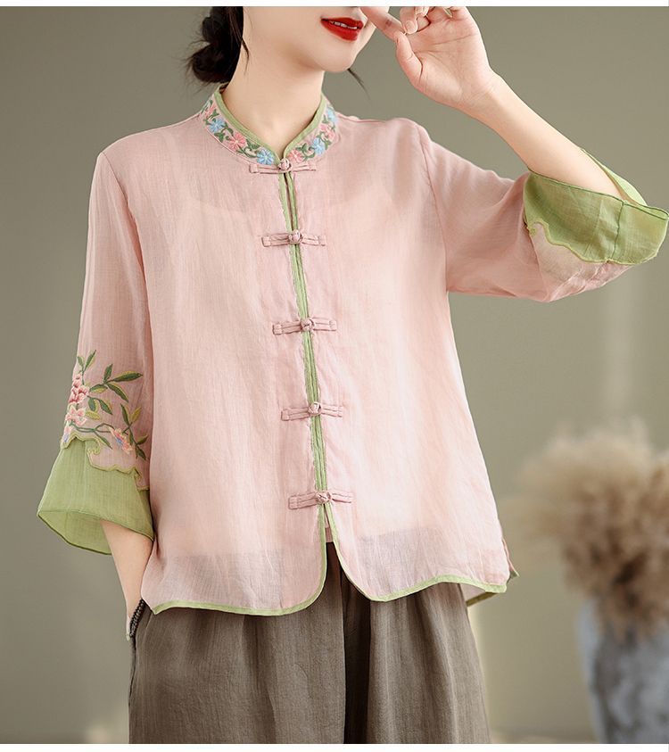 면과 린넨 새로운 여름 복고풍 민족 스탠드 칼라 자수 셔츠 여성 복고풍 버튼 컬러 매칭 7부 소매 탑 루즈스토어 가기