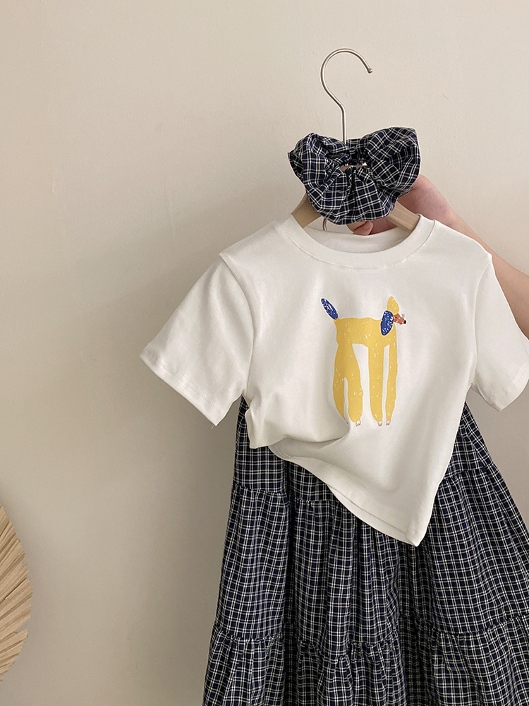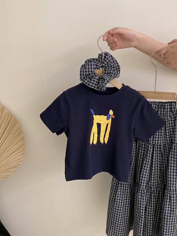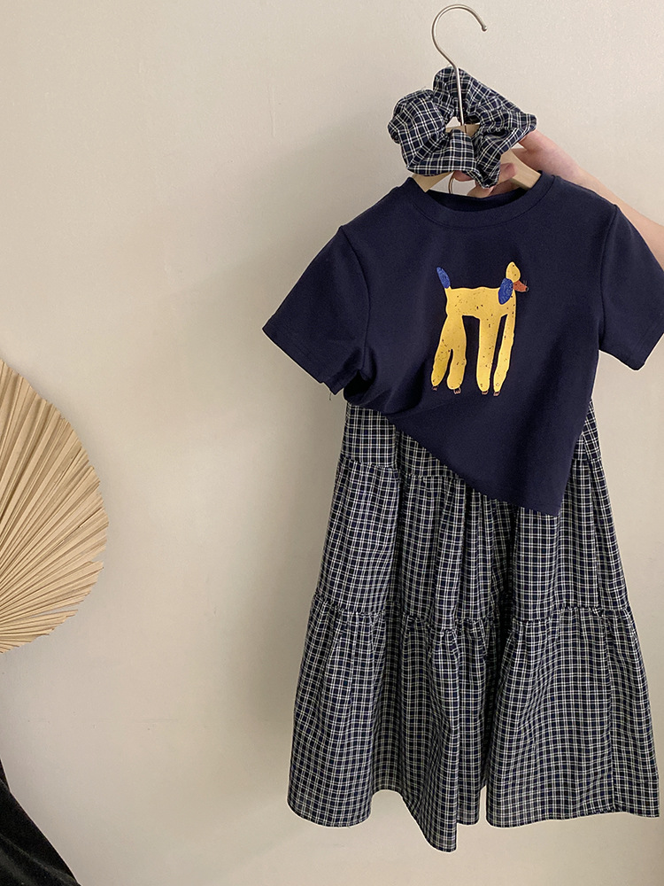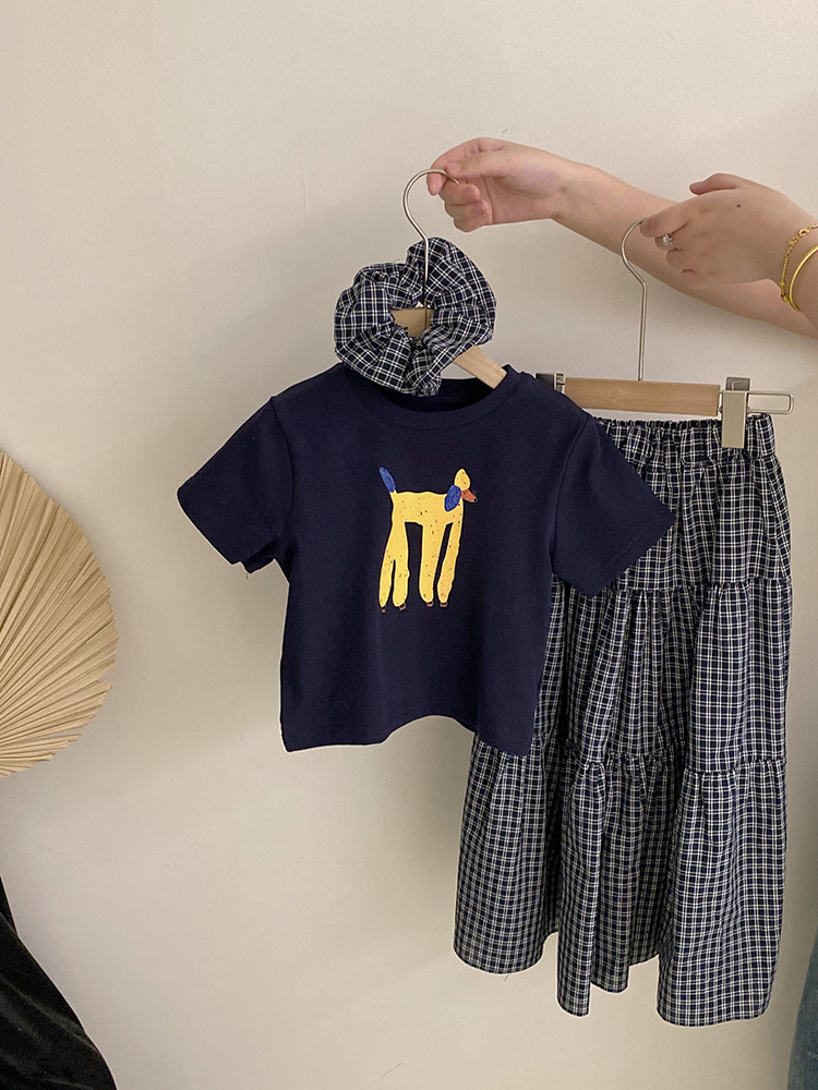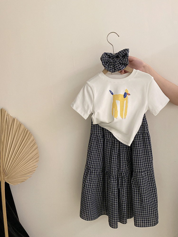 여자 한국식 여름 만화 인쇄 라운드 넥 반팔 티셔츠 여자 2025 올 매치 체크 무늬 투피스 유행 스커트스토어 가기