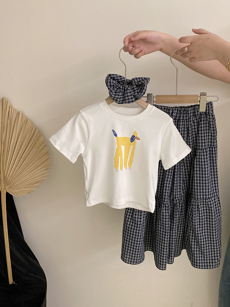 여자 한국식 여름 만화 인쇄 라운드 넥 반팔 티셔츠 여자 2025 올 매치 체크 무늬 투피스 유행 스커트