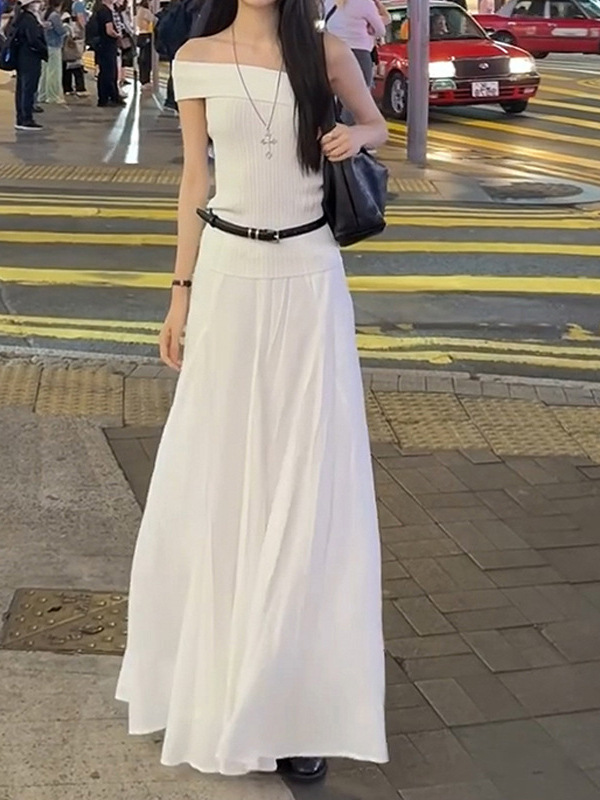 히비스커스 여름 디자인 세트 프랑스 홀리데이 스타일 오프 숄더 화이트 탑 스커트 세트 벨트