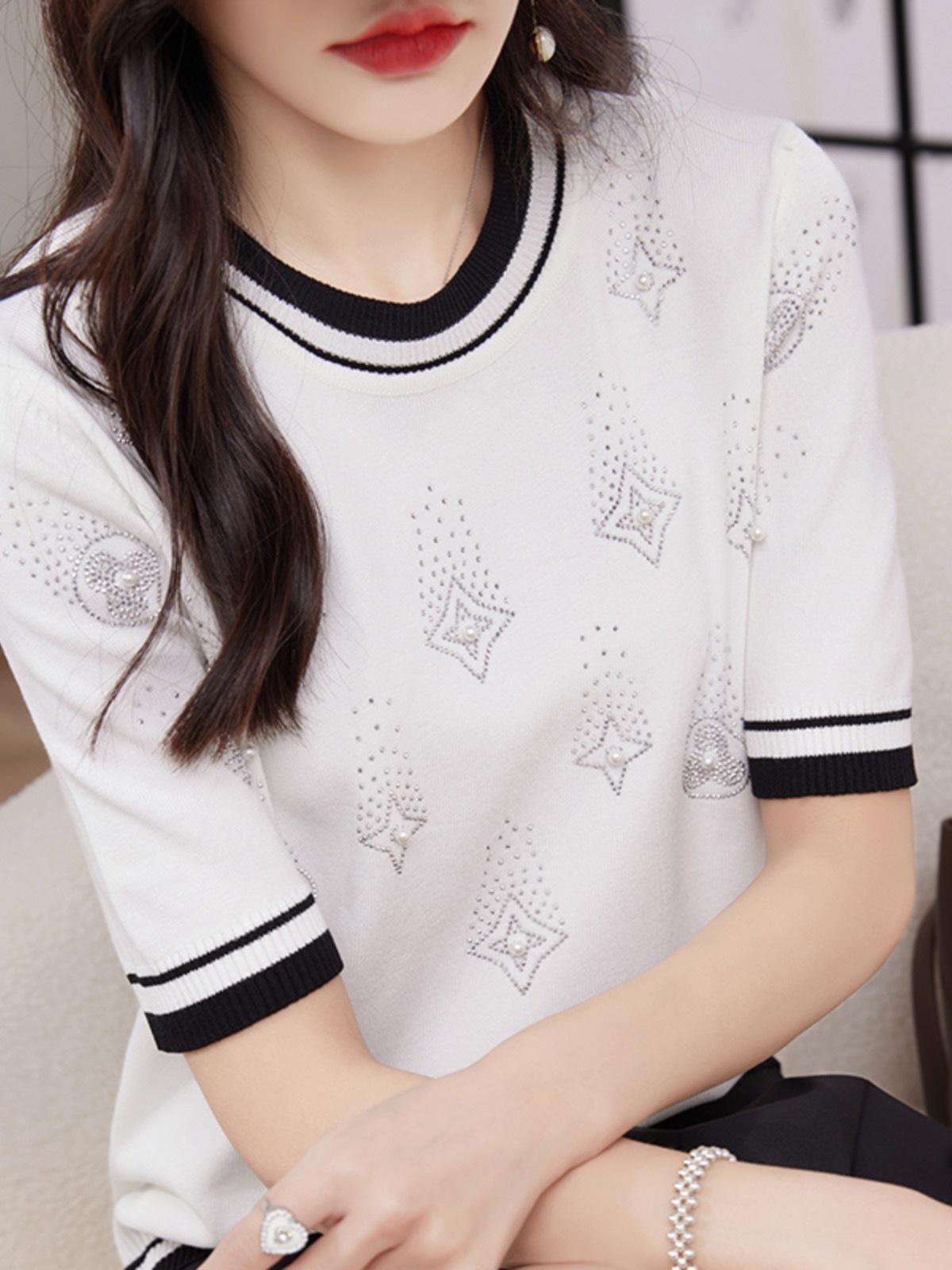 한국식 패션 핫 드릴링 아이스 실크 라운드 넥 티셔츠 여성 여름 새로운 슬림 컬러 블록 반팔 얇은 니트 탑스토어 가기