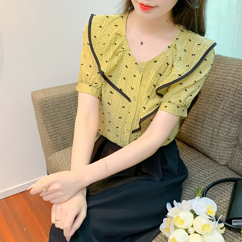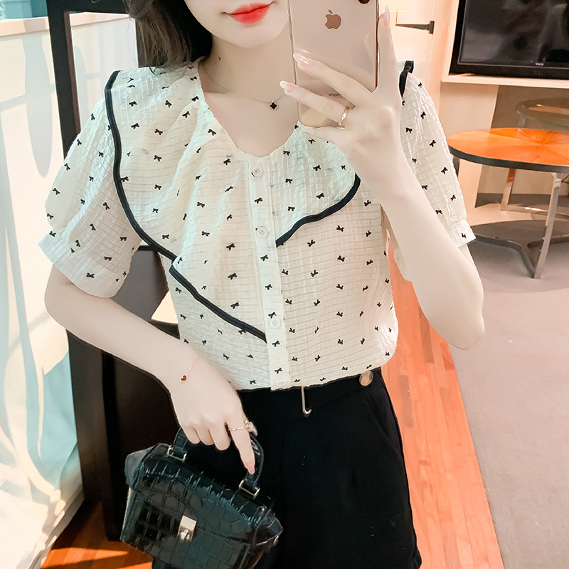 时尚衬衫女夏2023新款气质百搭圆领荷叶边拼接设计感印花短袖上衣스토어 가기
