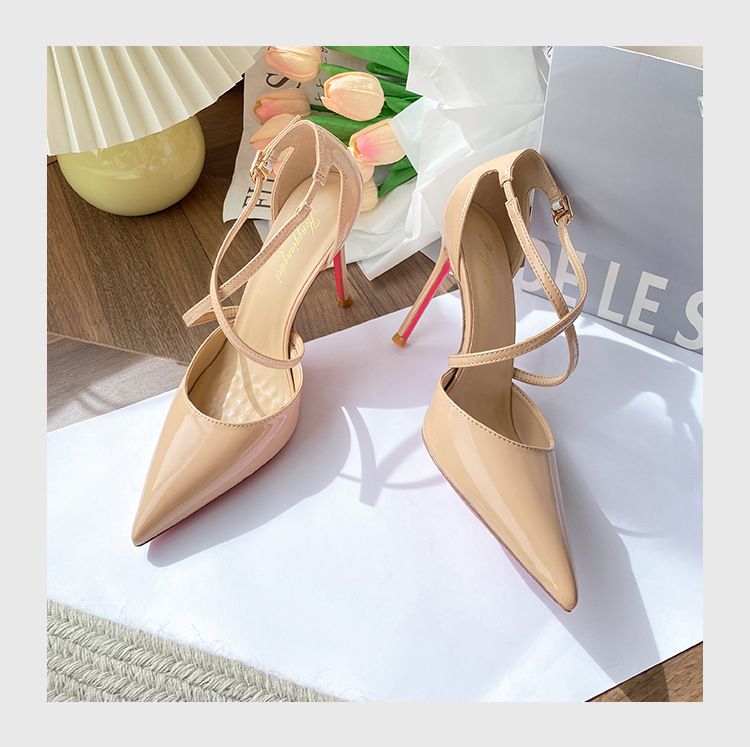 여성용 누드 하이힐, 스틸레토 힐, 2025년 신상 여름 섹시 로얄 자매 크로스 스트랩 포인티드 토 레드 바닥 샌들