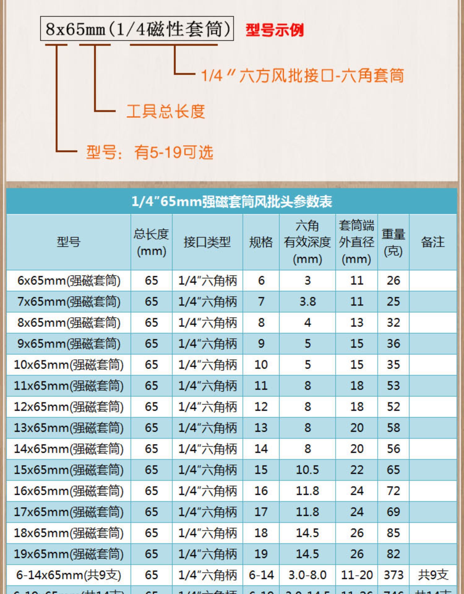 • 6-14x65mm(1/4 자기 슬리브 9개)