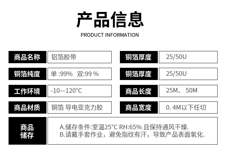 • 폭 50mm*길이 25m(자체 접착식 및 고온 저항성), 동박 테이프(기존 이중 도체 두께 0.05)