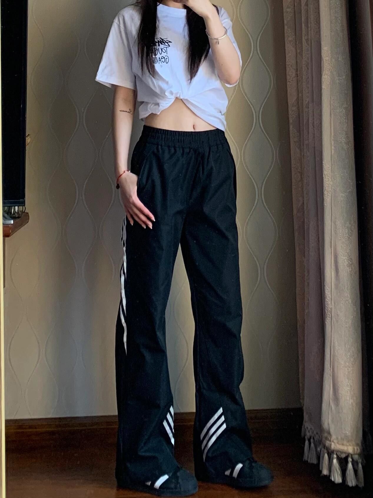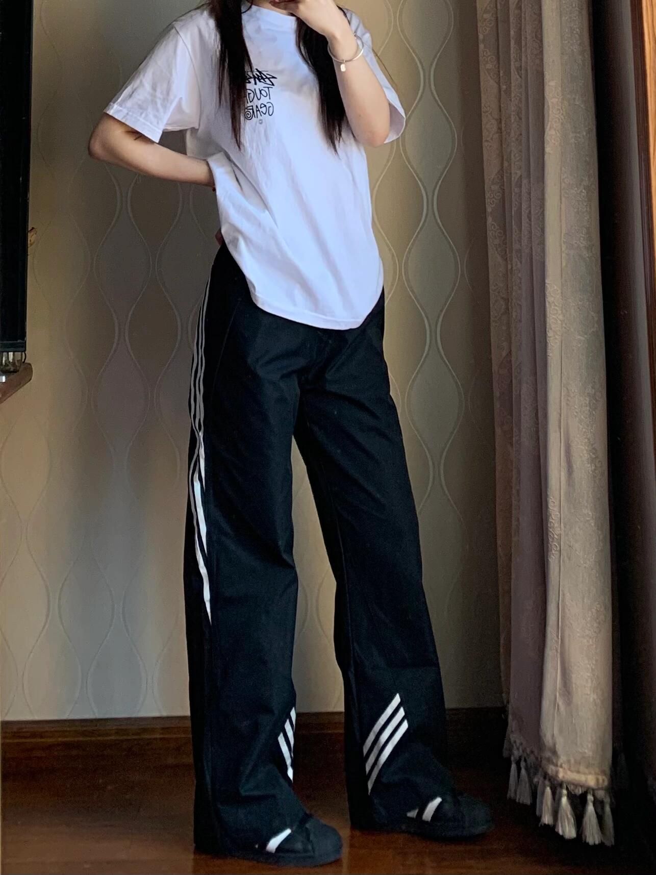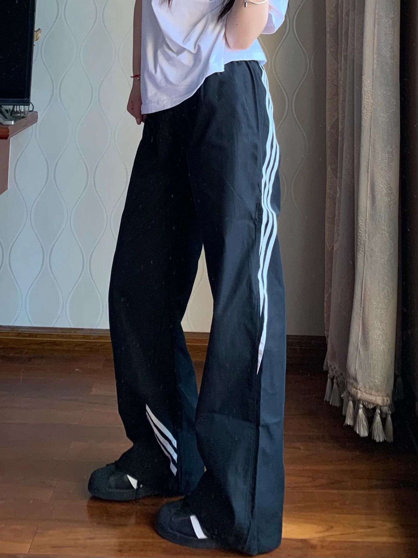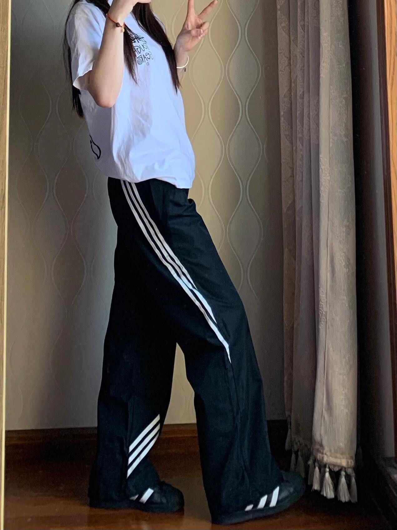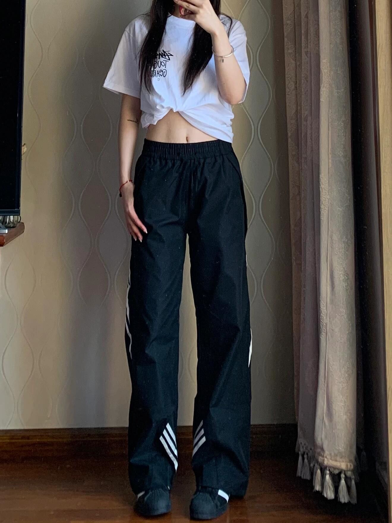 여름 여성을 위한 미국식 기능성 3줄 스트라이프 팬츠, 얇은 학생 한국식 캐주얼 스포츠 와이드 레그 롱 팬츠 블랙스토어 가기