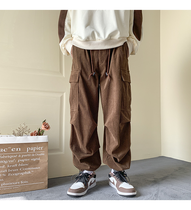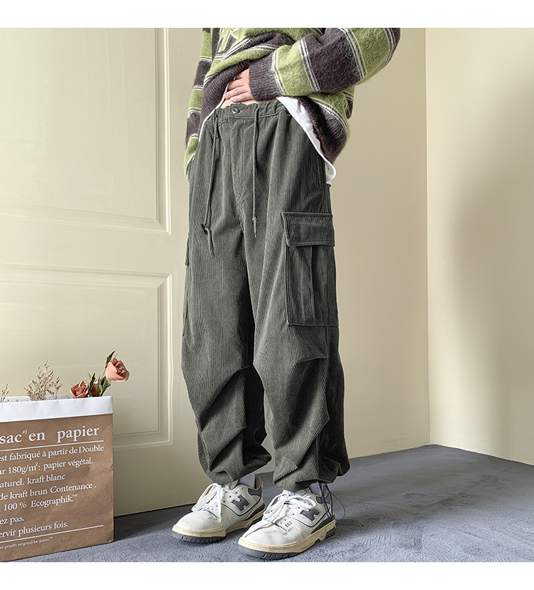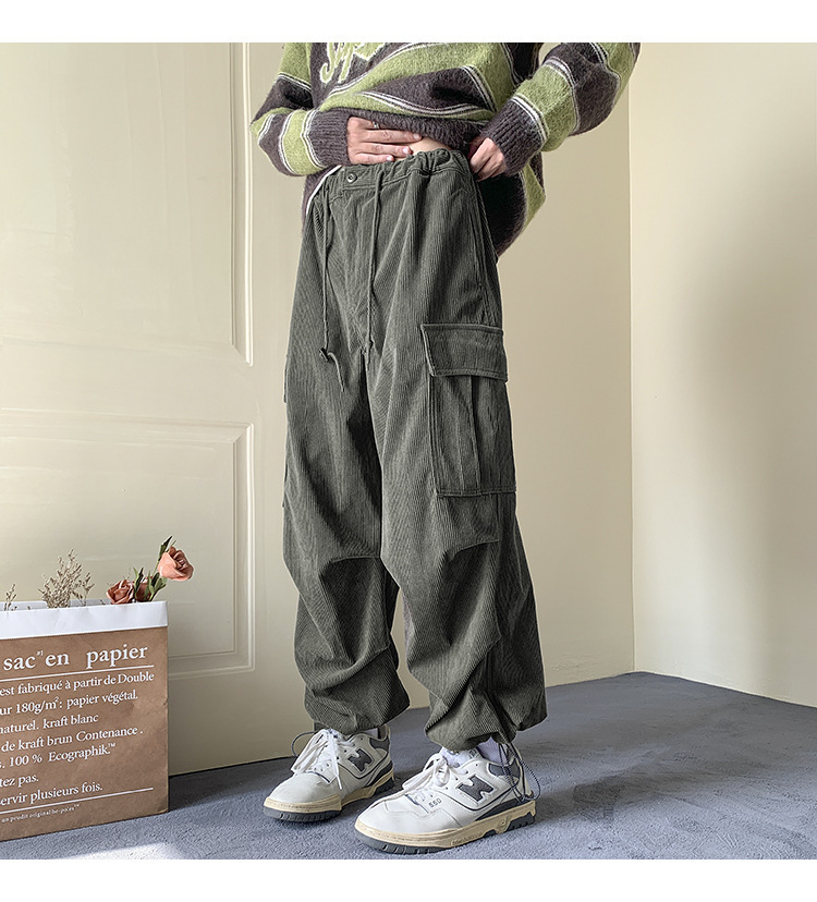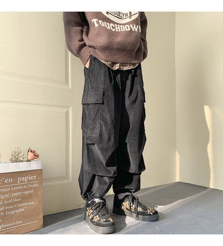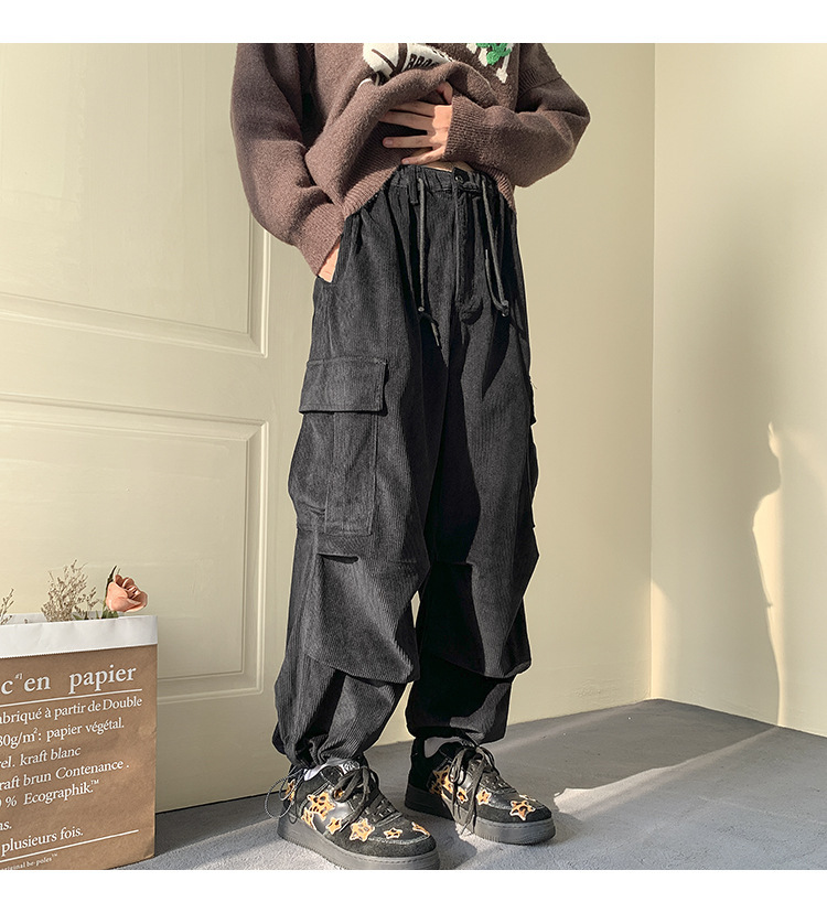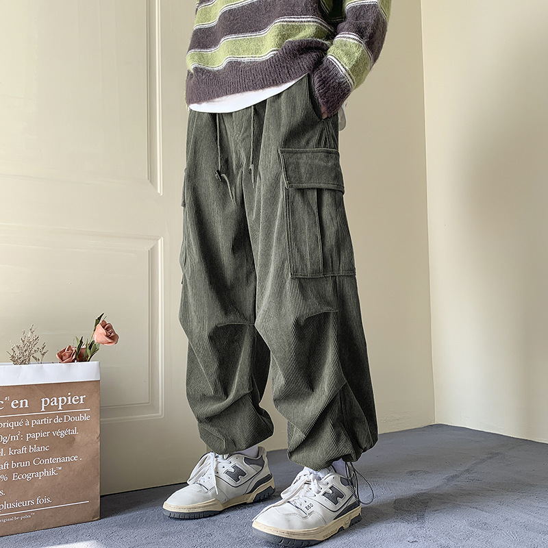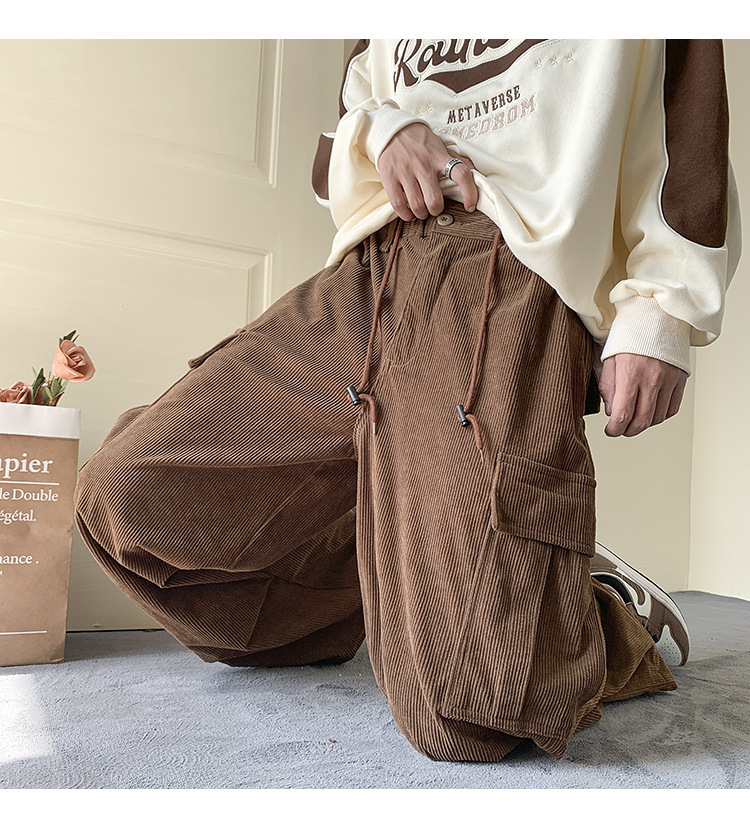 Corduroy 바지 남자의 두꺼운 미국 스타일 복고풍 큰 포켓 다리 오버롤 가을과 겨울 드로우 스트링 느슨한 캐주얼 바지