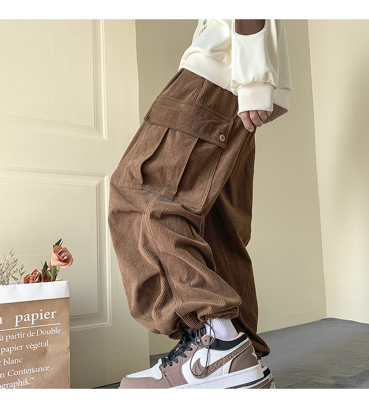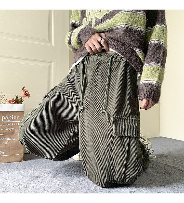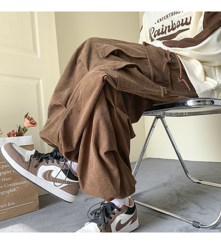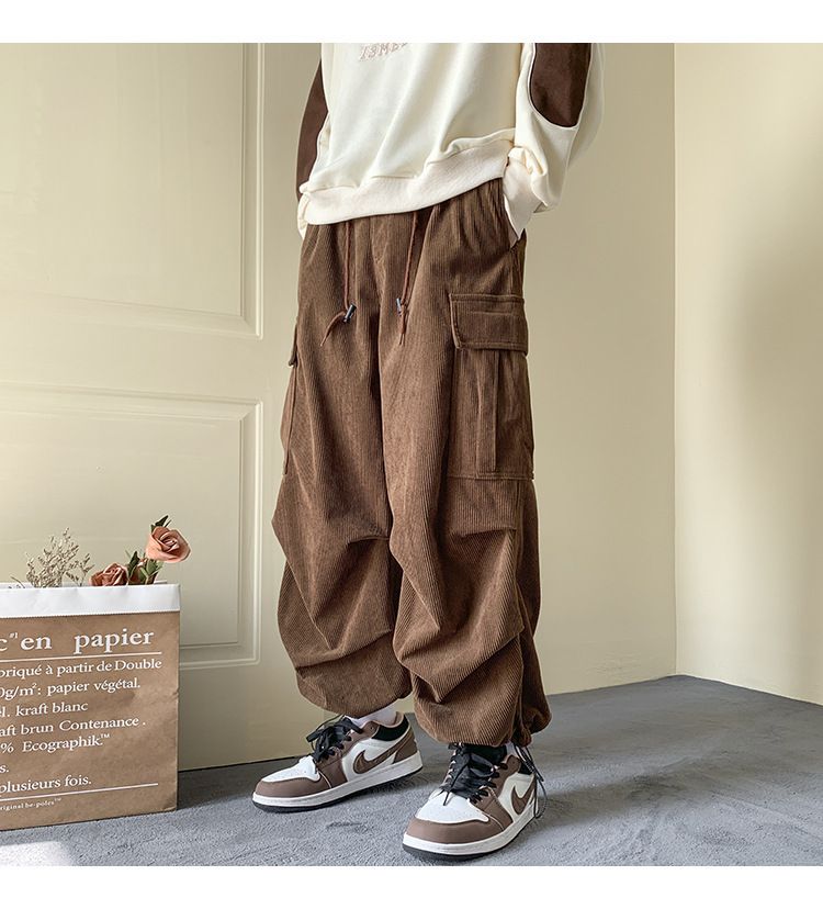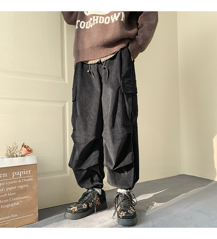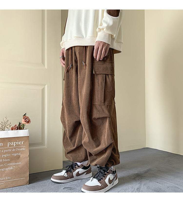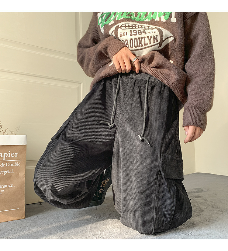 Corduroy 바지 남자의 두꺼운 미국 스타일 복고풍 큰 포켓 다리 오버롤 가을과 겨울 드로우 스트링 느슨한 캐주얼 바지