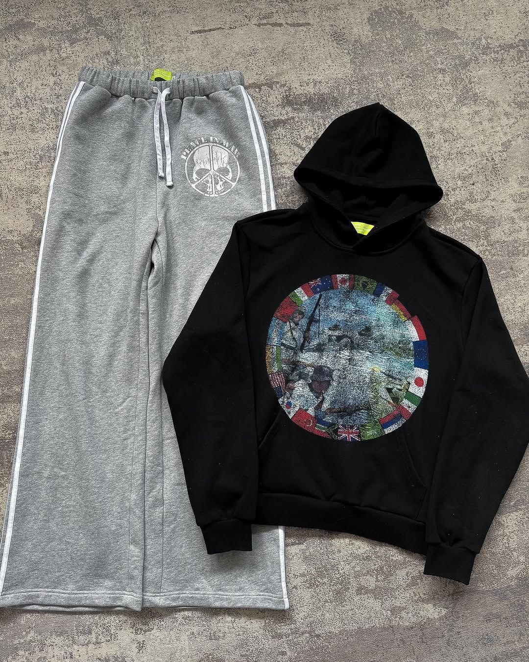 유럽과 미국의 도매 맞춤형 프린트 스웨트 셔츠와 스웨트 팬츠 긴팔 풀오버 후드 슈트 복고풍 재킷 스트리트 트렌드