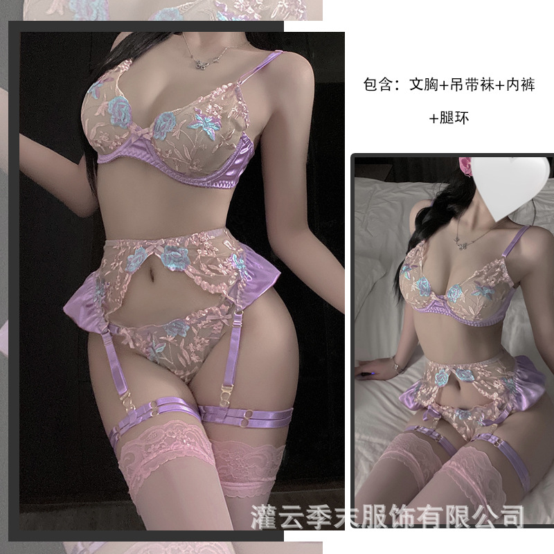시즌말 아름다운 순수한 욕망 스타일의 무거운 꽃 자수 시스루 섹시 속옷, 다리 링 포함, 달콤한 4종 세트 7097