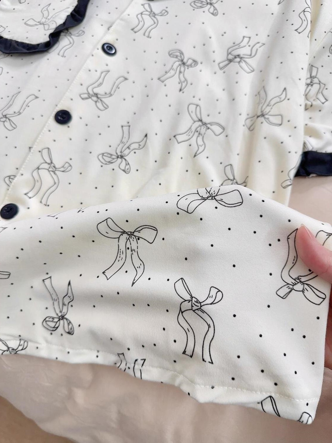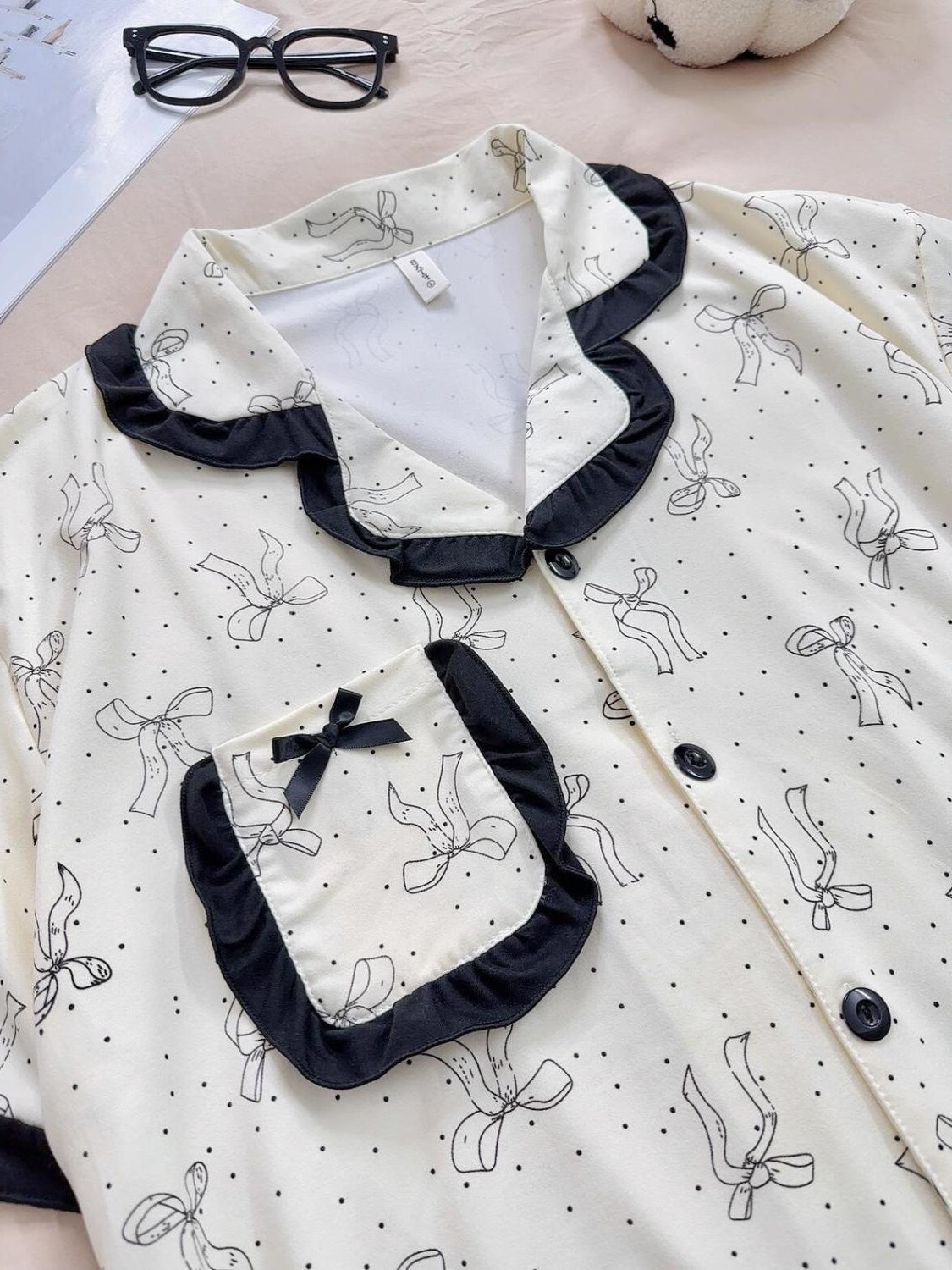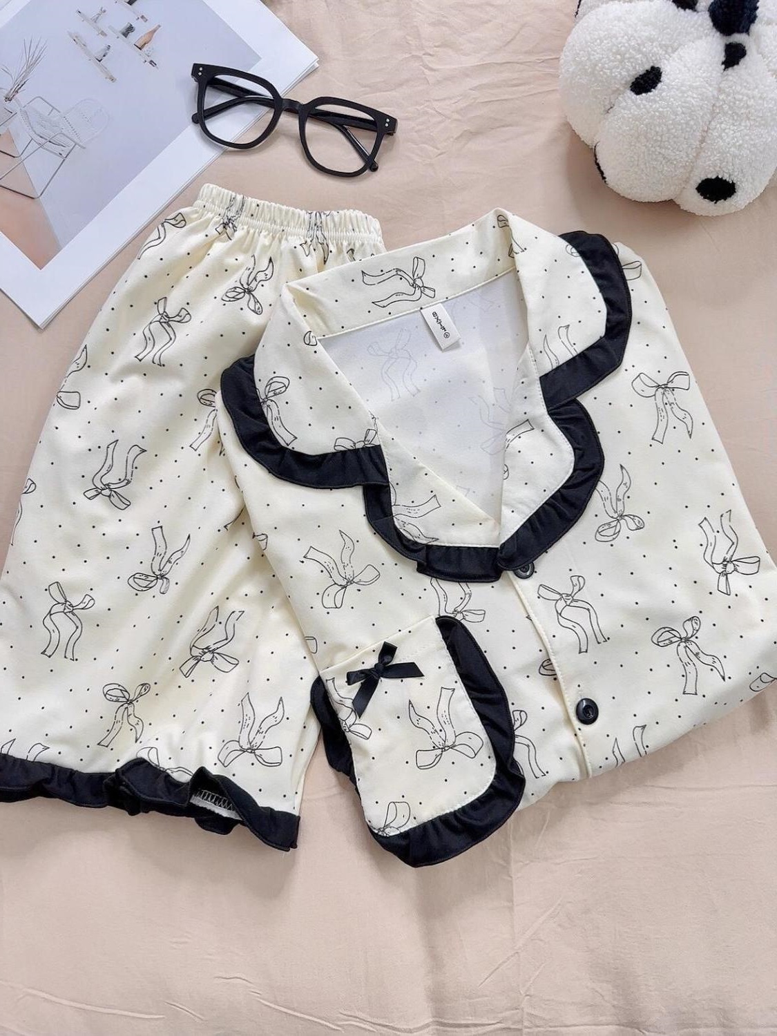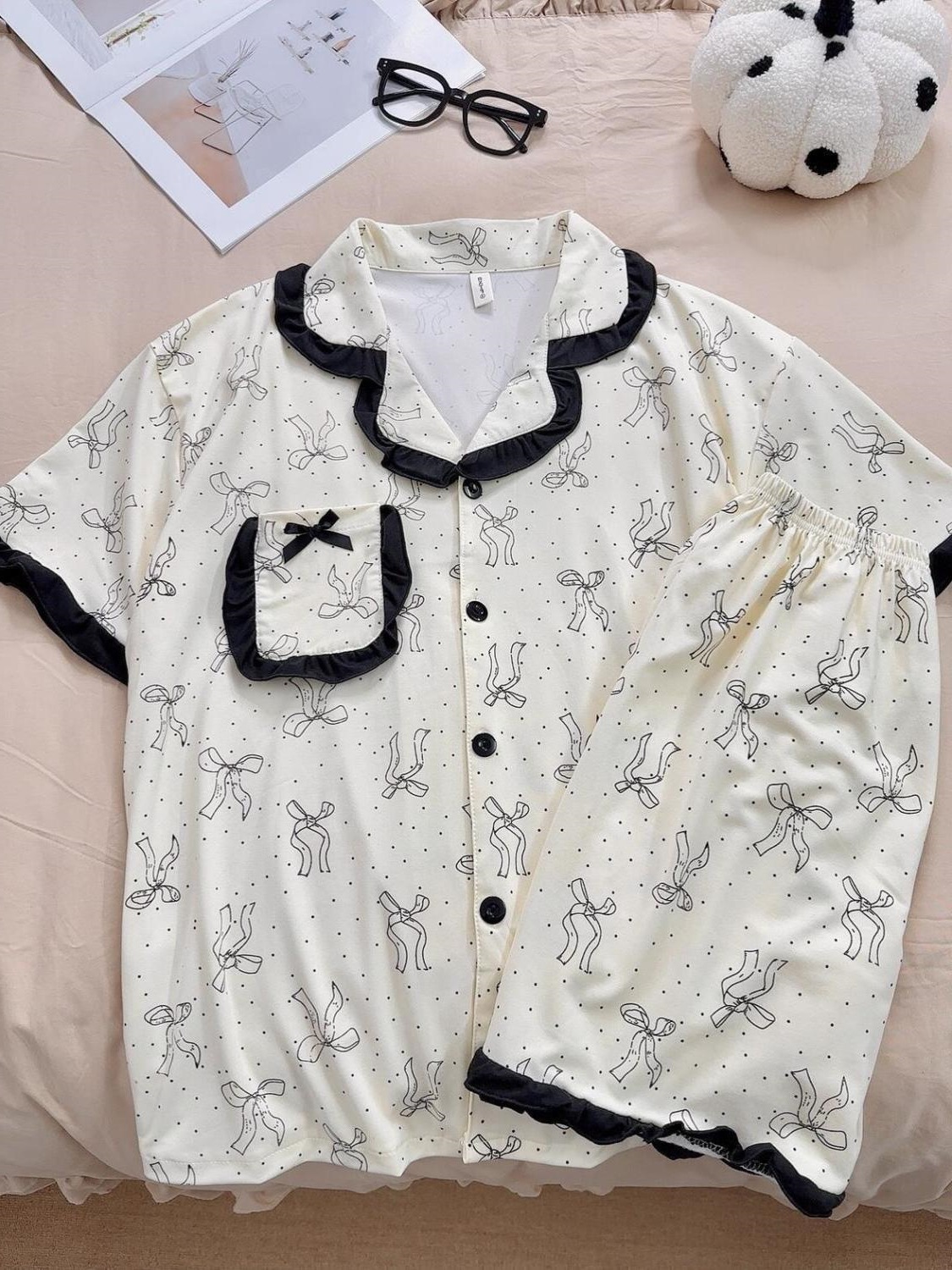 귀여운 활 파자마 여름 여성의 새로운 반팔 반바지 여름 한국 스타일 인터넷 유행 홈 의류 세트