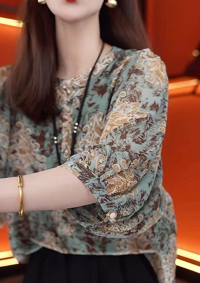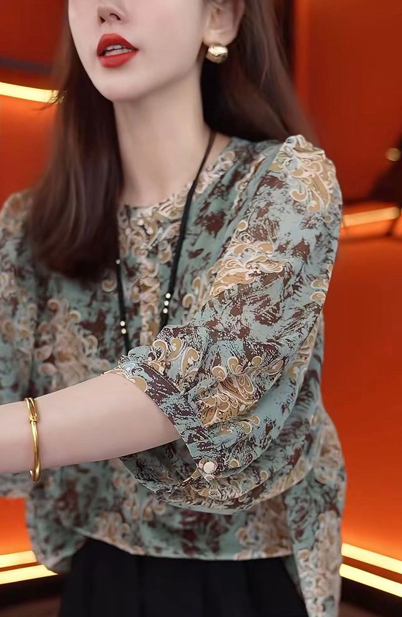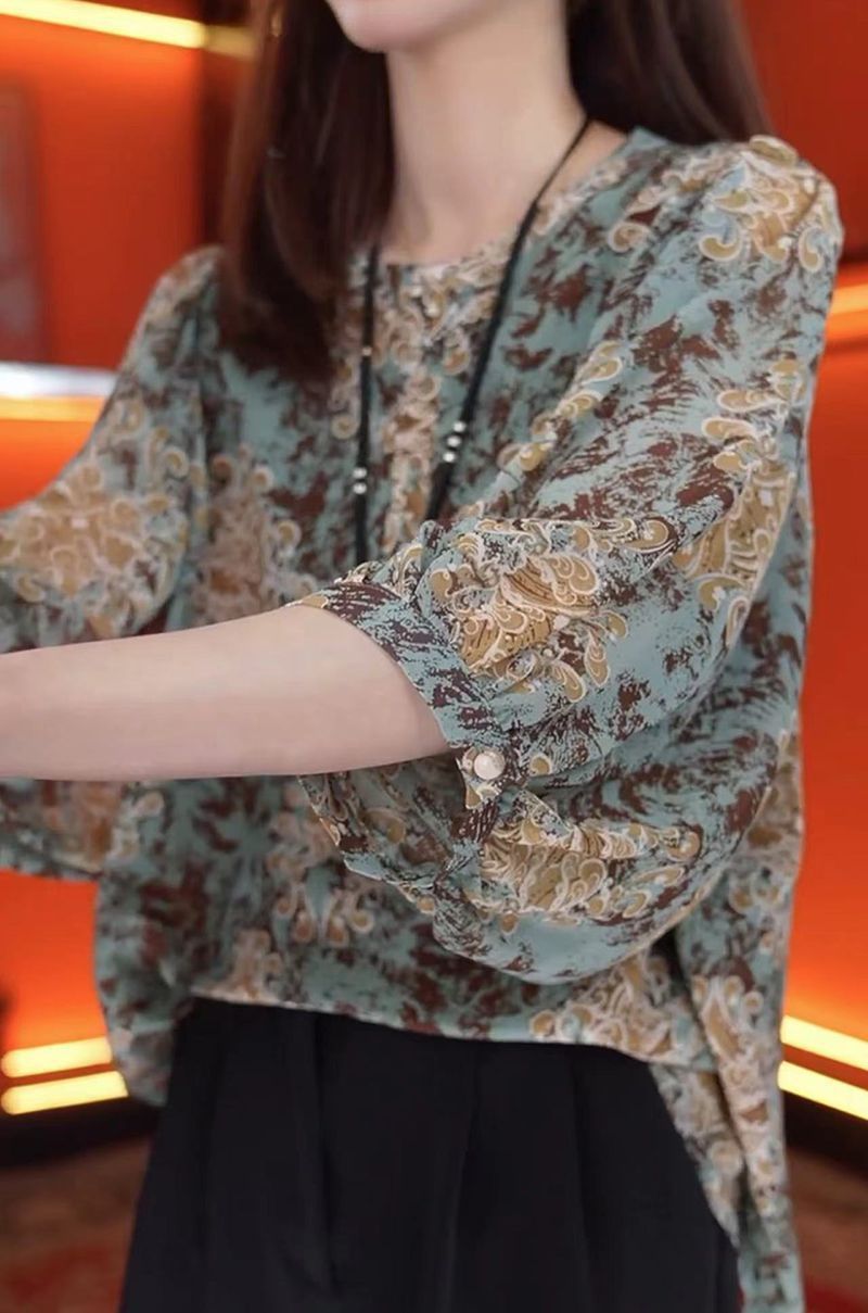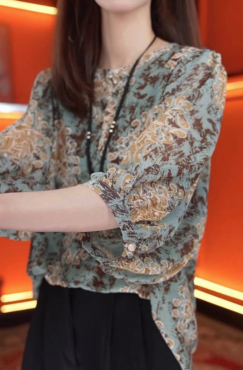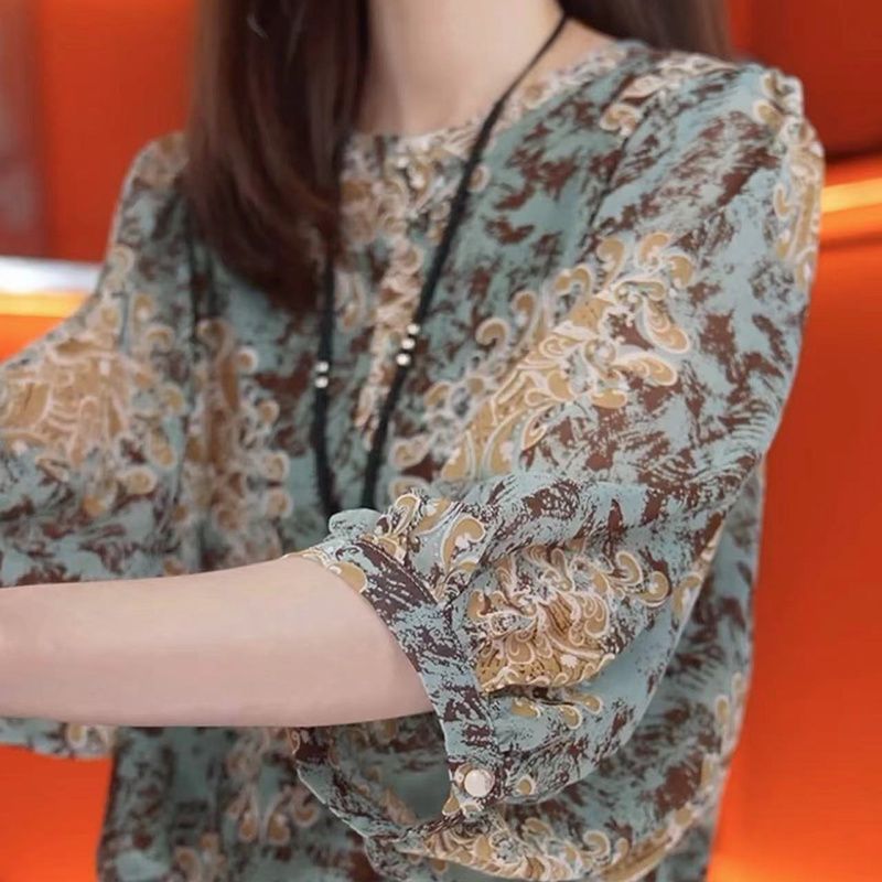 여름 여성을 위한 루즈하고 슬림한 7부 소매 스타일 쉬폰 셔츠 새로운 디자인 패셔너블한 프렌치 스타일 꽃무늬 라운드 넥 탑스토어 가기
